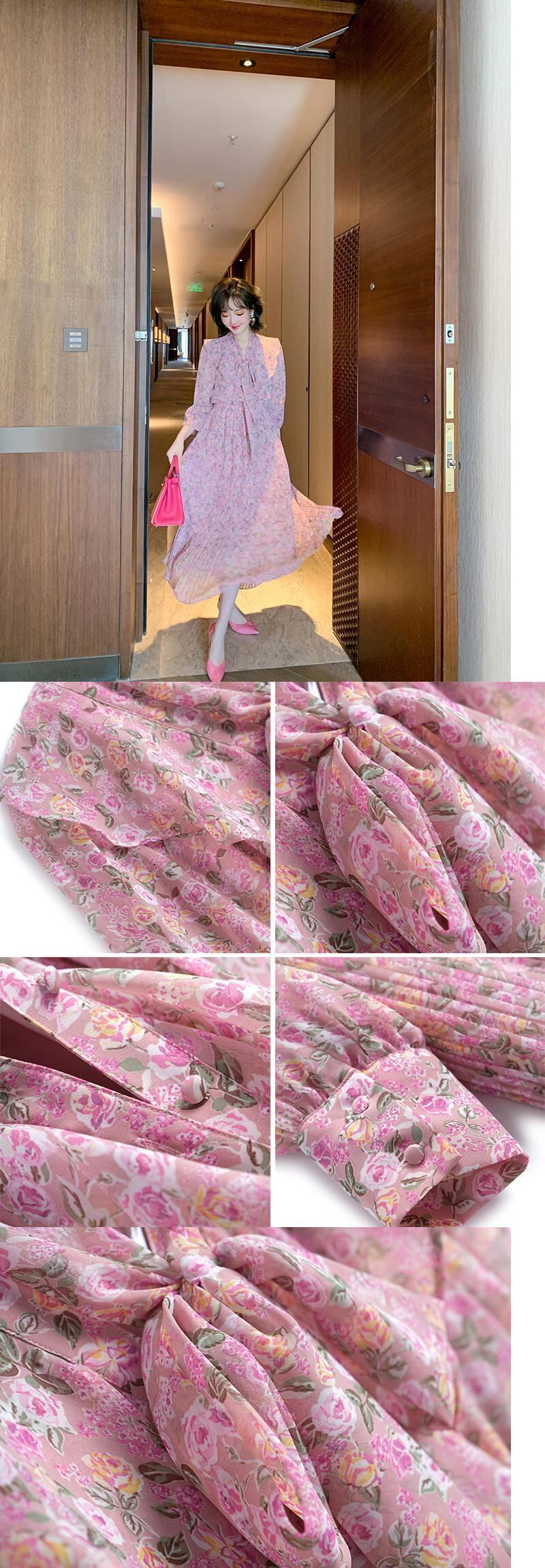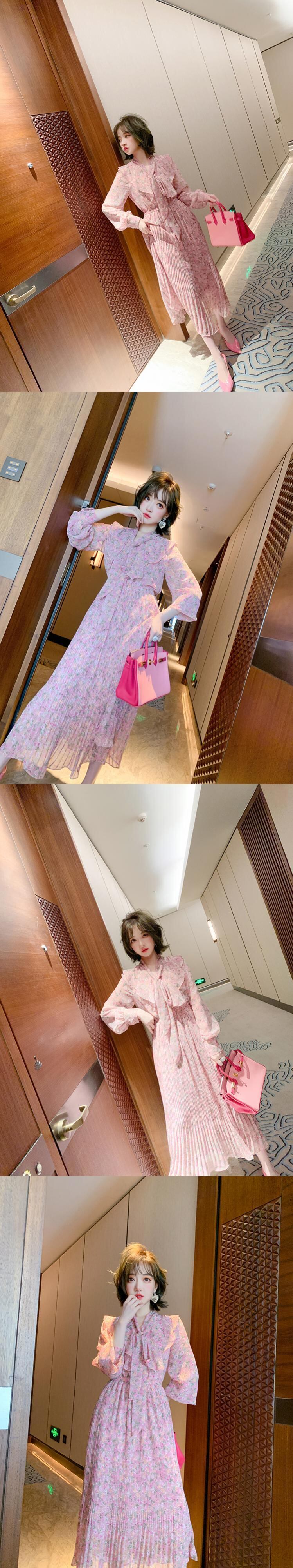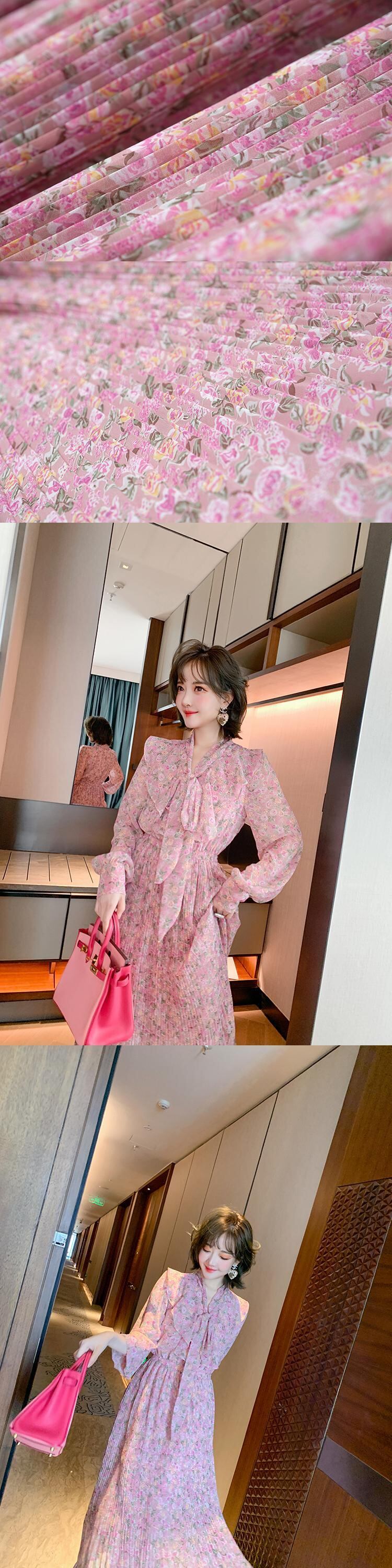プリント柄リボンハイウェストウェストプリーツドレス スプリング 春物 MIUCO40474981491