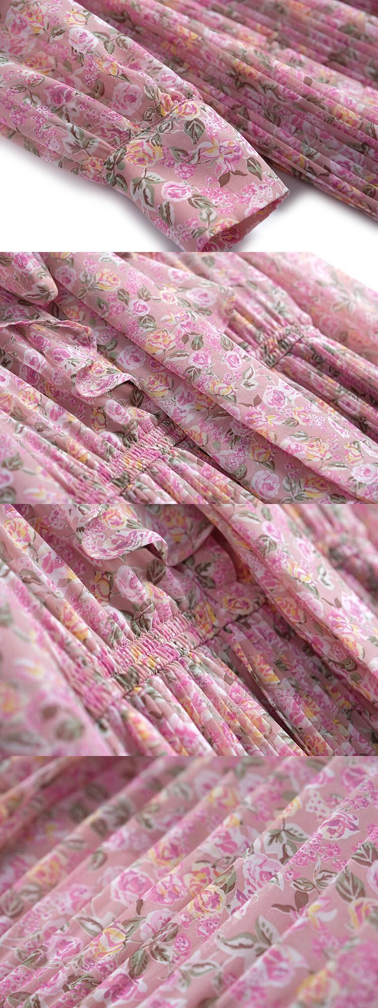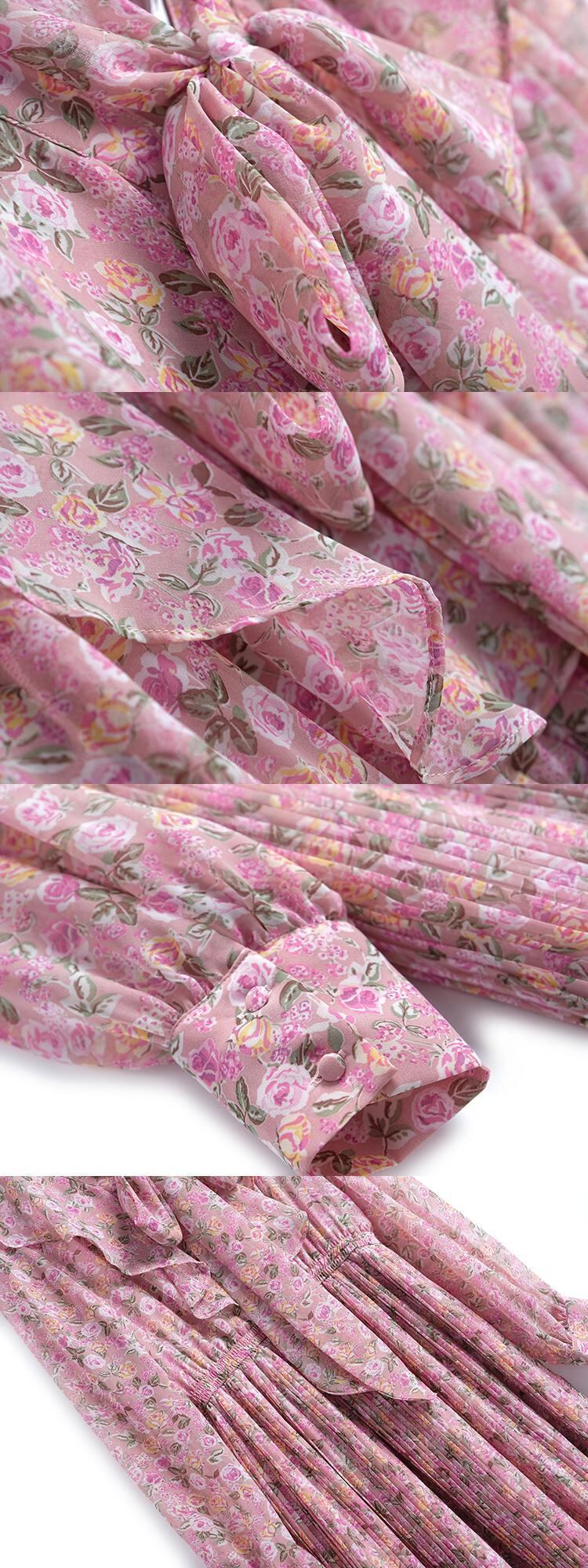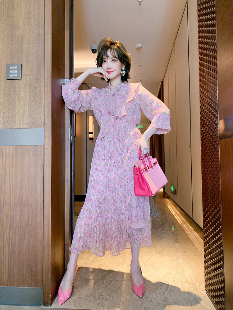 プリント柄リボンハイウェストウェストプリーツドレス スプリング 春物 MIUCO40474981491
