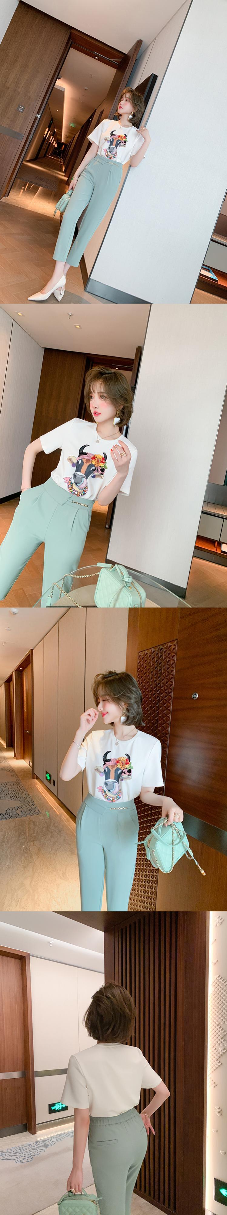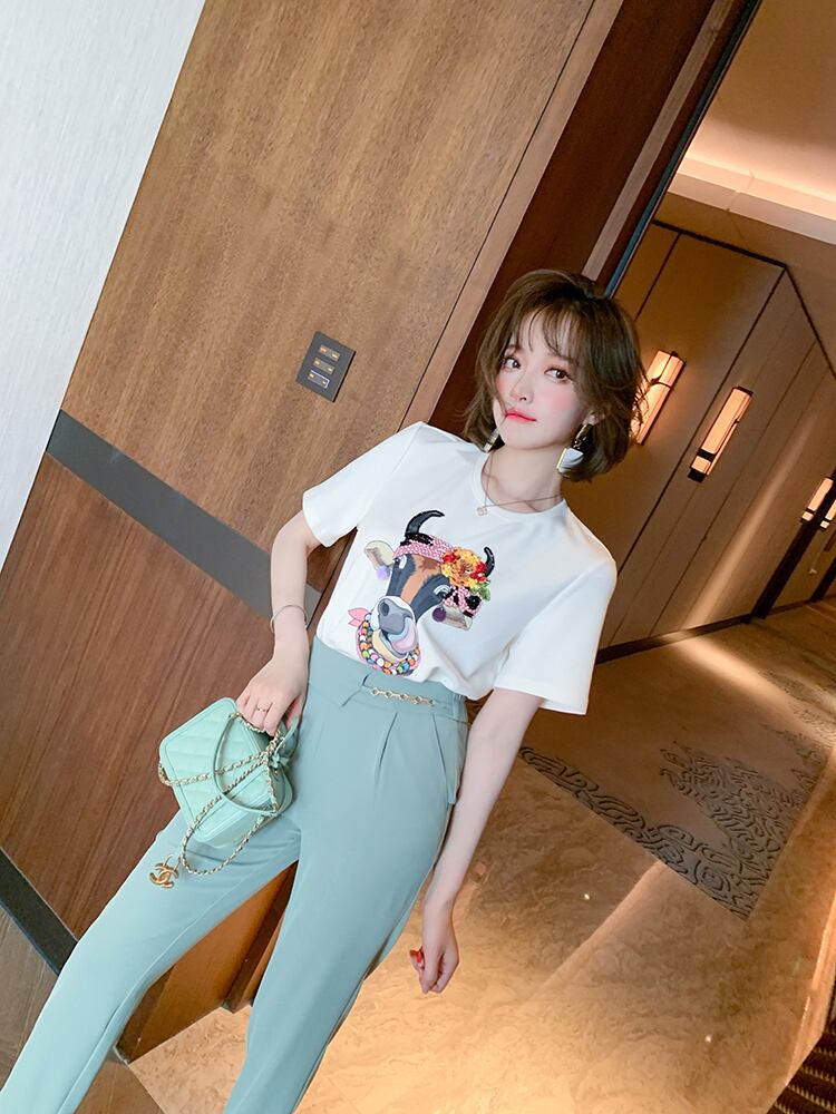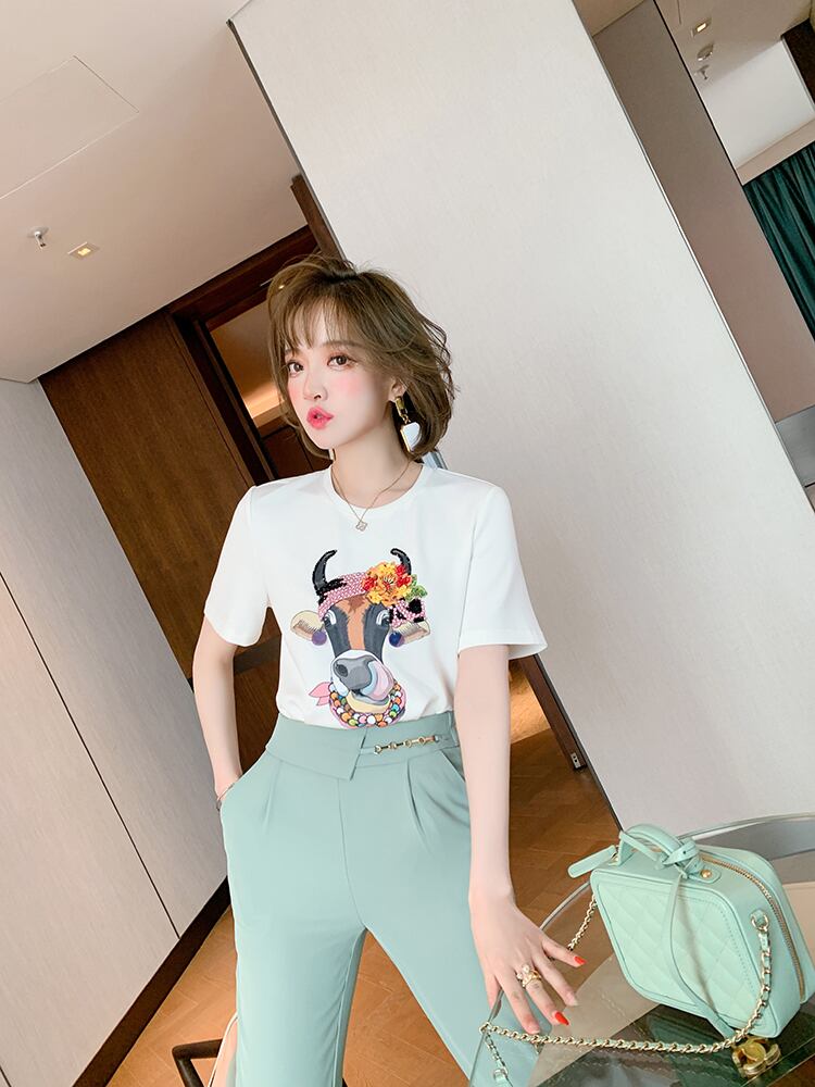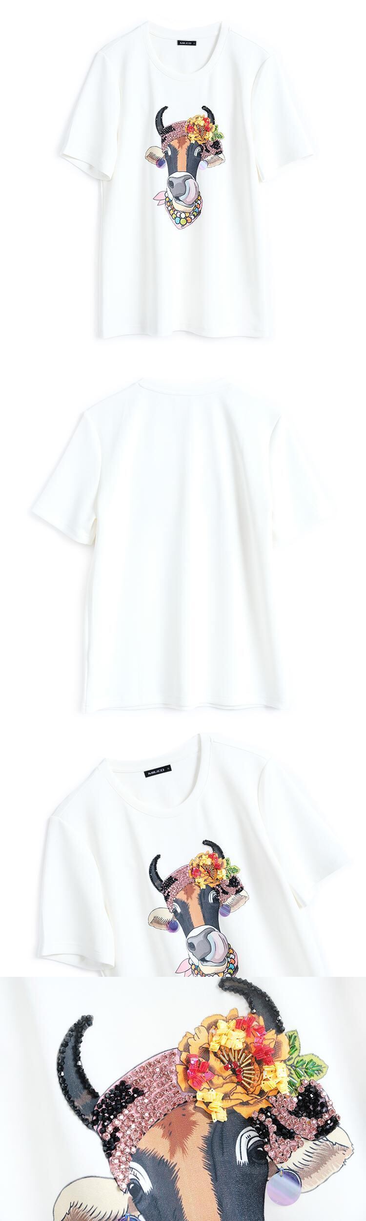 プリントラインストーンラウンドネックTシャツ スプリングサマー 春物 夏物 Oネック MIUCO99219366716
