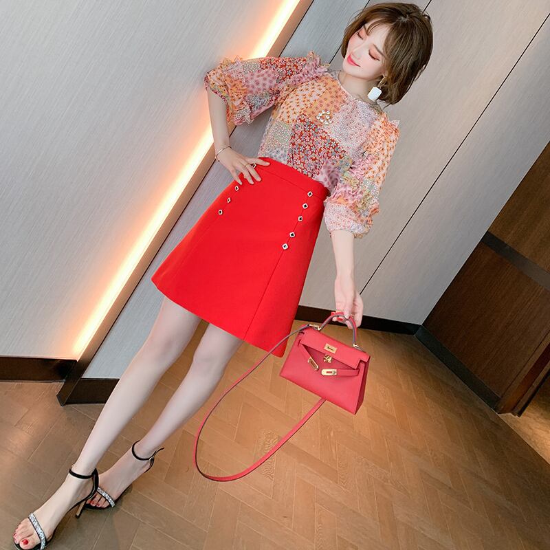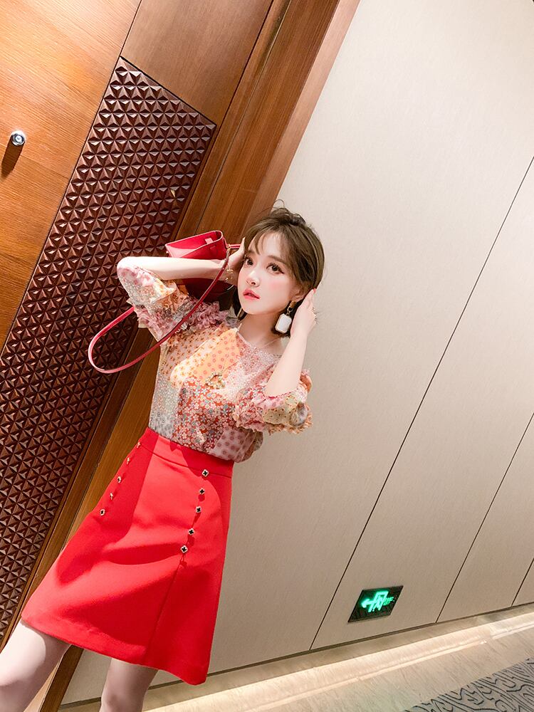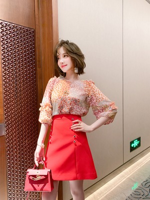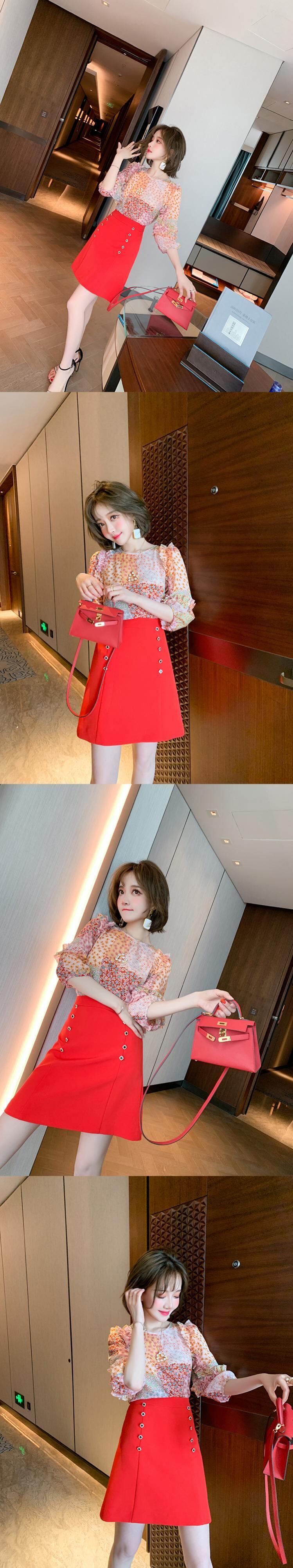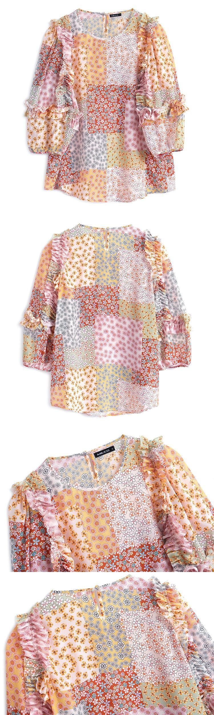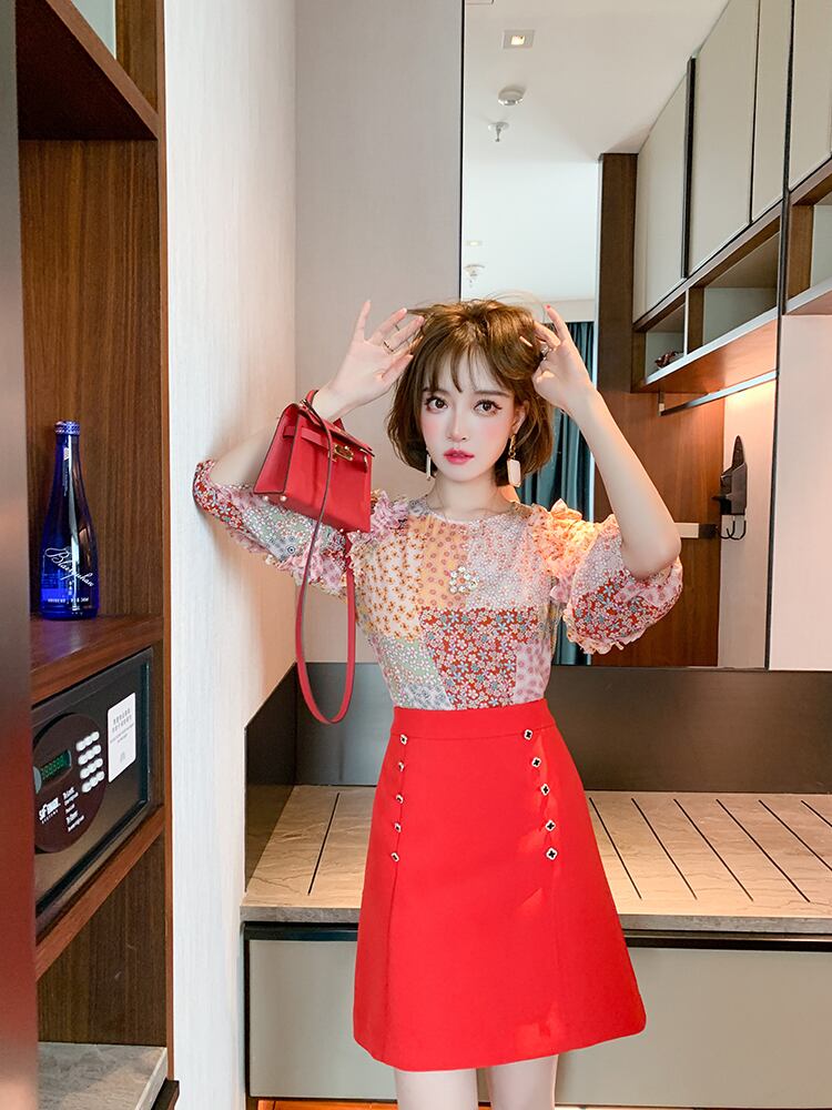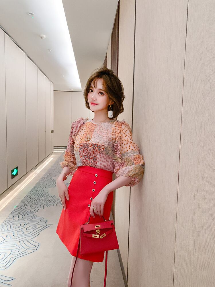 スタンダードカラープリントラウンドネックレーススリーブトップス スプリングサマー ランタンスリーブ レトロ 大人ガーリー スウィート キュート カジュアル 春物 夏物 Oネック ステッチ MIUCO40202140917