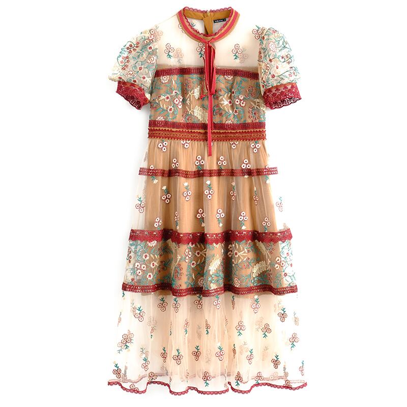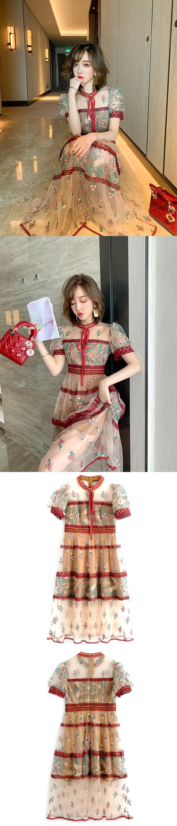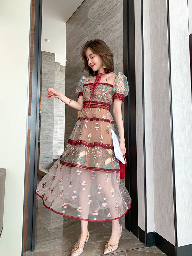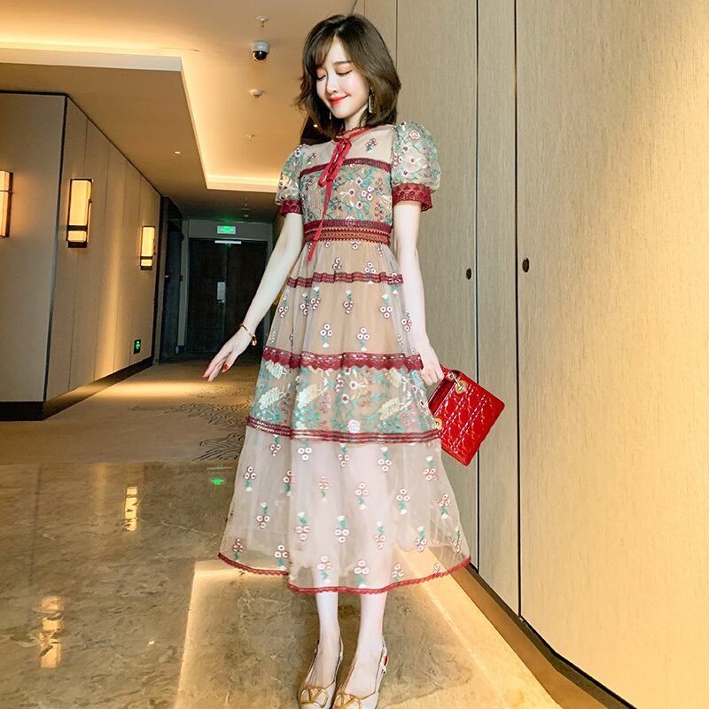 スタンダードカラーレースメッシュ刺繍ドレス スプリング レトロ 春物 ステッチ MIUCO88980491593