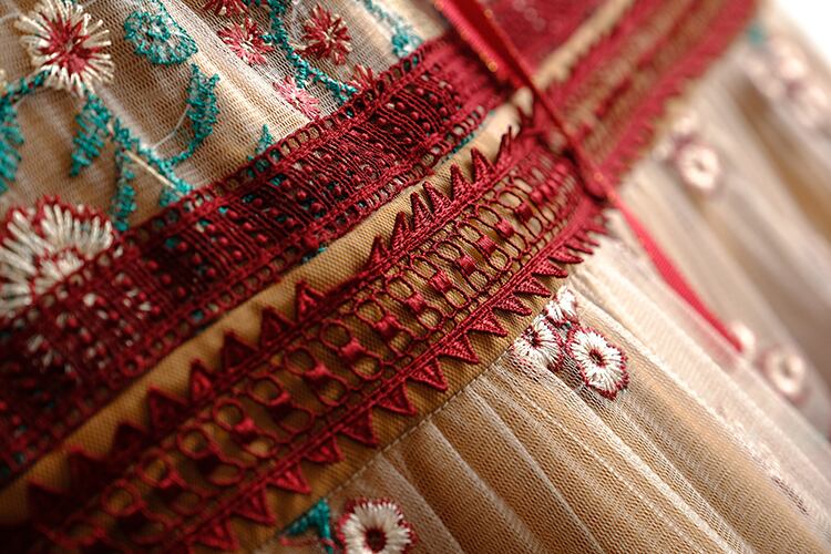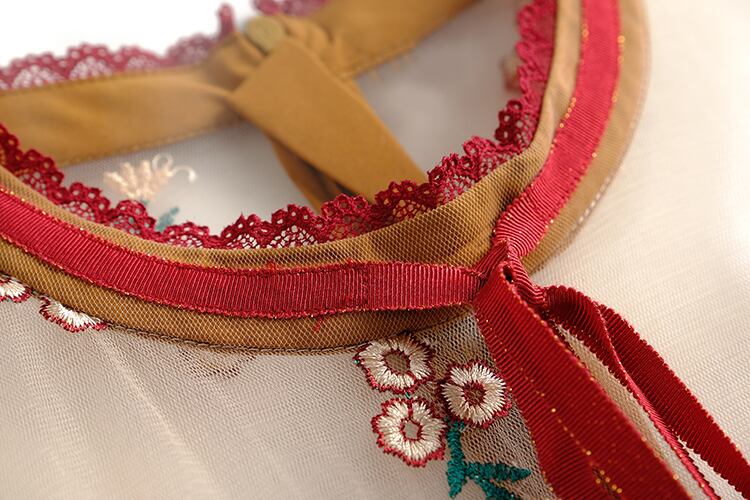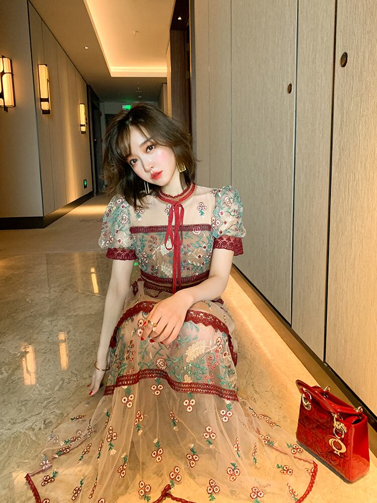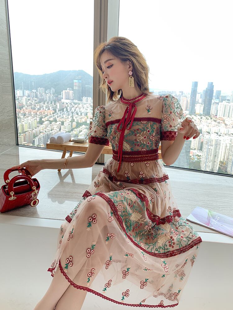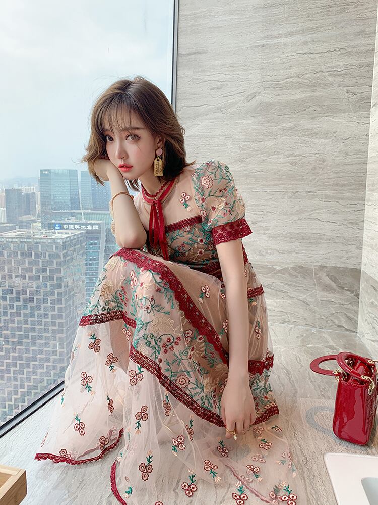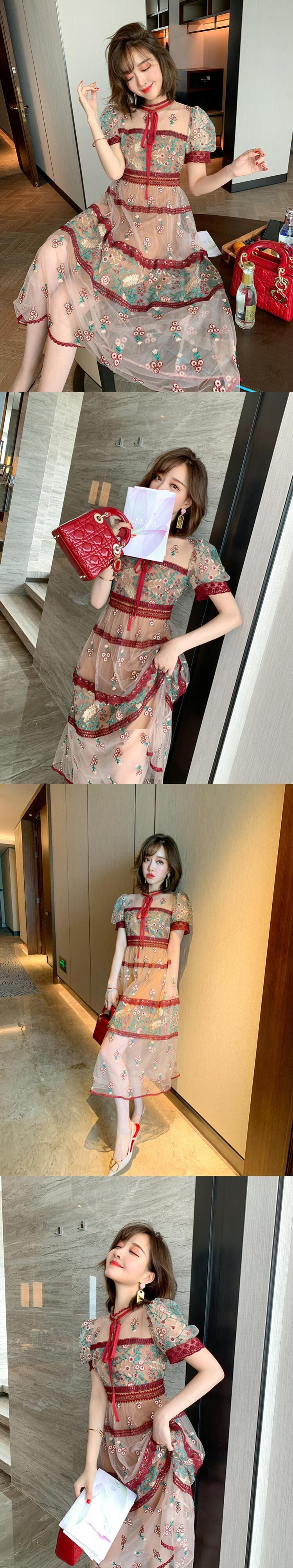 スタンダードカラーレースメッシュ刺繍ドレス スプリング レトロ 春物 ステッチ MIUCO88980491593