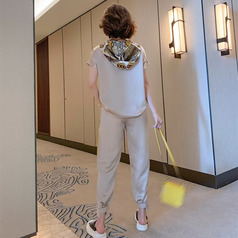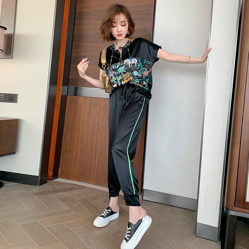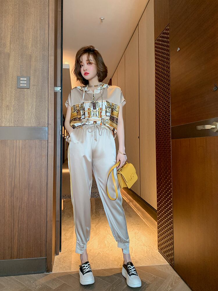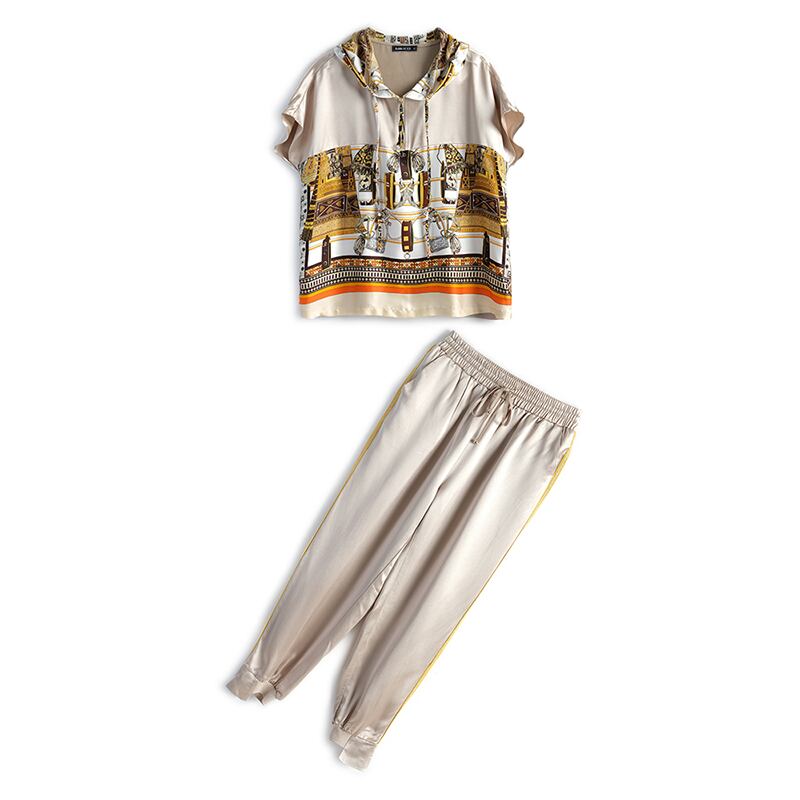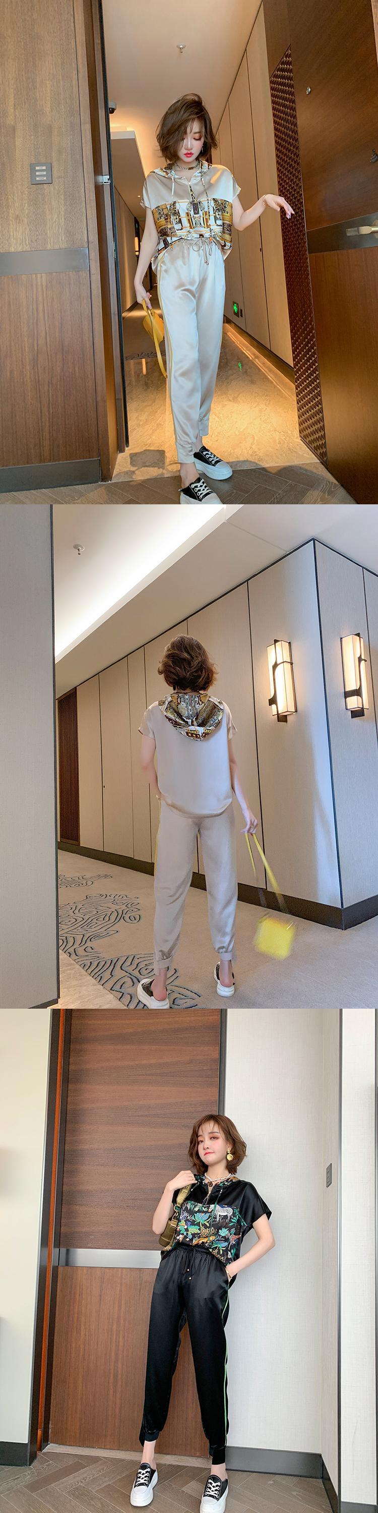 フードプリントジッパー半袖スリーブトップス ストレッチウェストパンツ セット サマー ショート ハーフスリーブ エラスティック 伸縮 夏物 MIUCO81651957384