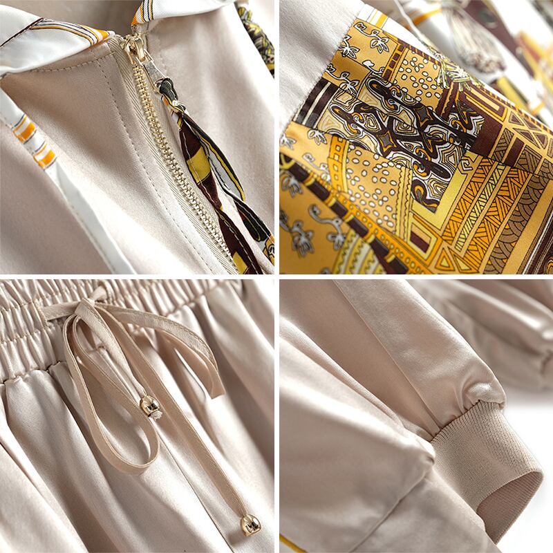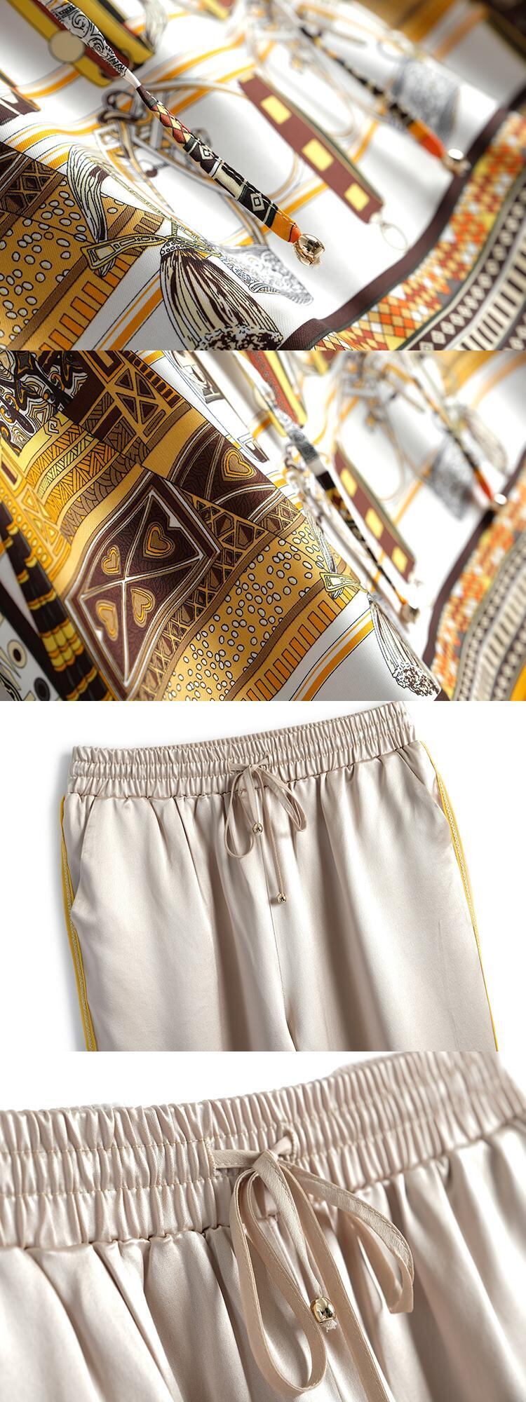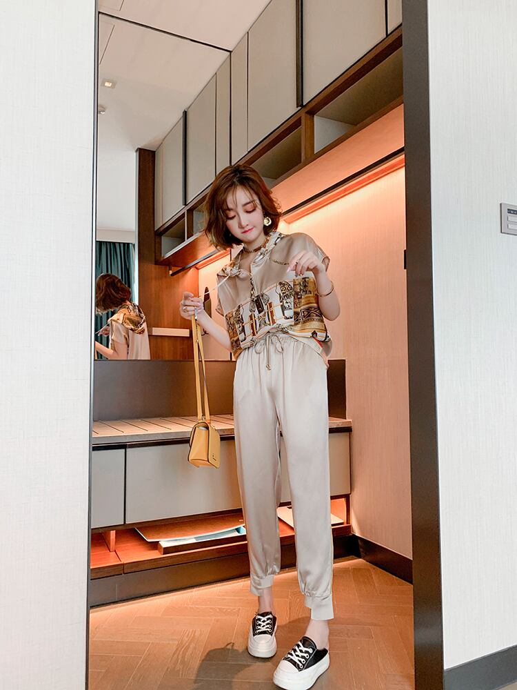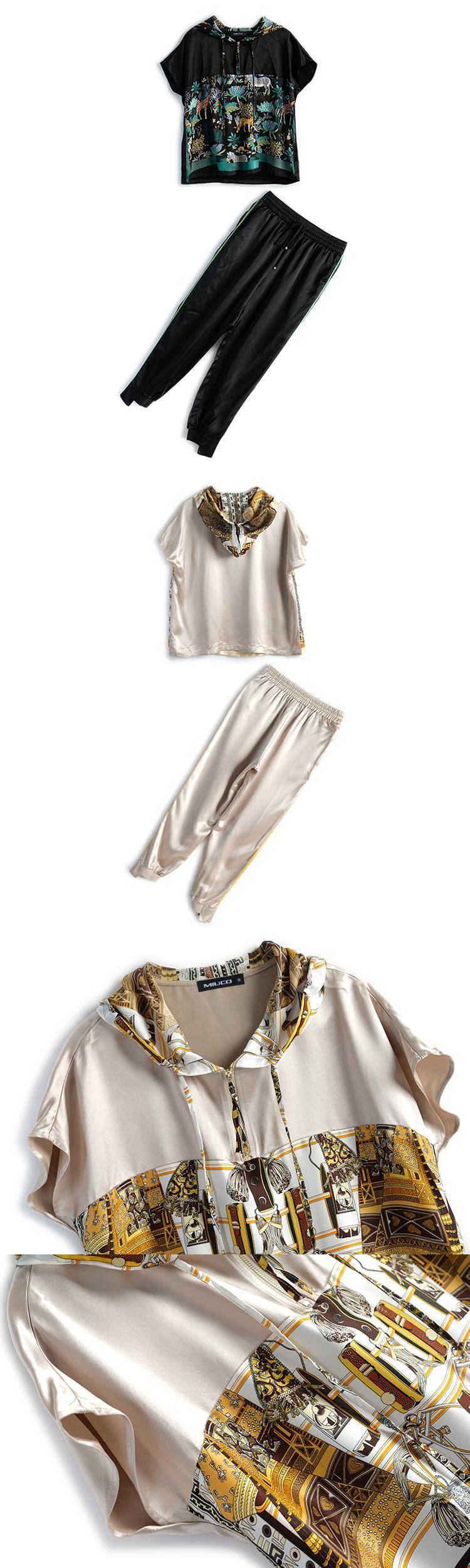 フードプリントジッパー半袖スリーブトップス ストレッチウェストパンツ セット サマー ショート ハーフスリーブ エラスティック 伸縮 夏物 MIUCO81651957384