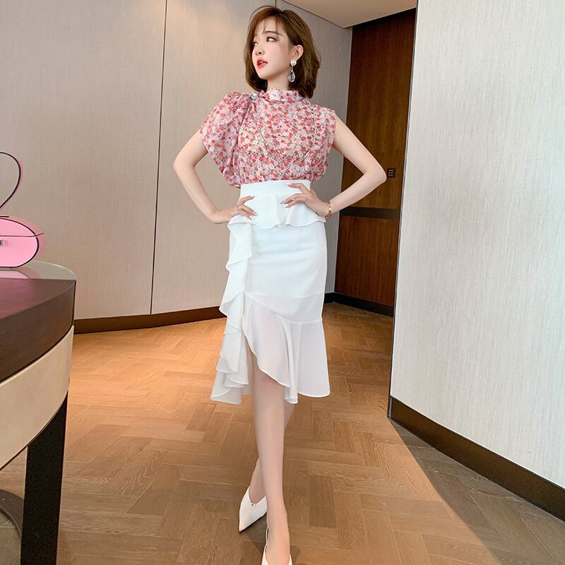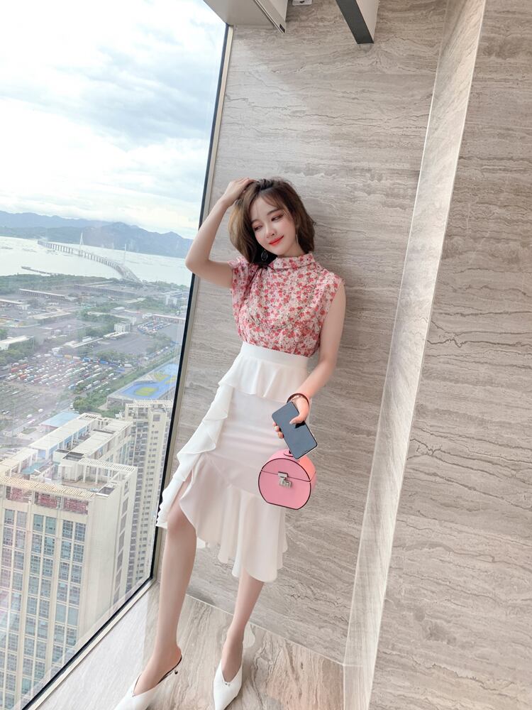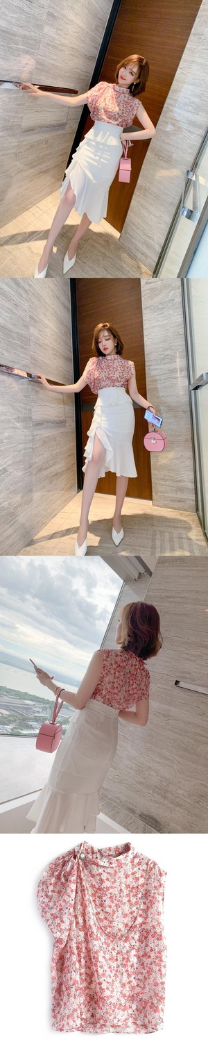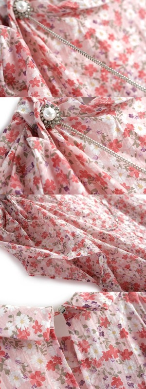 スタンドカラーカラーサイドスリーブバックルチェーン フローラルシャツ トップス サマー 夏物 花柄 MIUCO7356729847
