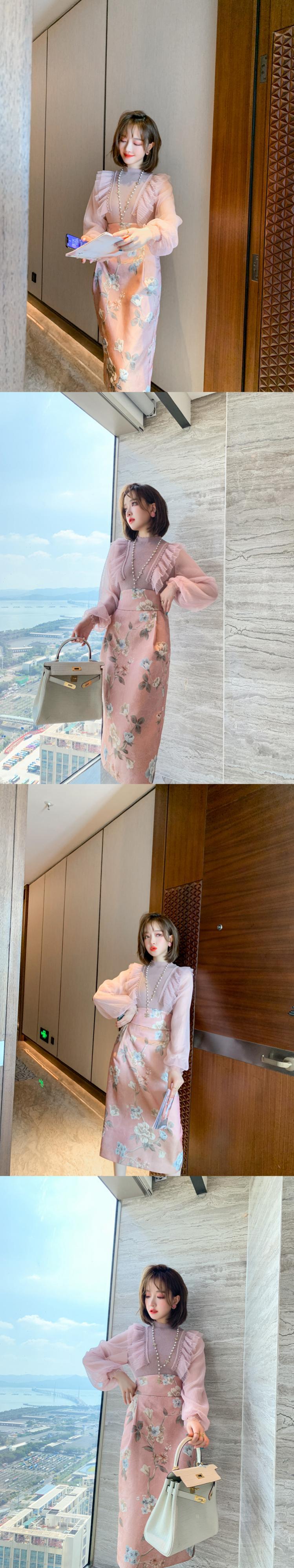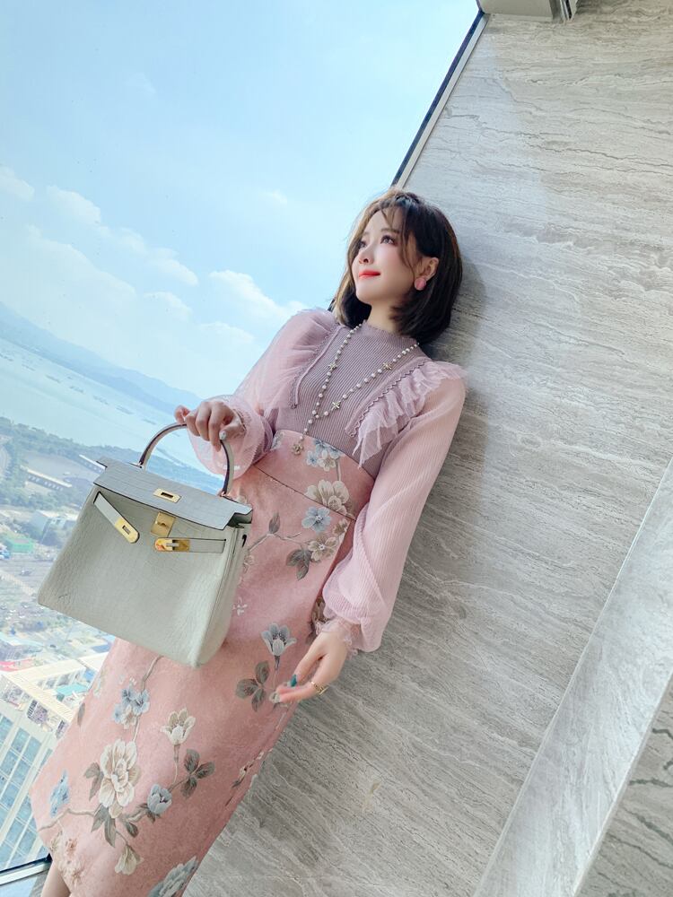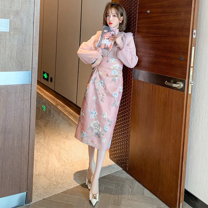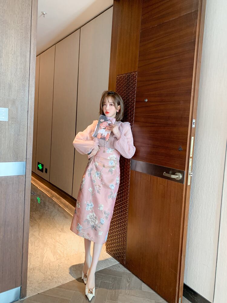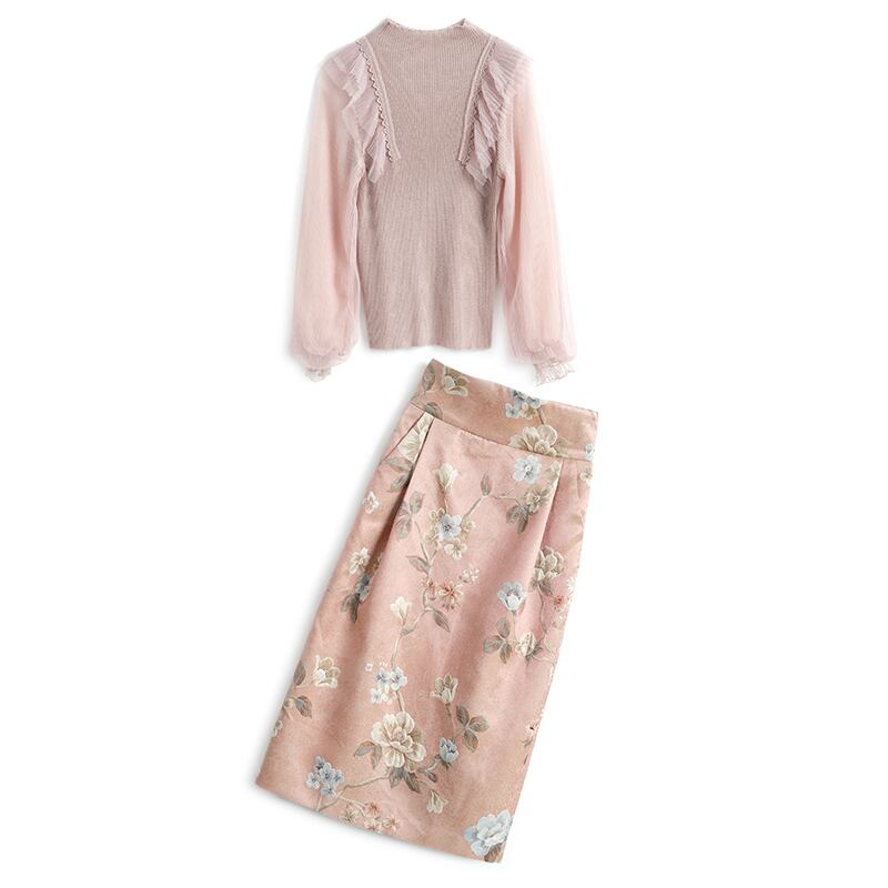 メッシュレーススリーブシャツ ジャカードハイウェストウェストスカート レディースウィンター ランタンスリーブ エレガント 冬物 MIUCO59050540976