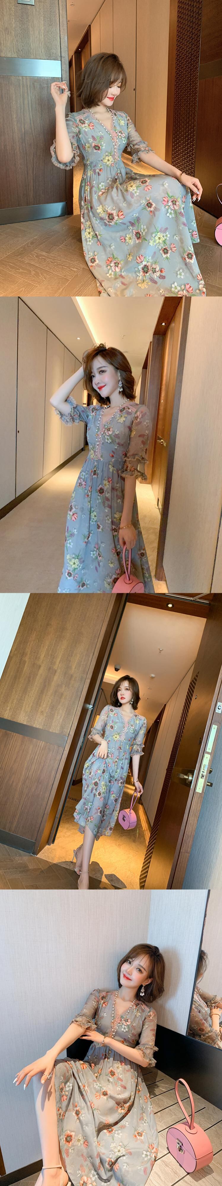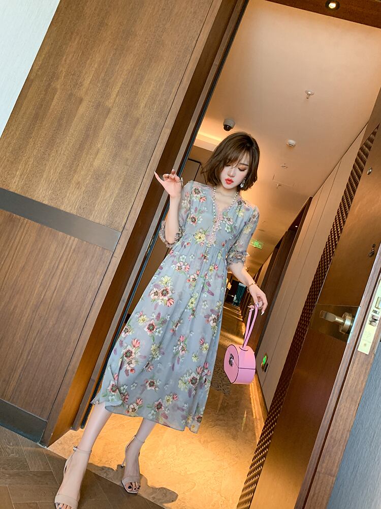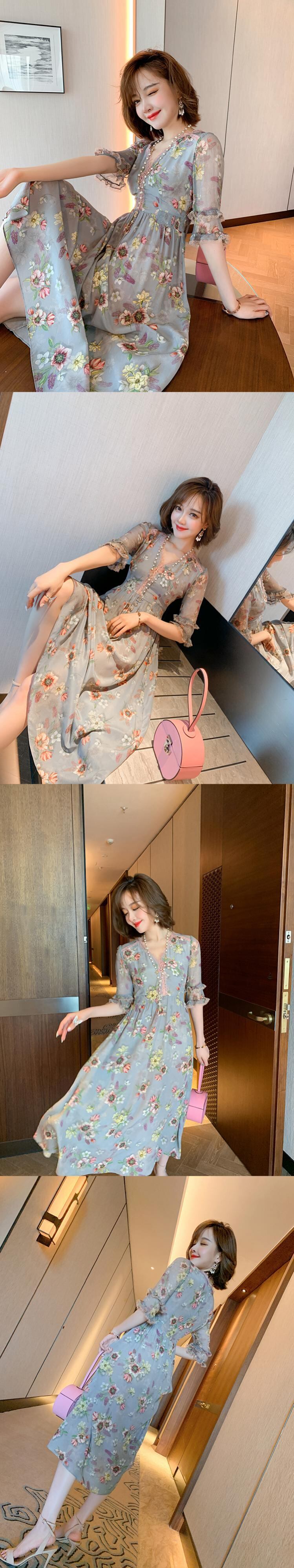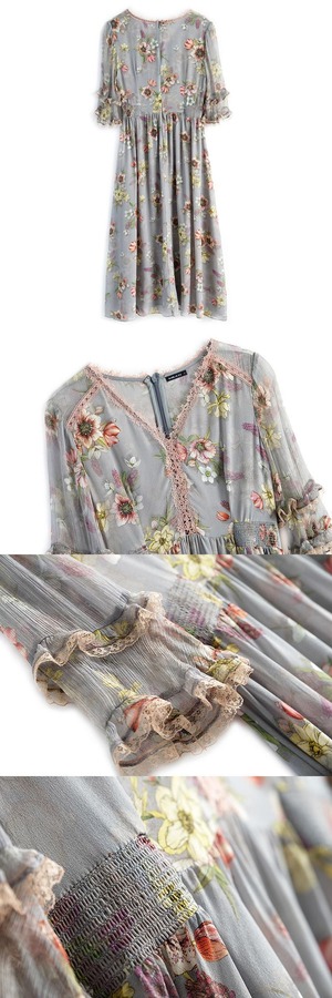 Vネックレースプリーツハイウェストウェストプリントドレス サマー 夏物 ステッチ MIUCO9059013185