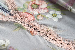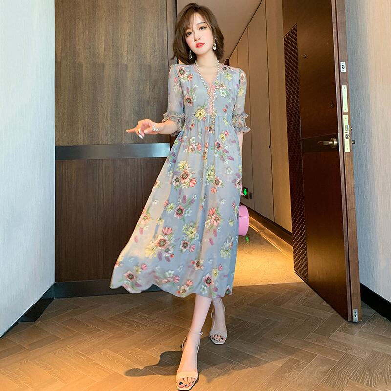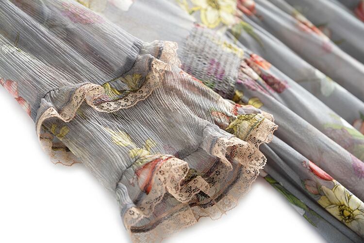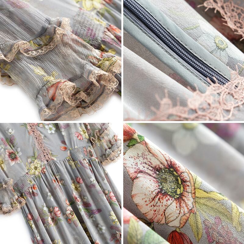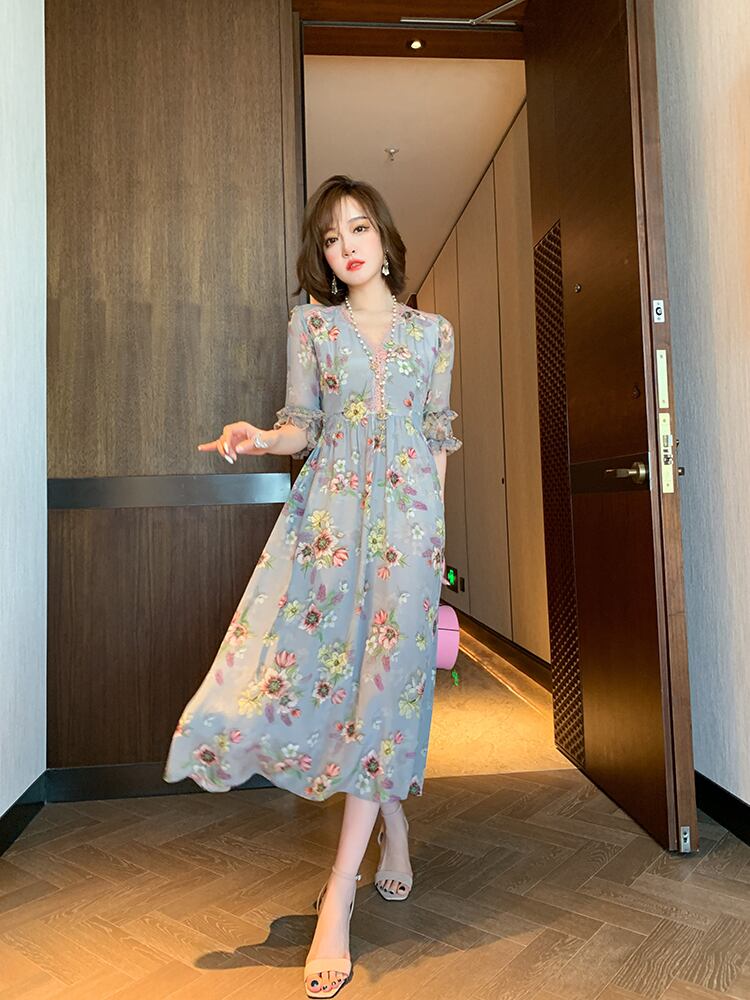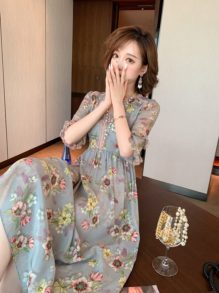 Vネックレースプリーツハイウェストウェストプリントドレス サマー 夏物 ステッチ MIUCO9059013185