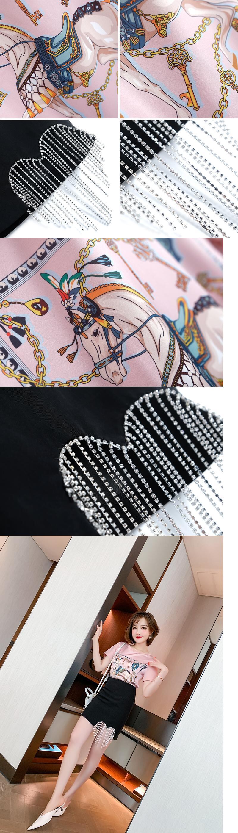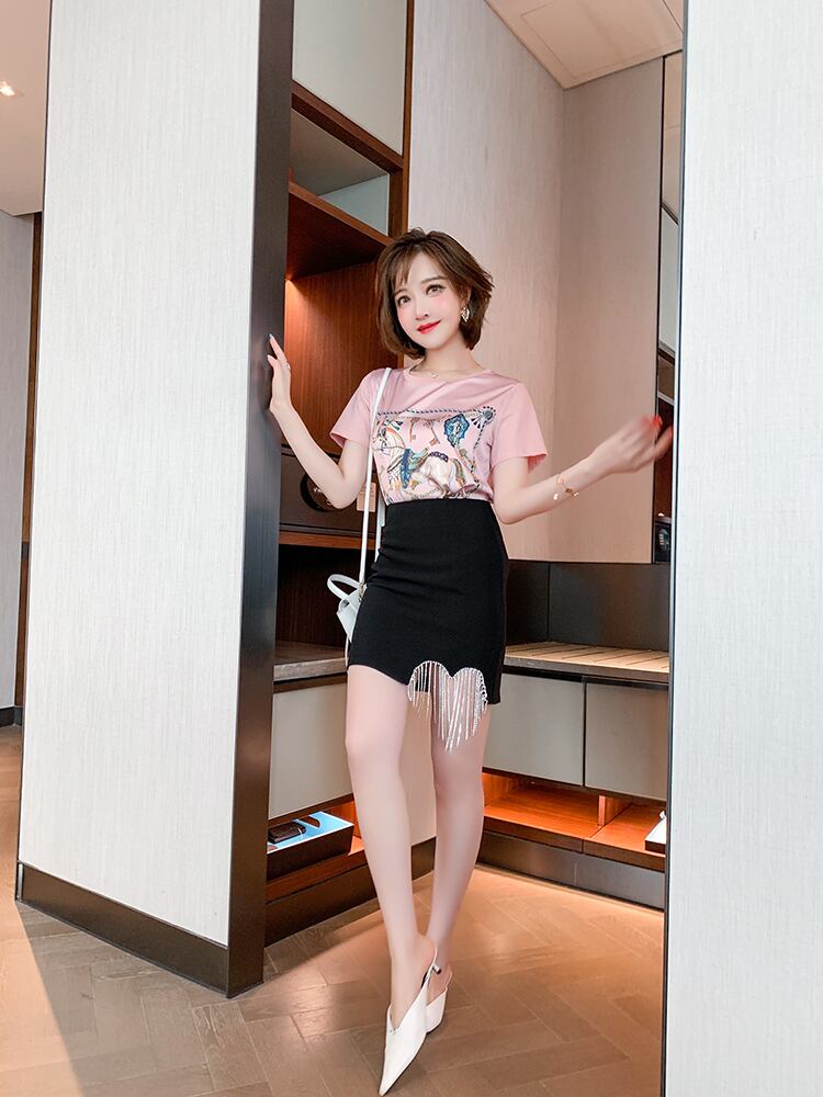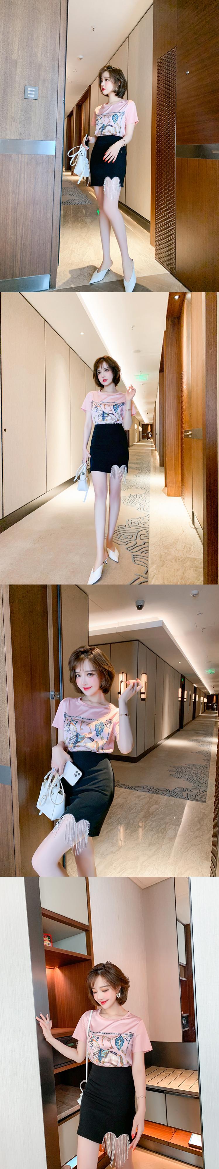 スタンダードプリント柄Tシャツ ストライプスリムスカート スプリングサマー レトロ 春物 夏物 スリムヒップ MIUCO99966706313