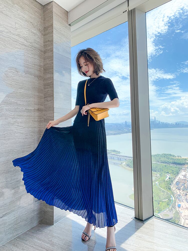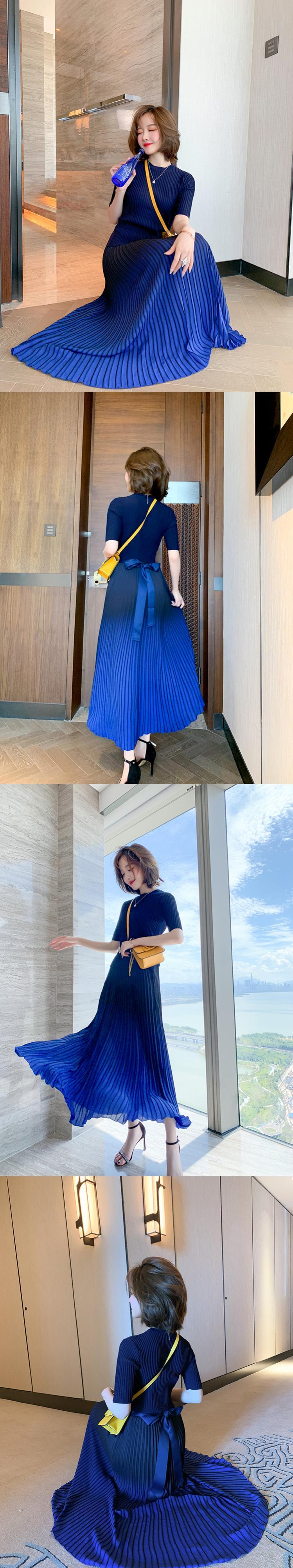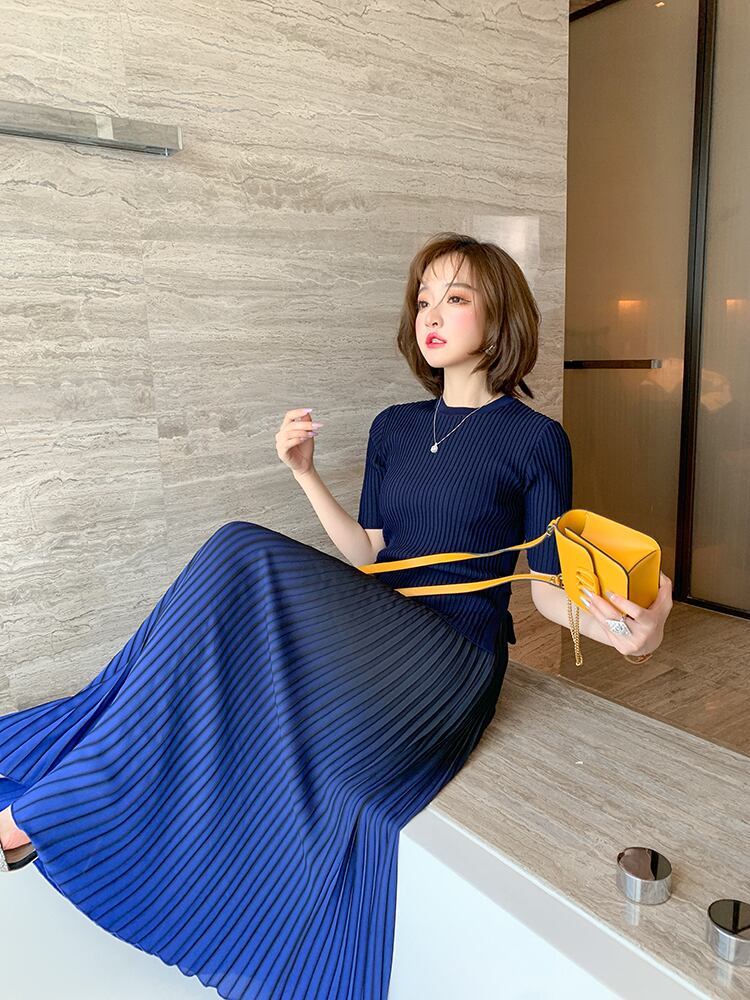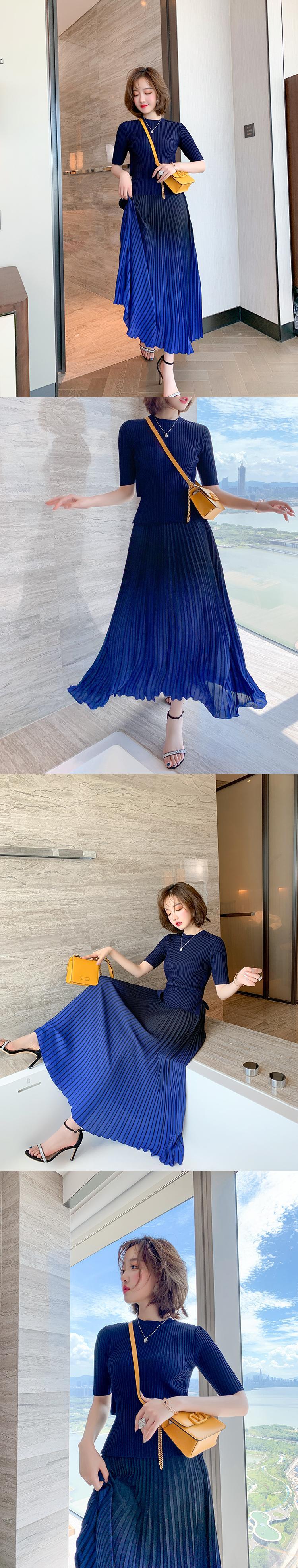 スリムラウンドネックスリーブニットTシャツ プリーツスカート オータム 秋物 Oネック MIUCO37449362946