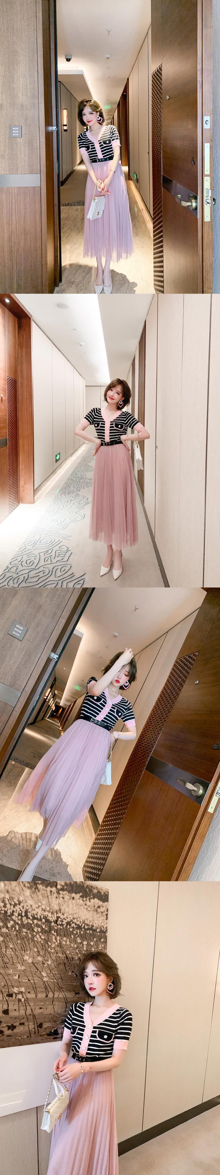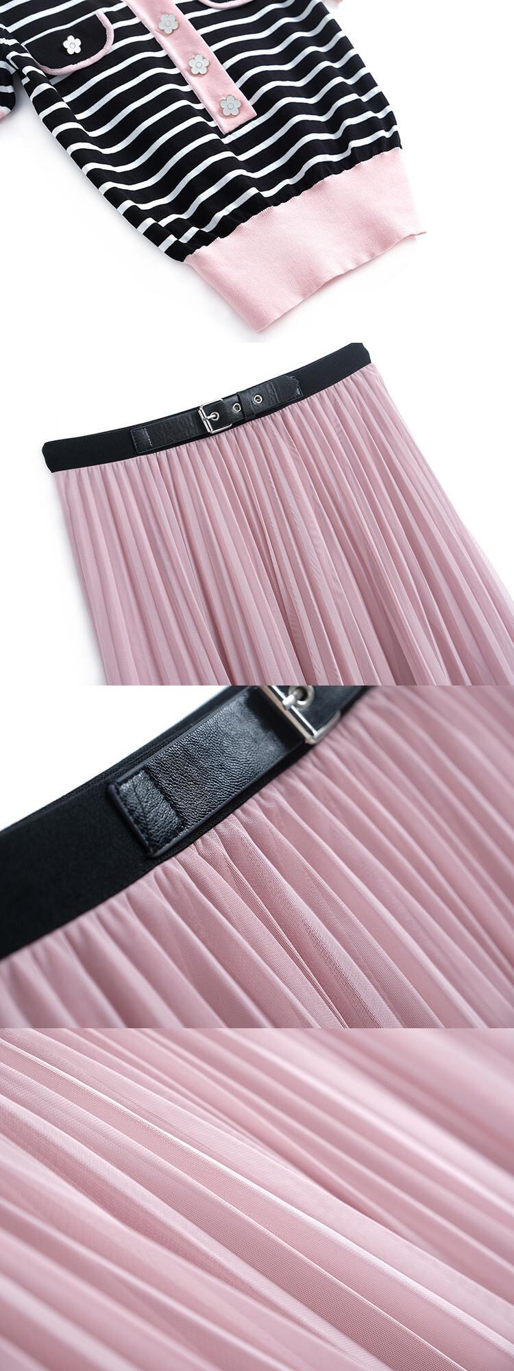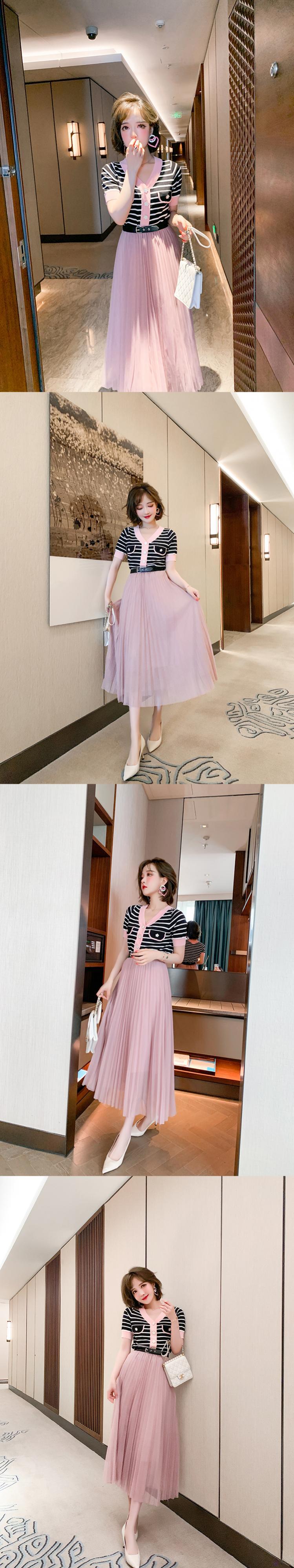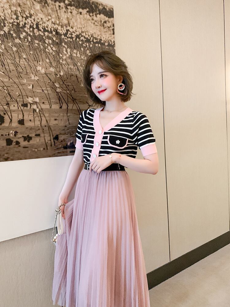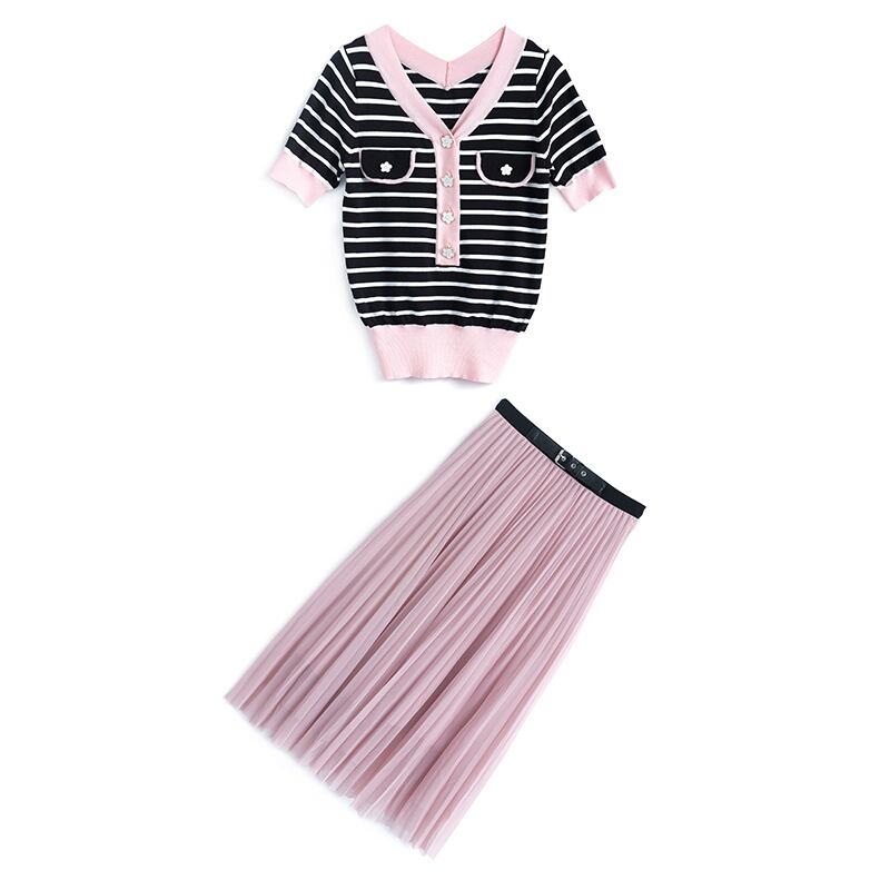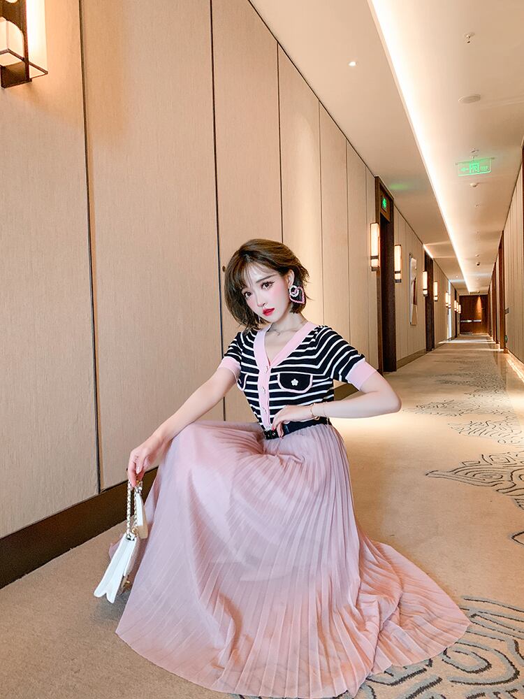 カラーストライプVネックセーター ハイウェストプリーツスカート スプリングサマー 春物 夏物 MIUCO85422648762