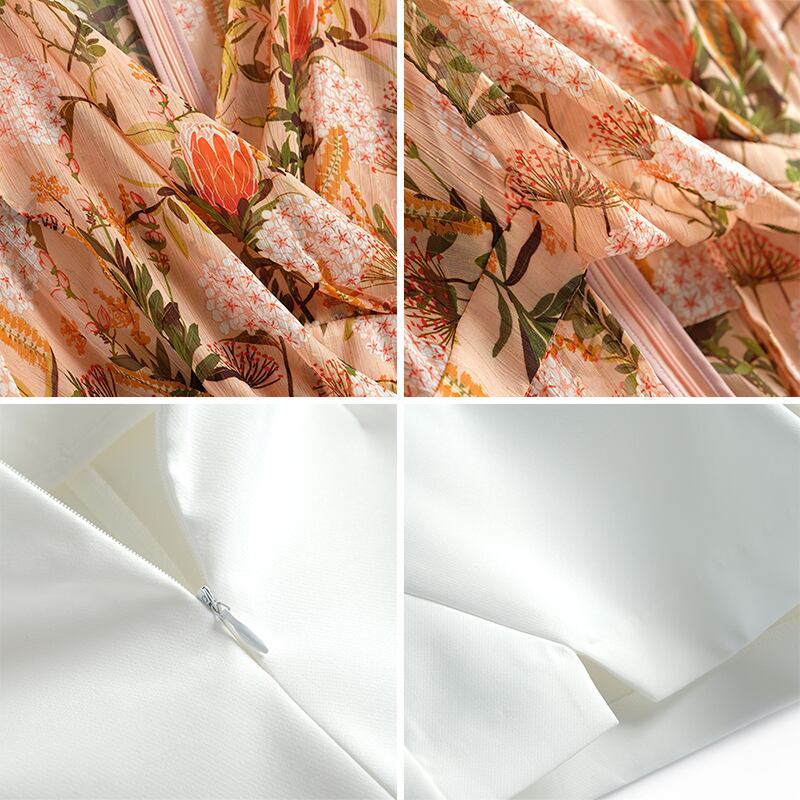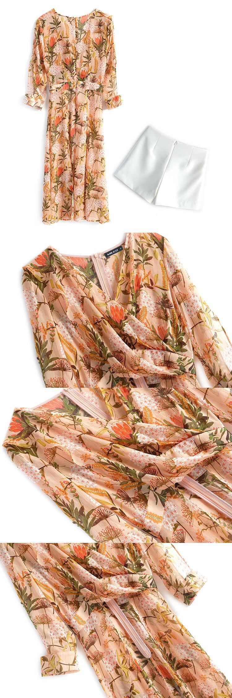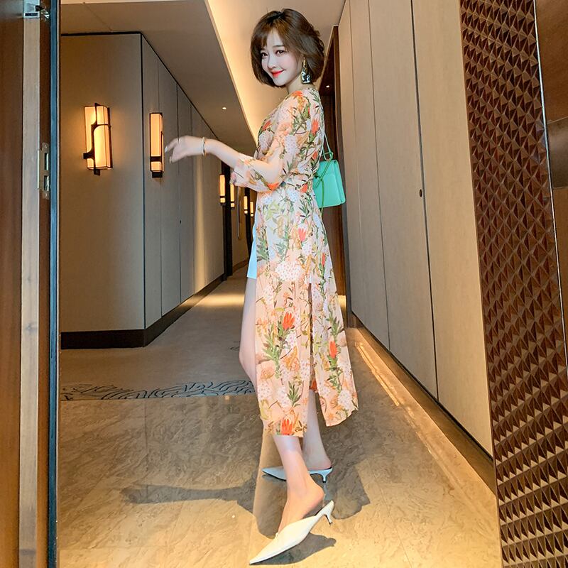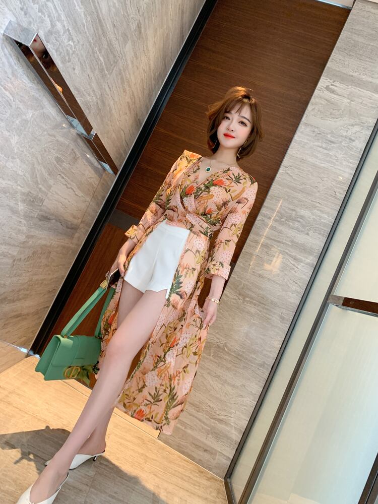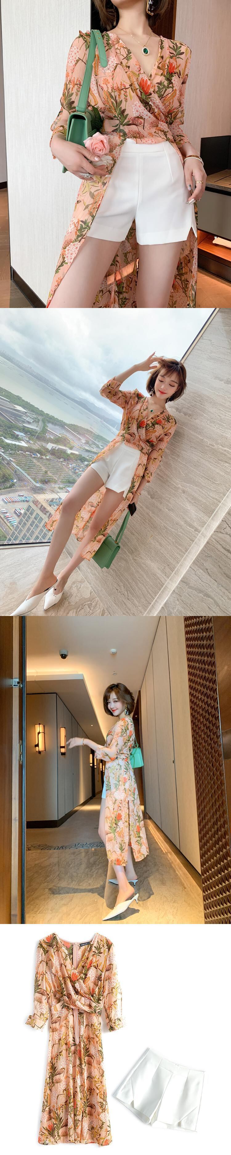 プリントVネックロングスリットトップス ウェスト薄手ホワイトショーツ スプリング 春物 サマー 夏物 ブルマー MIUCO92472020097