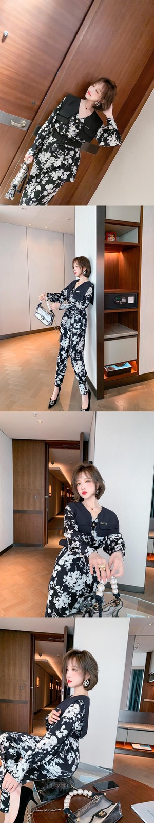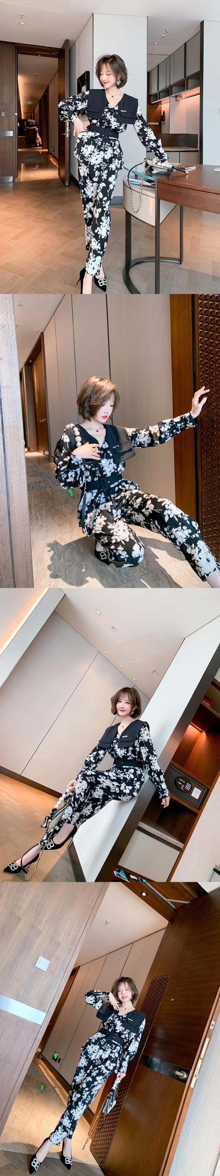 Vネックウェストプリント薄手ジャンプスーツ オールインワン スプリング 春物 MIUCO59185697650