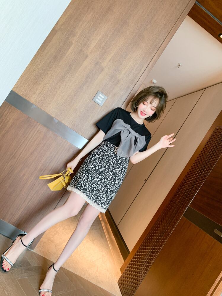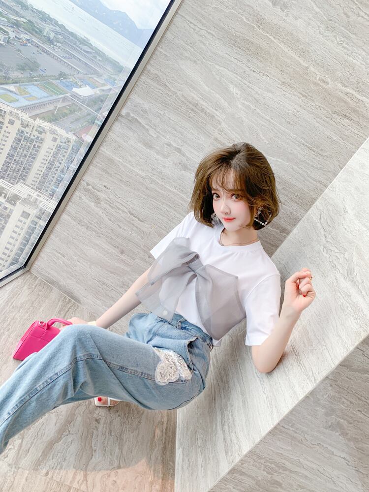 カラーメッシュカジュアルラウンドネックTシャツ スプリングサマー リボン 春物 夏物 Oネック MIUCO92164853767