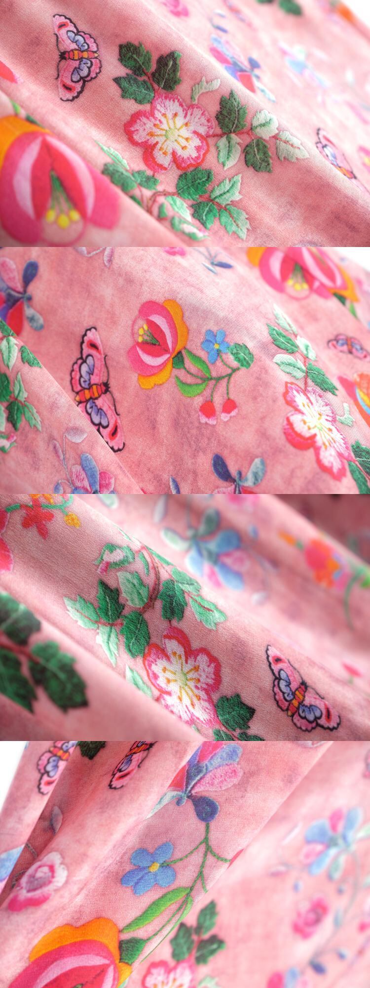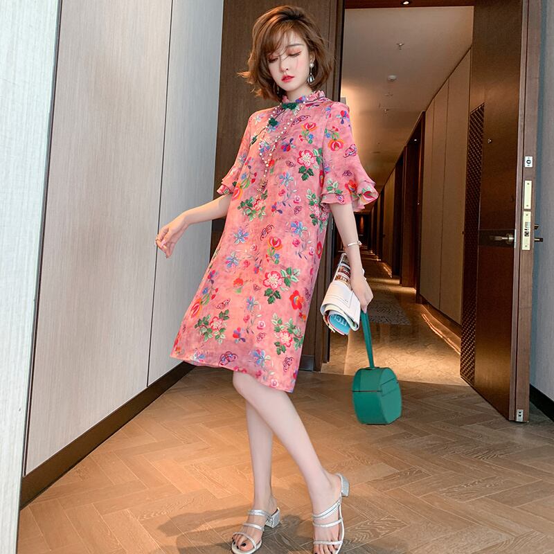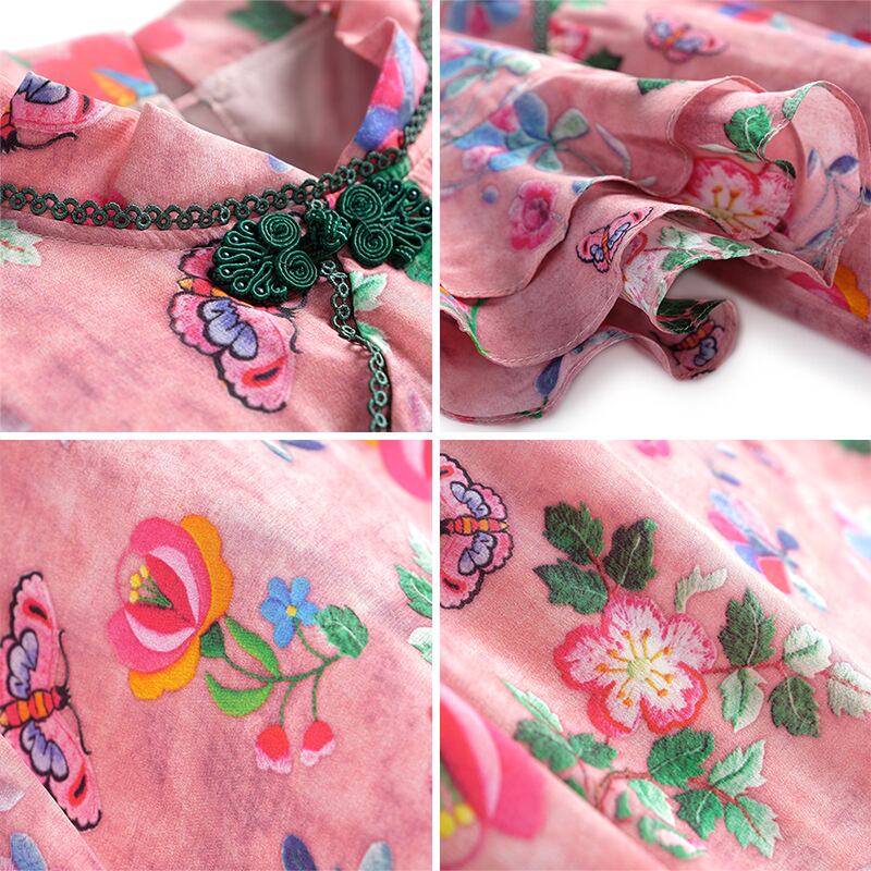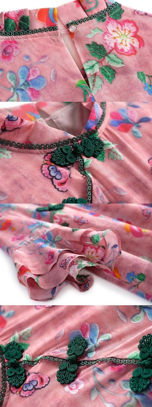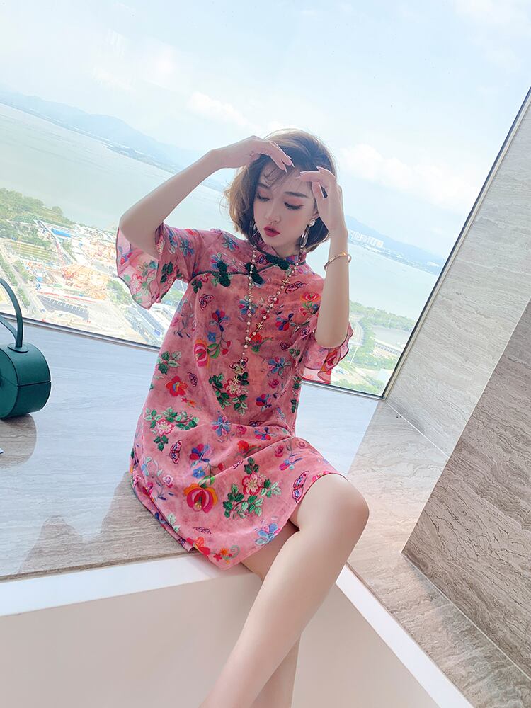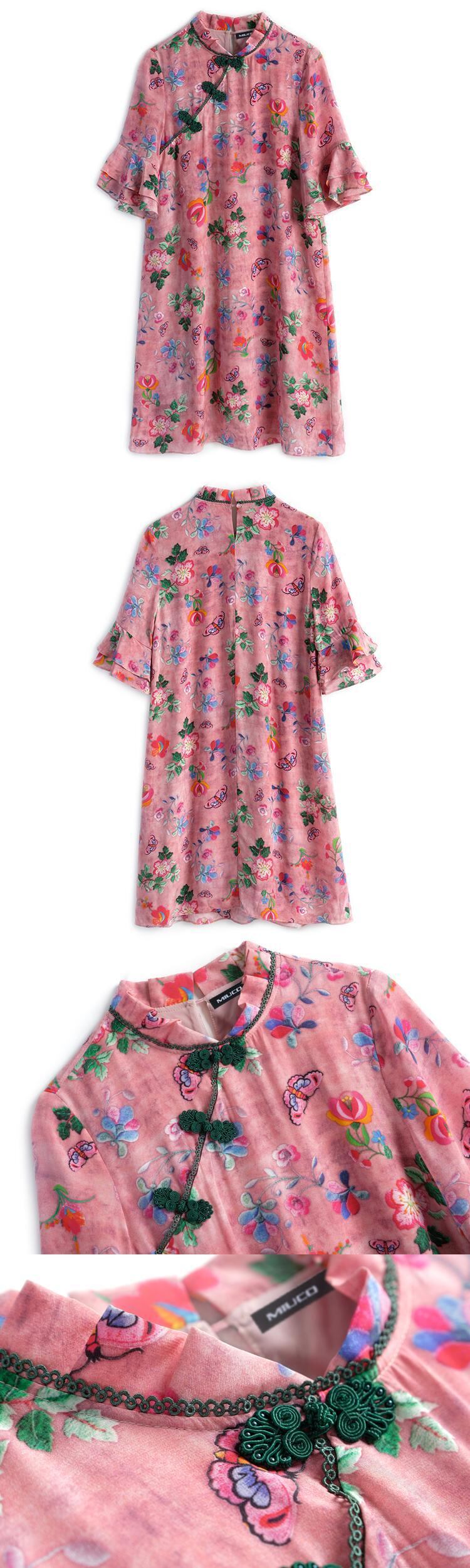スタンダードプリントスタンドカラーカラーボタンルーズドレス スプリング レトロ 春物 シルク MIUCO86112089825