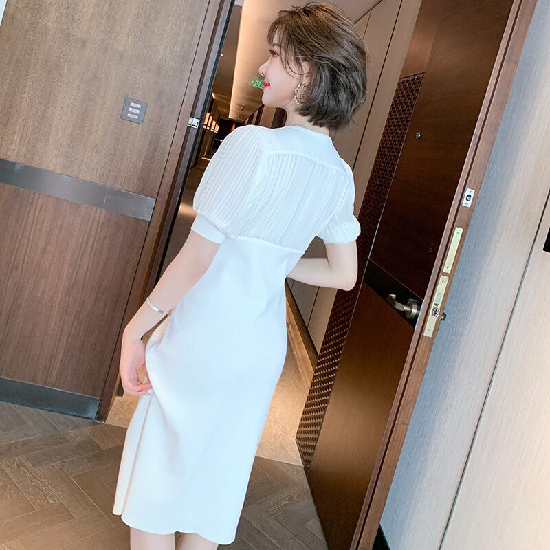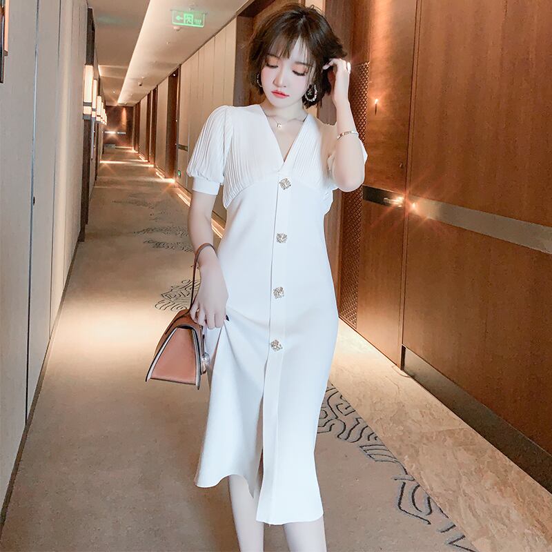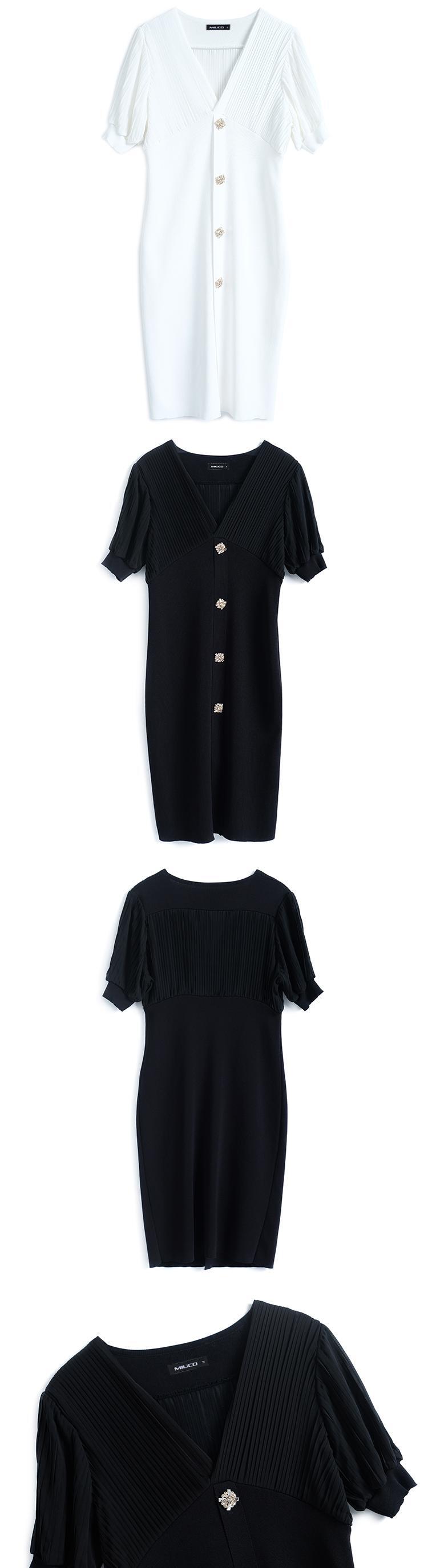 Vネックソリッド カラープリーツニットドレス スプリング 春物 ソリッドカラー ステッチ MIUCO41984517530