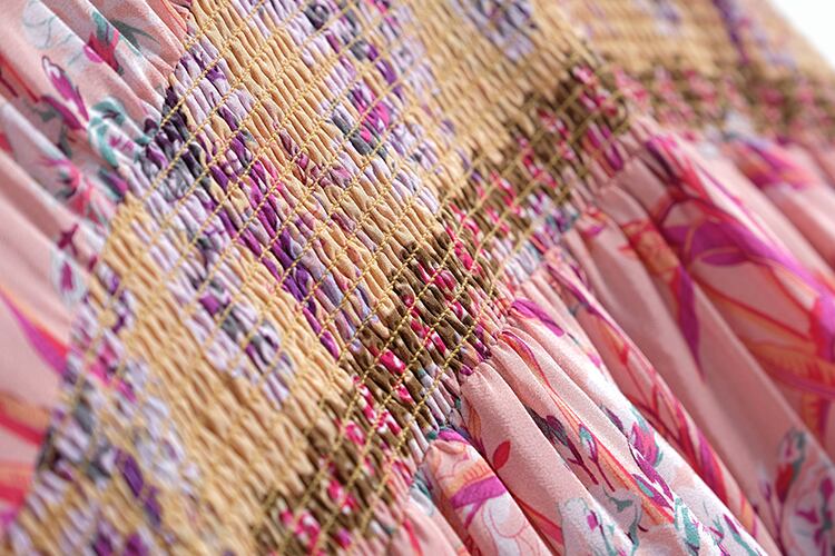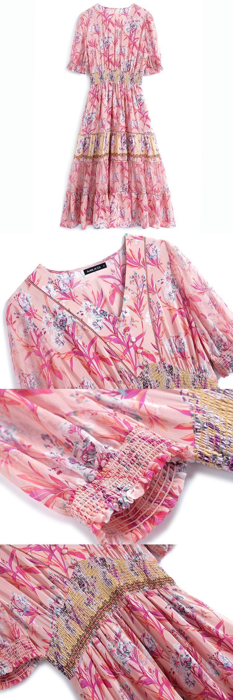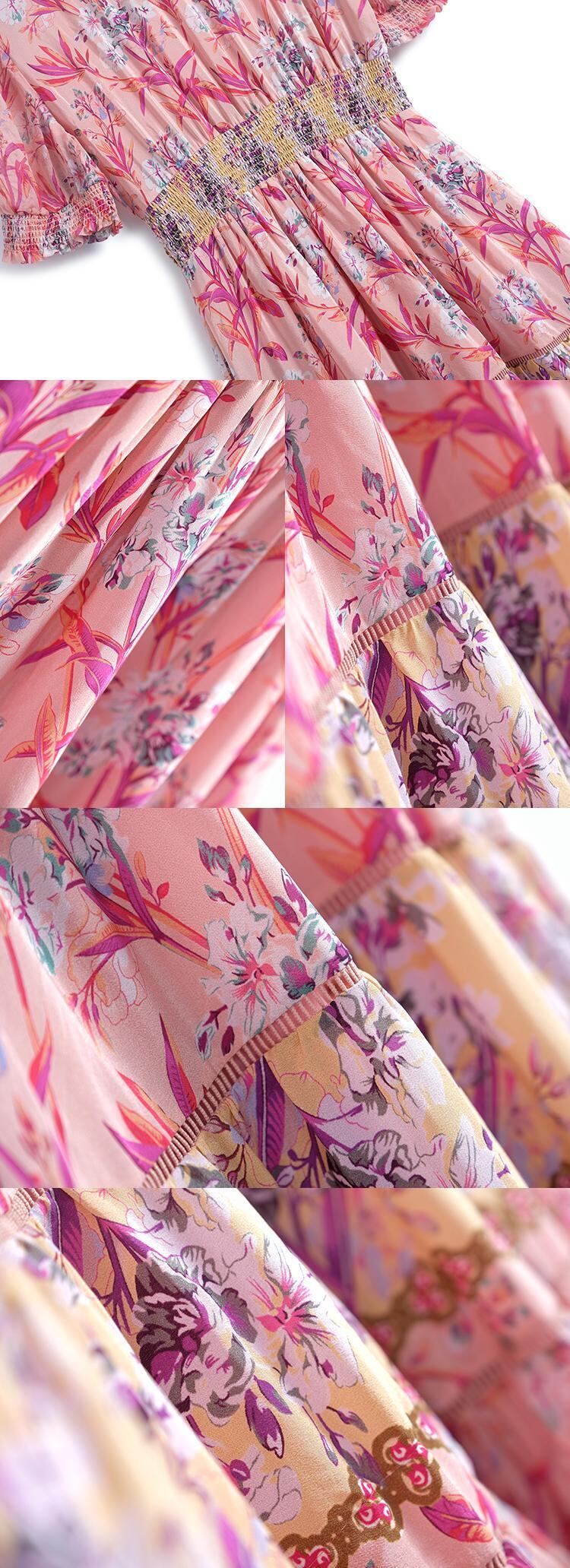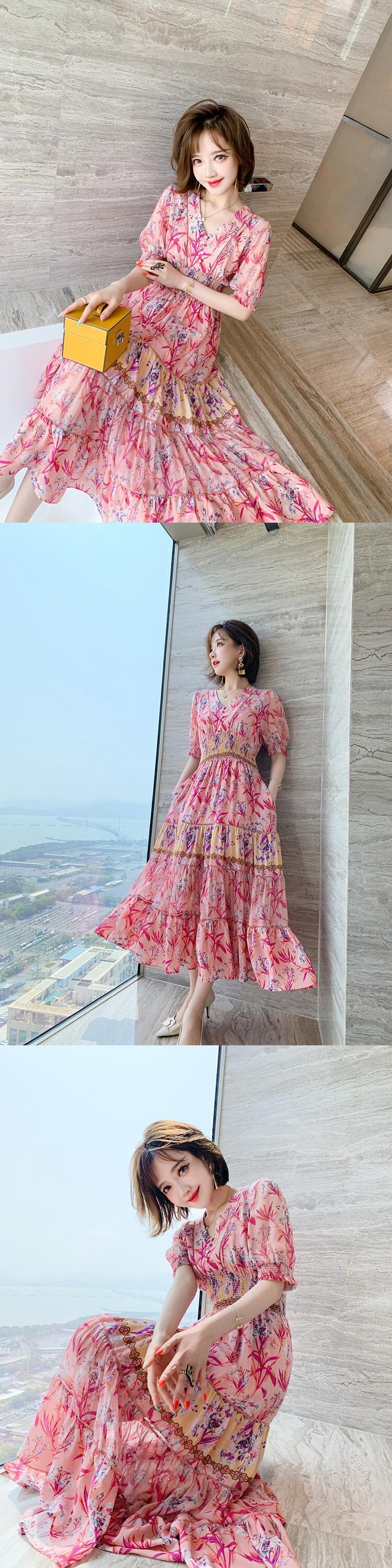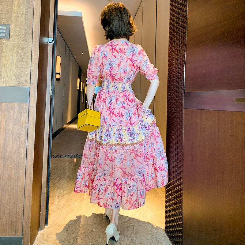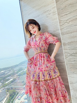 Vネックプリント柄ハイウェストスカート ドレス スプリングサマー 春物 夏物 シルク MIUCO61674007139