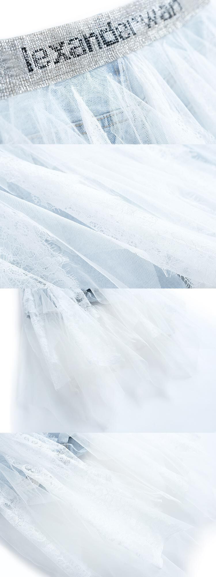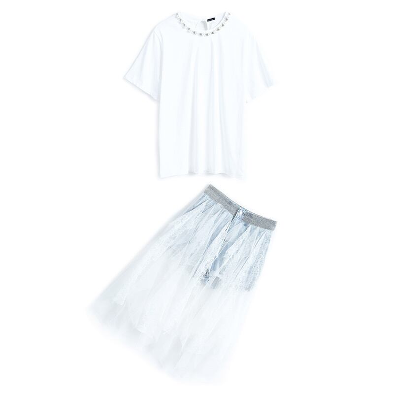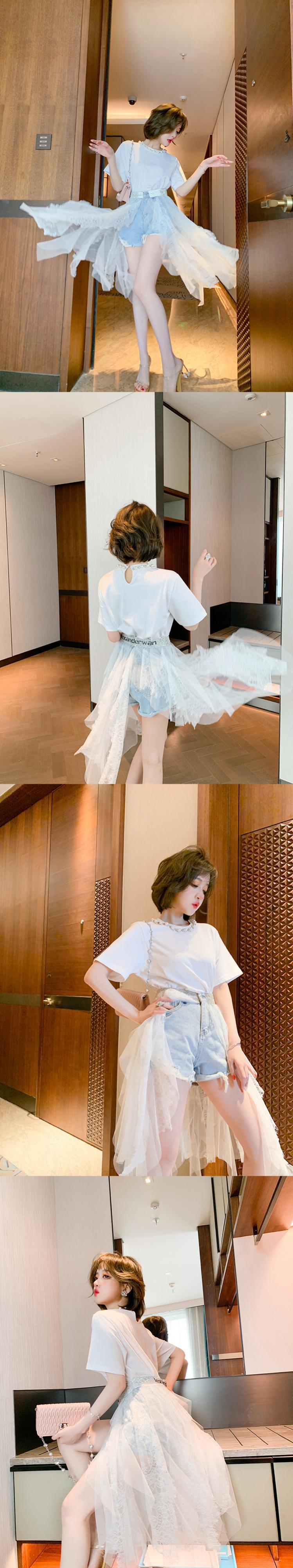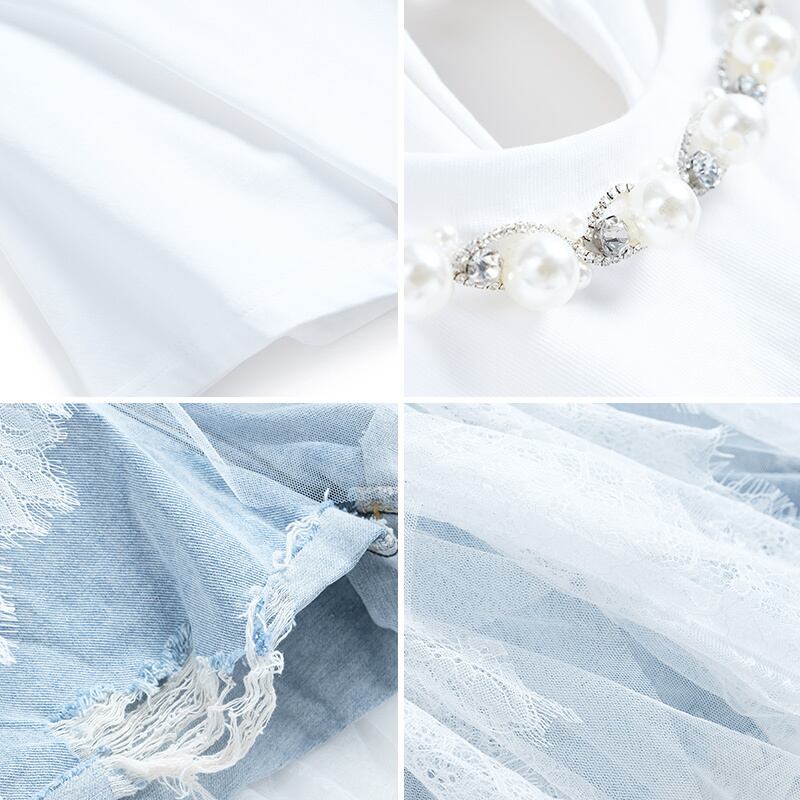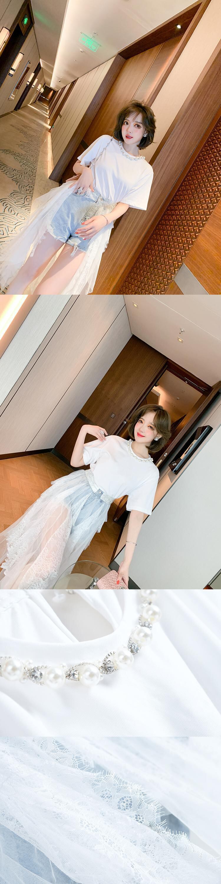 パールラウンドネックTシャツ メッシュスカート ジーンズ スプリングサマー 春物 夏物 Oネック 真珠 ステッチ MIUCO3127234414