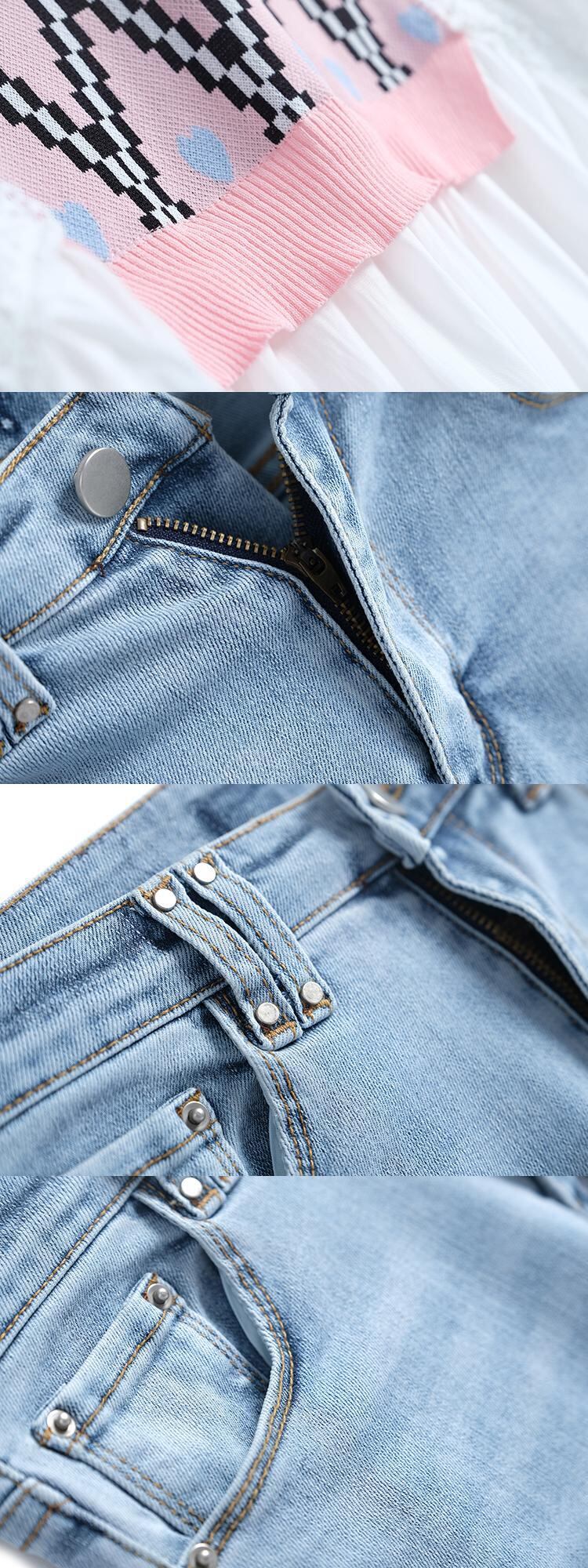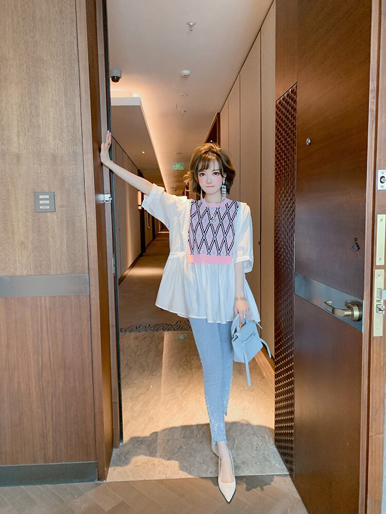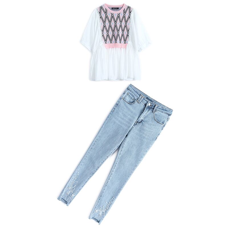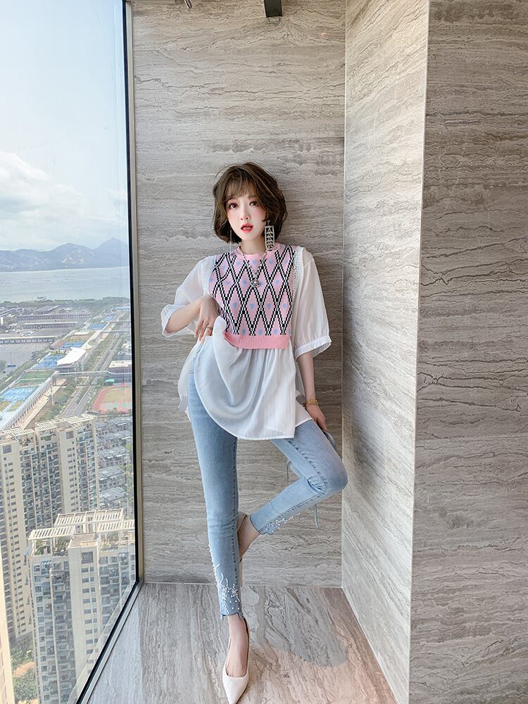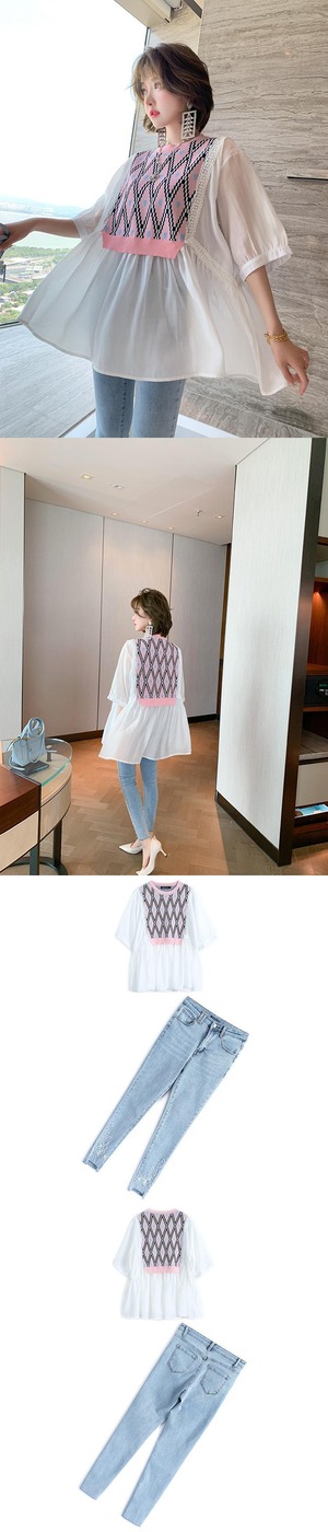 ジャカードニットシャツ スリーブトップス スリムジーンズ スプリングサマー 春物 夏物 ステッチ MIUCO38296288947