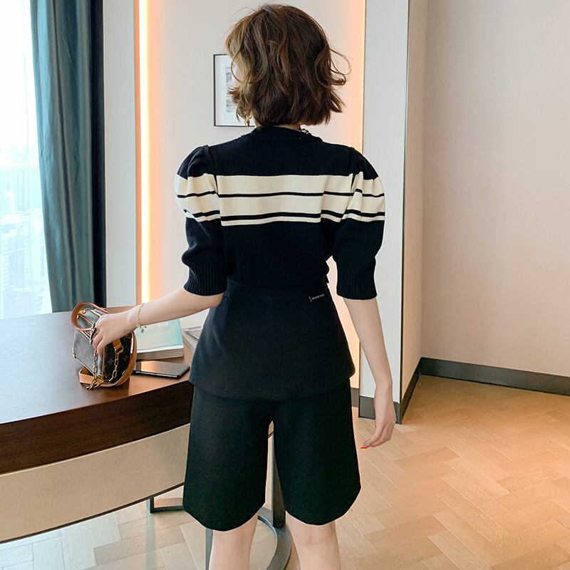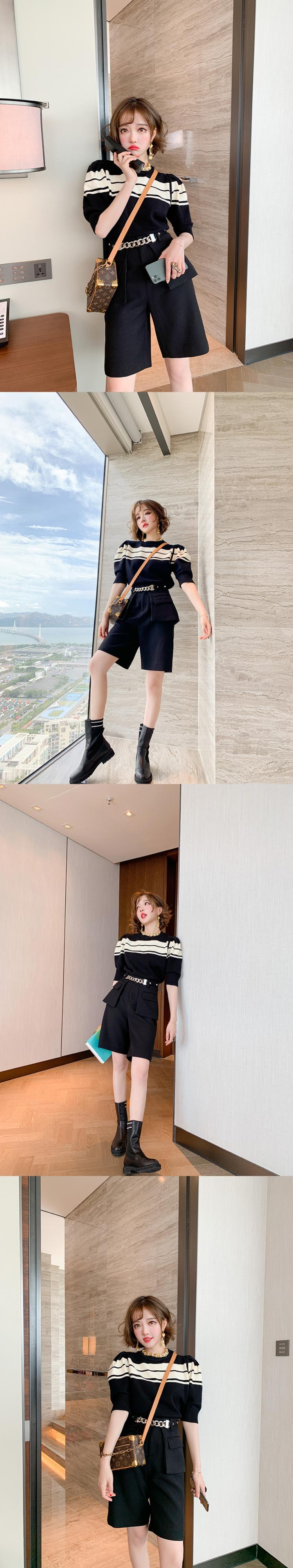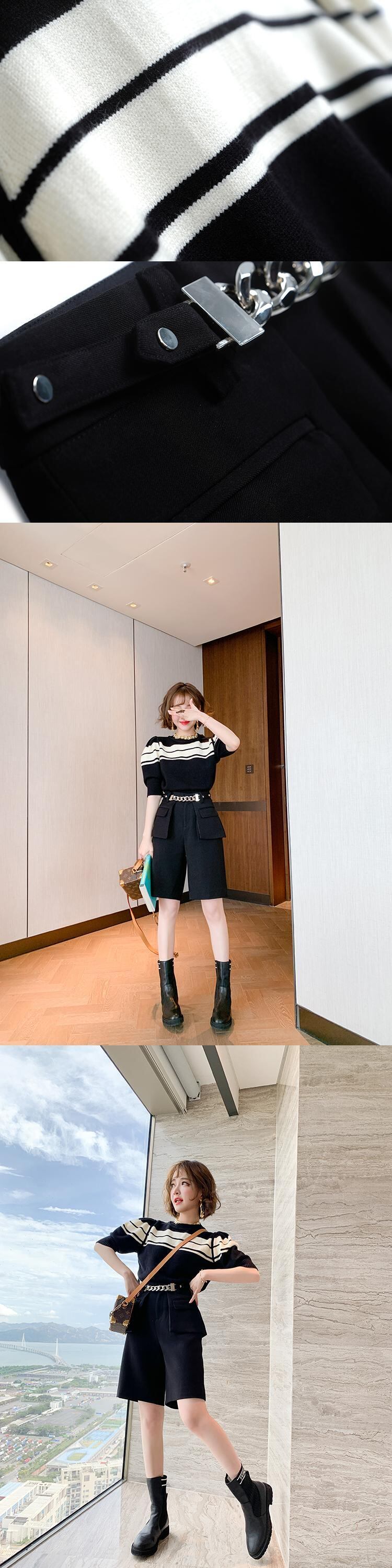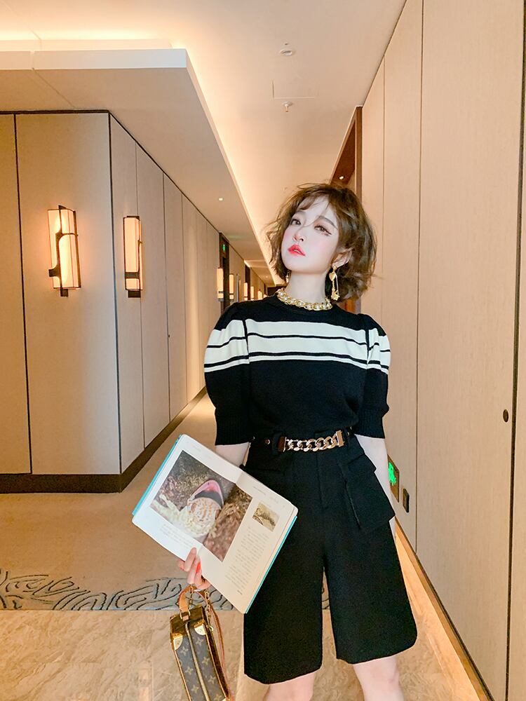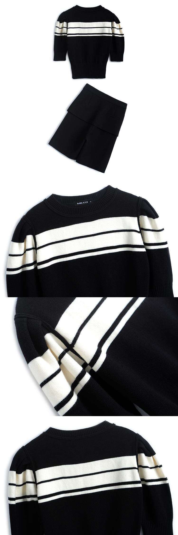 ストライプラウンドネックニット ワイドレッグパンツ セット Oネック ワイドパンツ ステッチ MIUCO36648709083