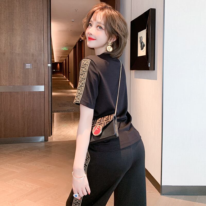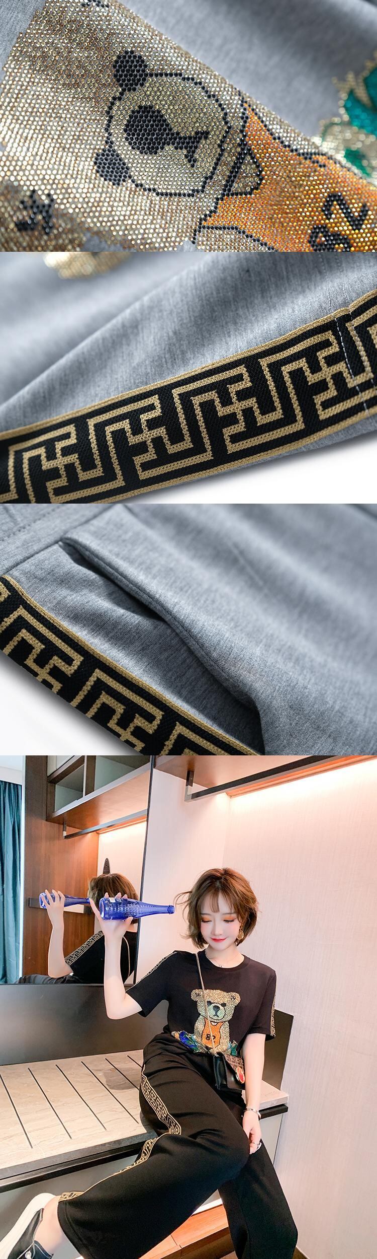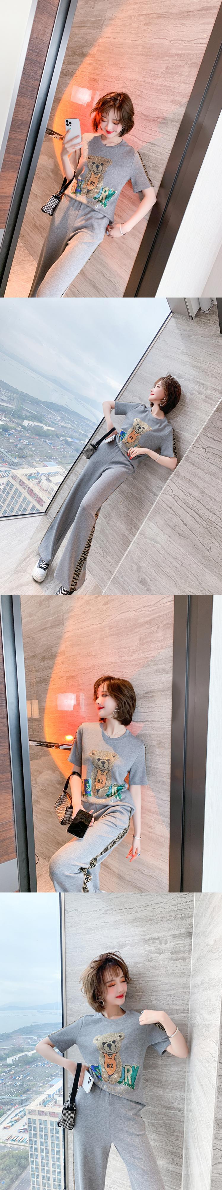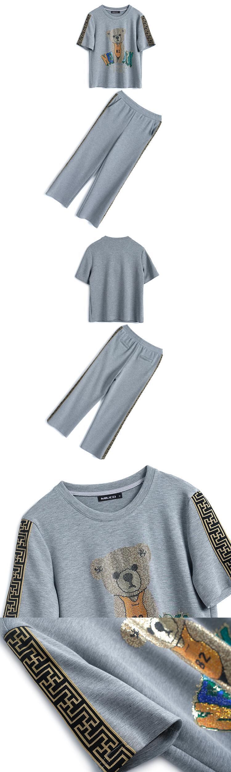 ラインストーンTシャツ ジャカード薄手ワイドレッグパンツ スプリング 春物 ワイドパンツ MIUCO18685544909