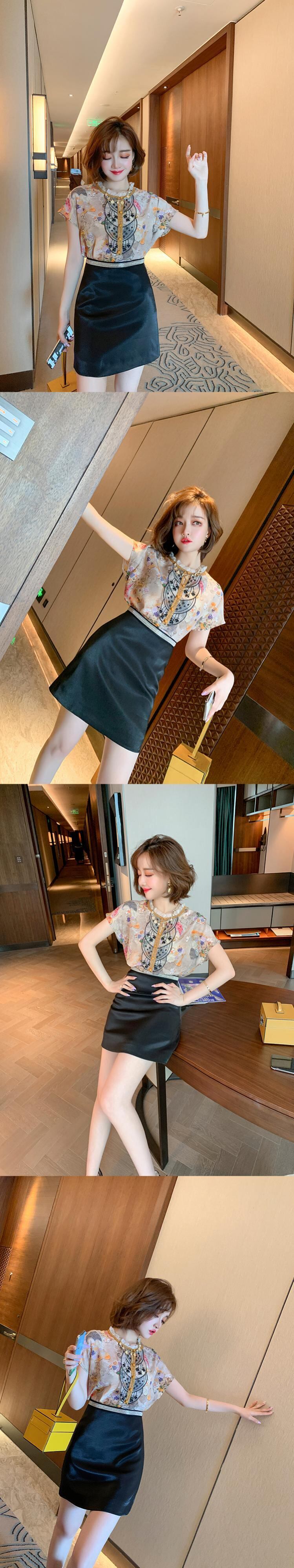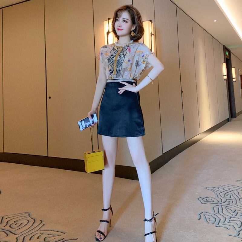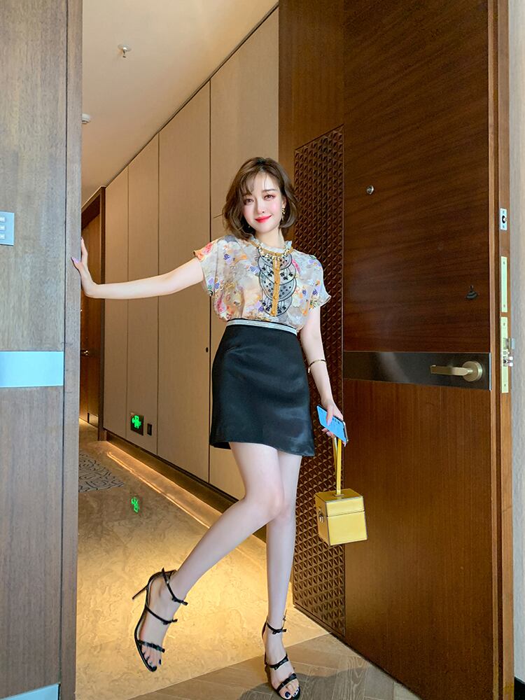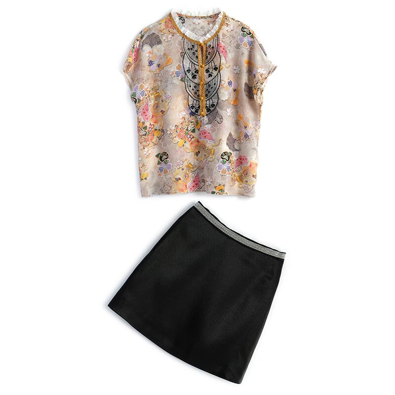 レースプリント柄ブラウス ハイウェストウェストAラインスカート スプリングサマー 春物 夏物 シルク MIUCO96675412117