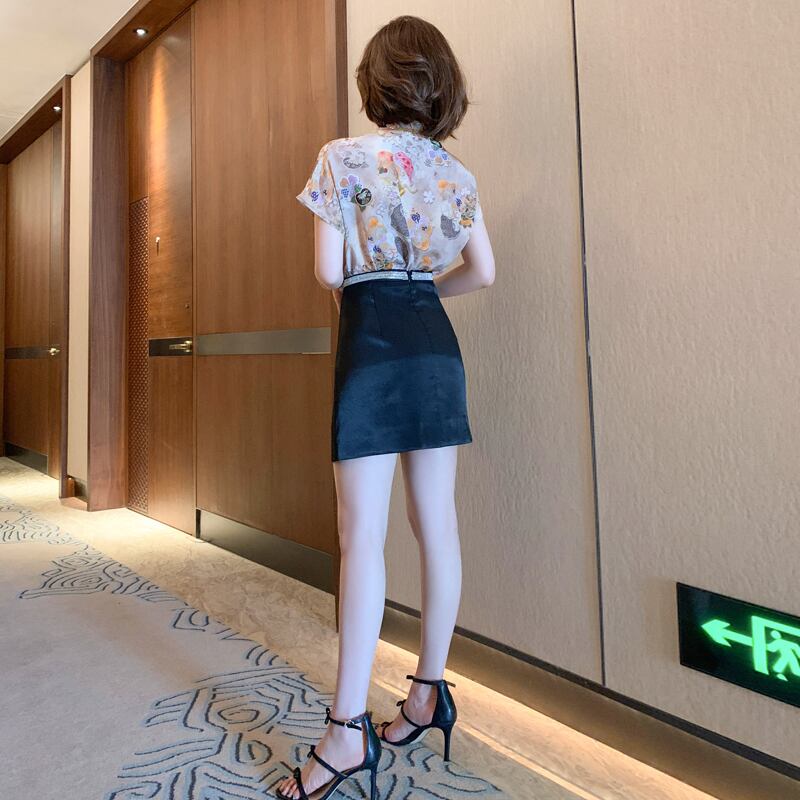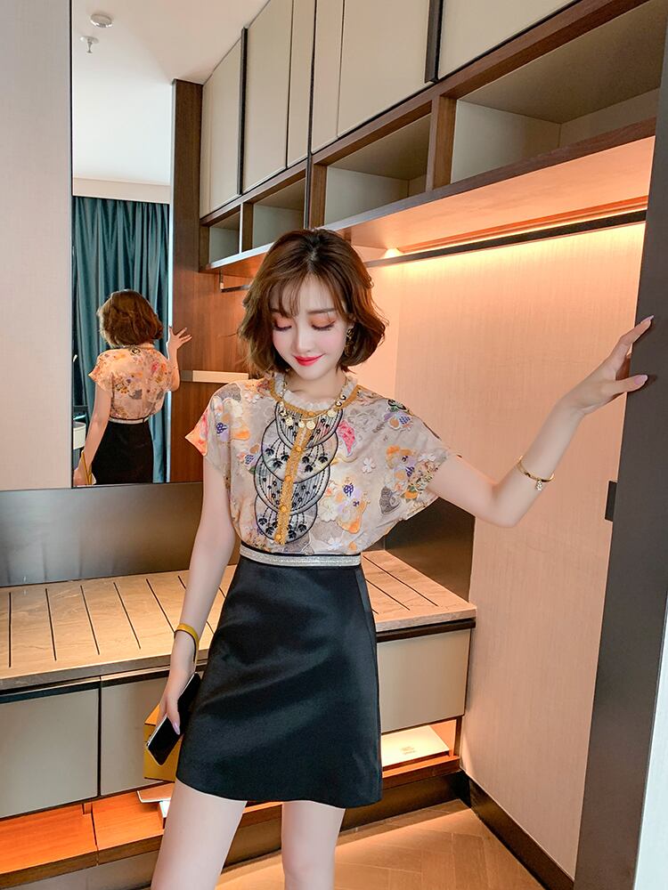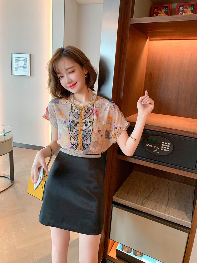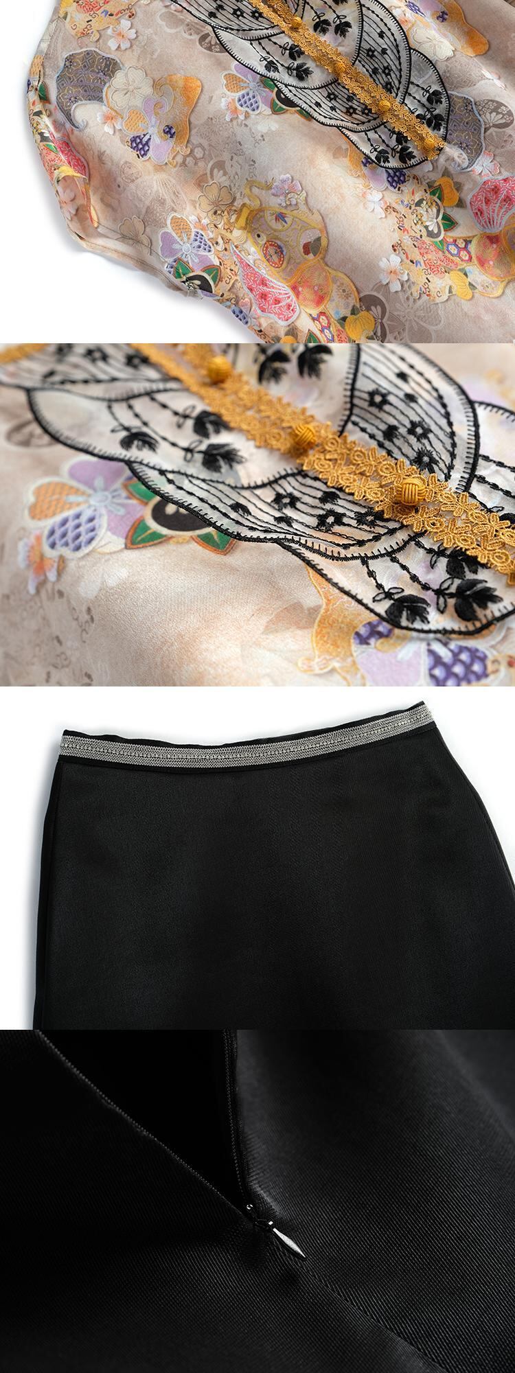 レースプリント柄ブラウス ハイウェストウェストAラインスカート スプリングサマー 春物 夏物 シルク MIUCO96675412117