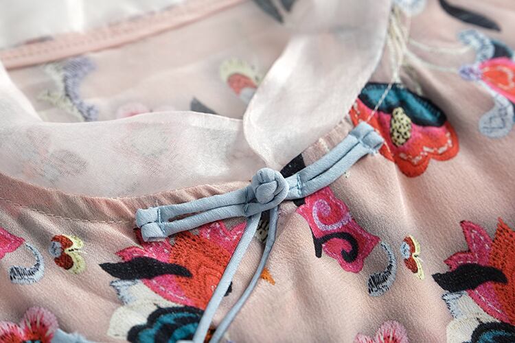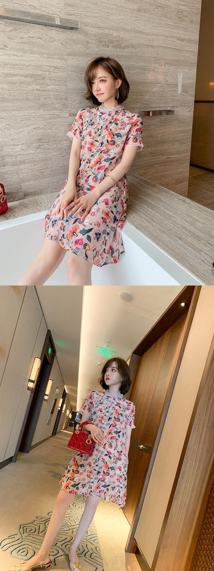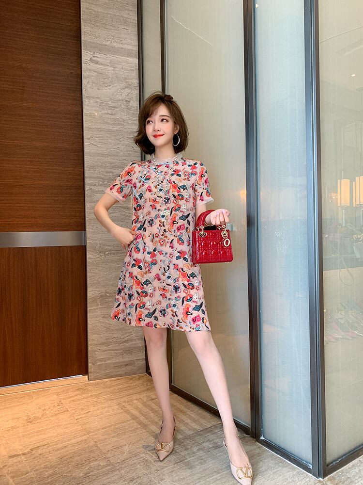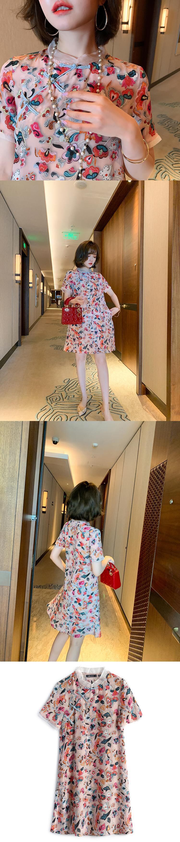 スタンドカラーカラーバックルスタンダードプリントメッシュドレス スプリングサマー レトロ 春物 夏物 シルク ステッチ MIUCO8497174079