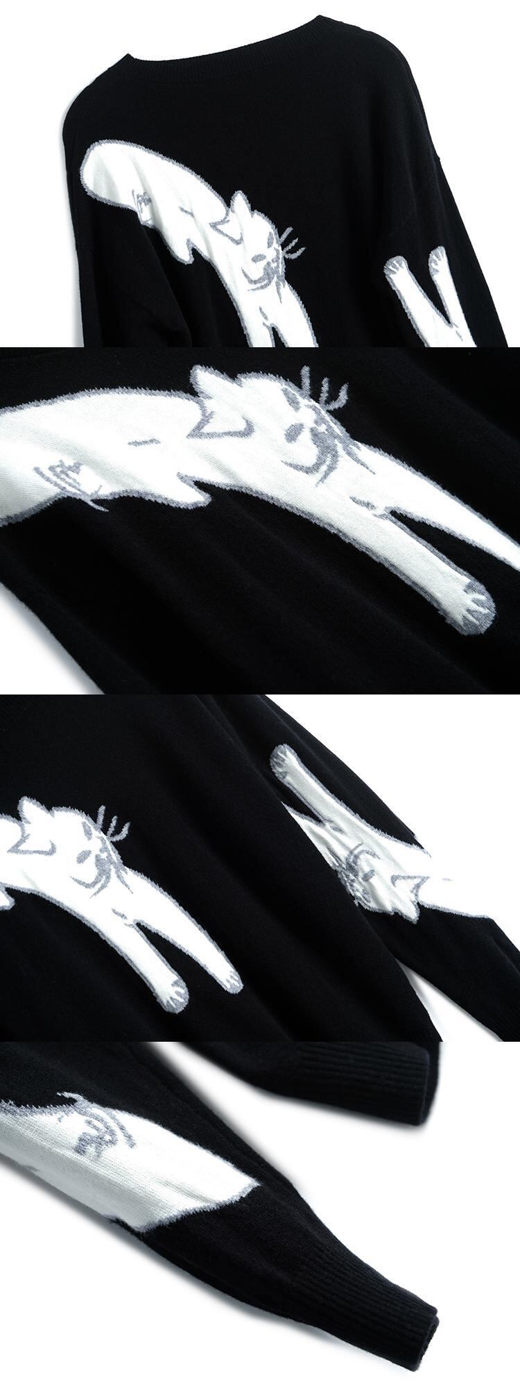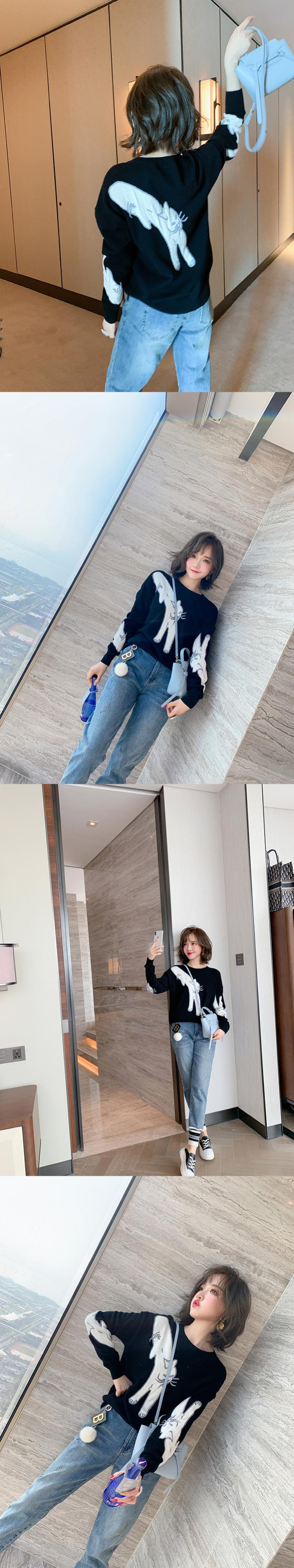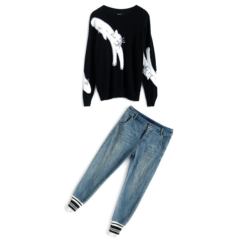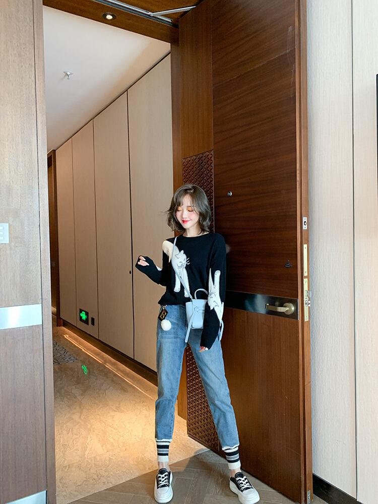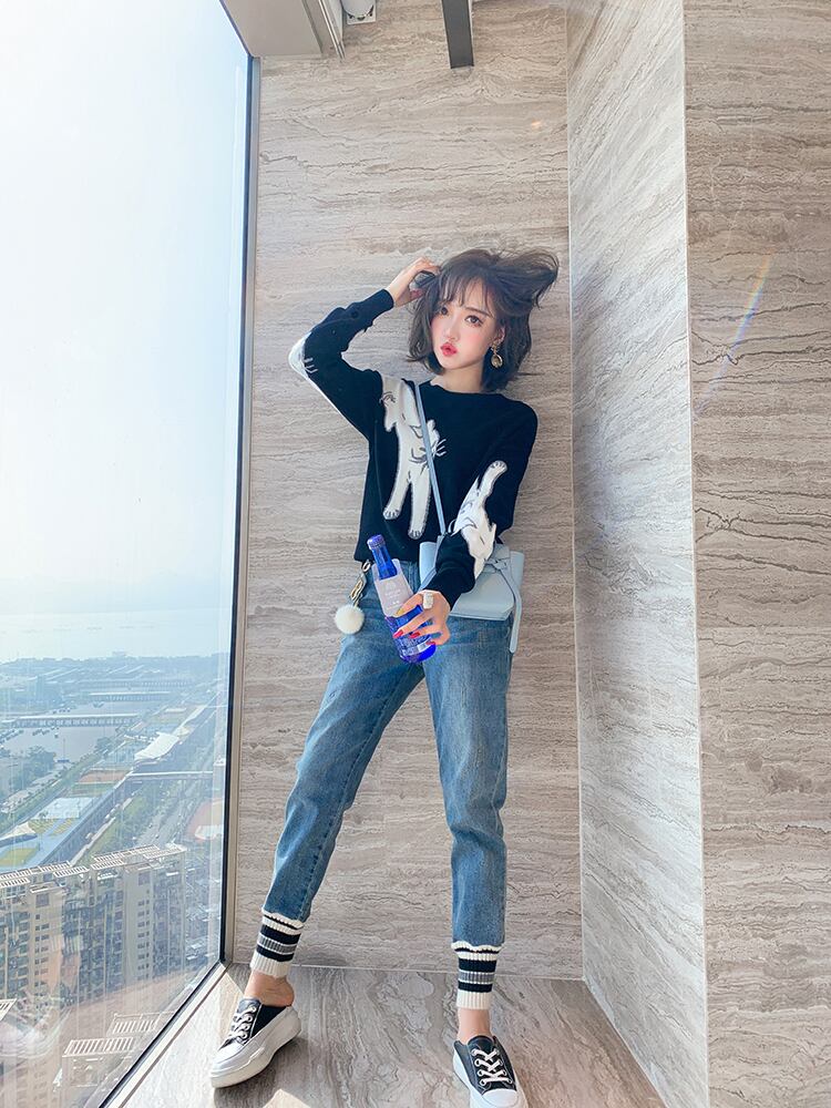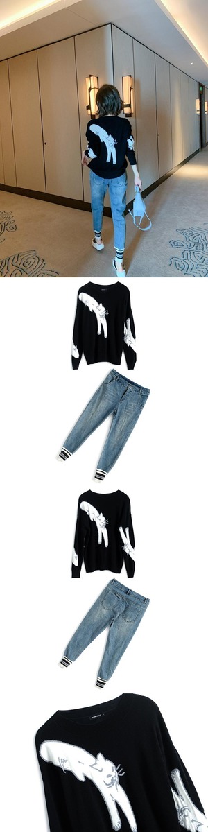 ラウンドネックジャカードルーズセーター ストライプニットジーンズ レディースウィンター 冬物 Oネック MIUCO12104445371