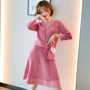Vネック薄手ニットセーター ストライプハイウェストウェストAラインスカート オータム 秋物 MIUCO10857433699