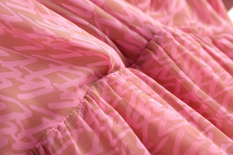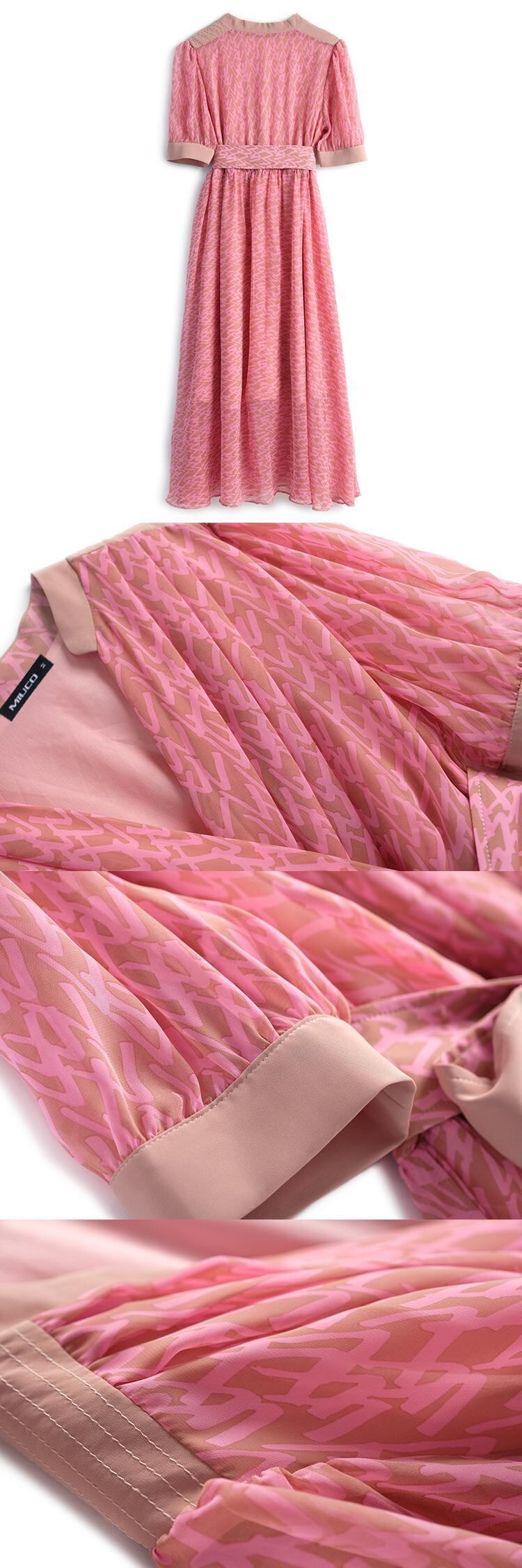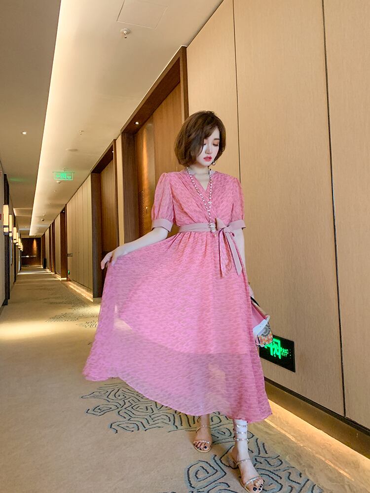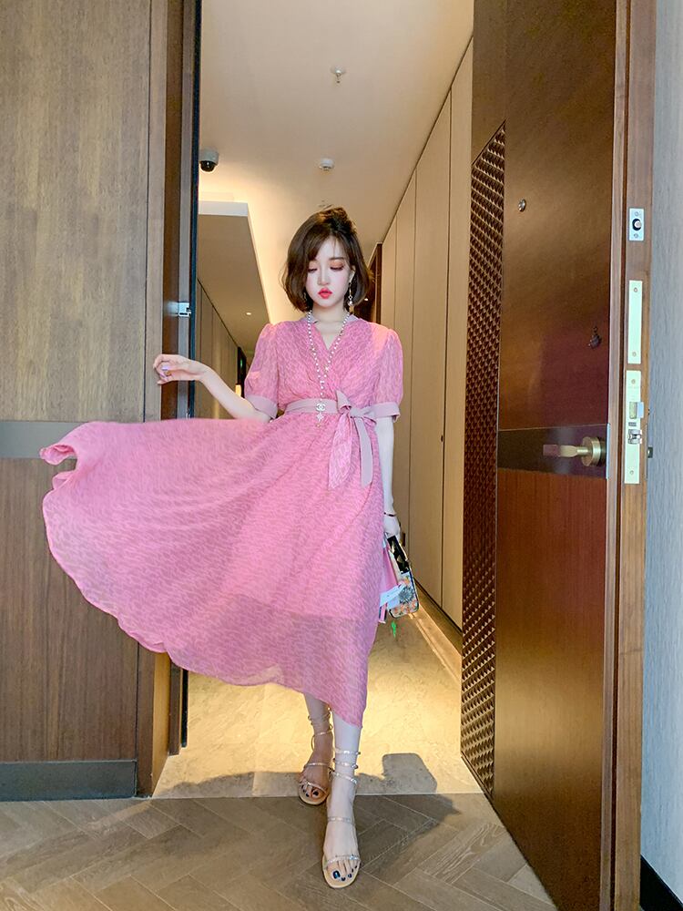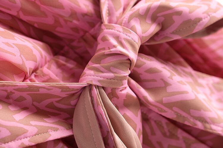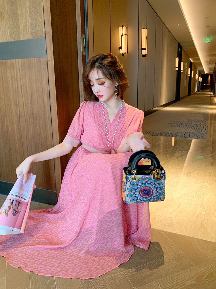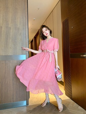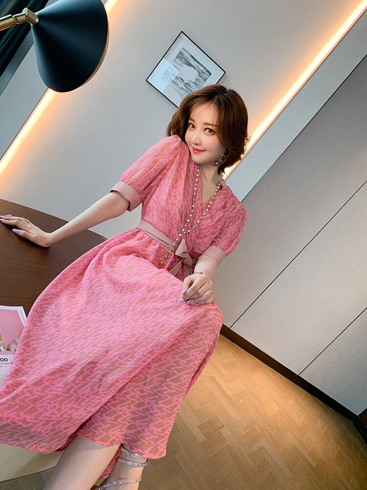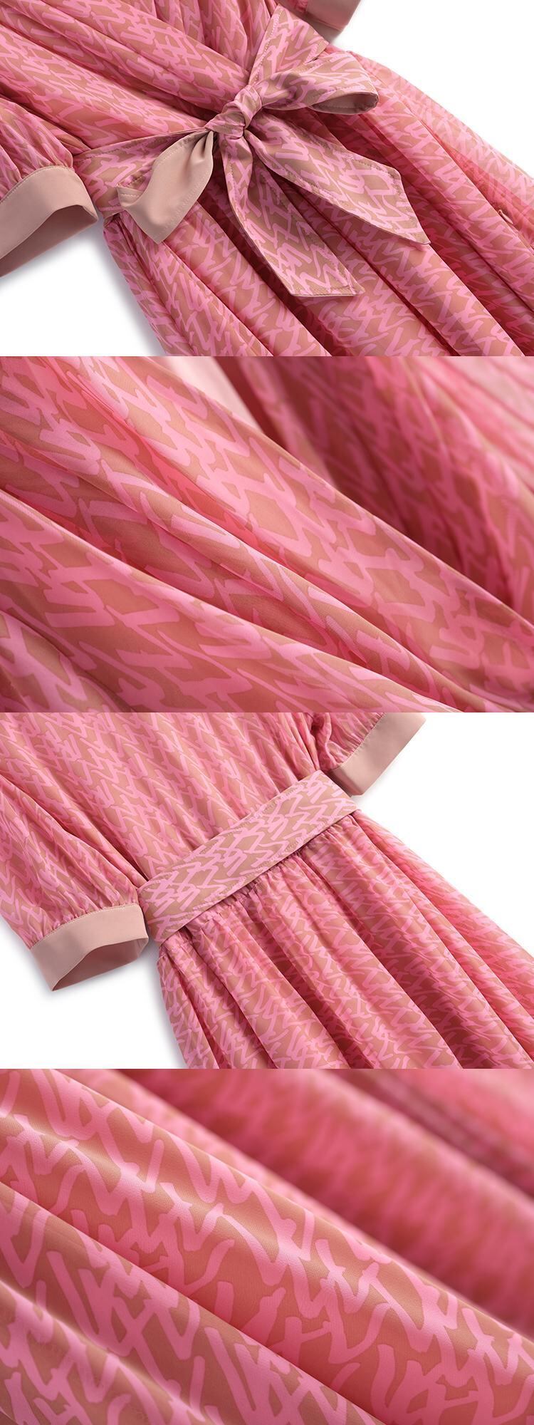 プリント柄Vネックウェストリボンスリーブドレス サマー ランタンスリーブ 夏物 MIUCO6771826640
