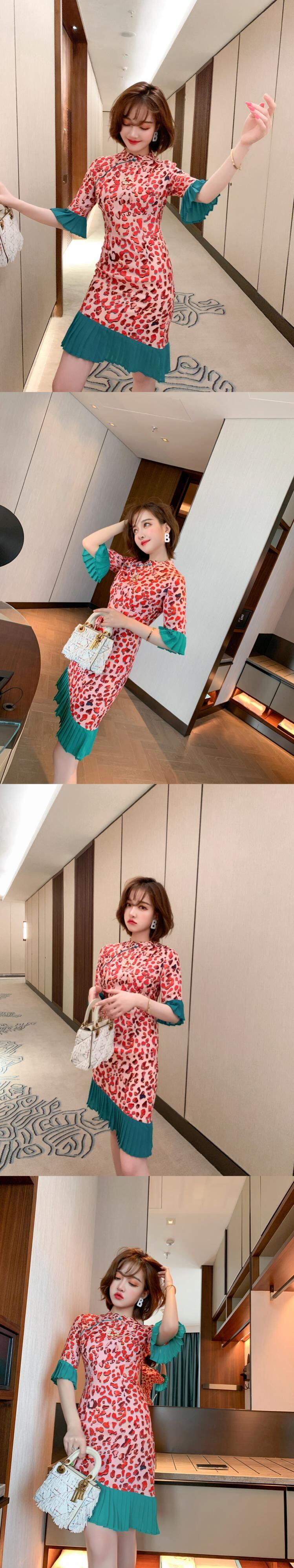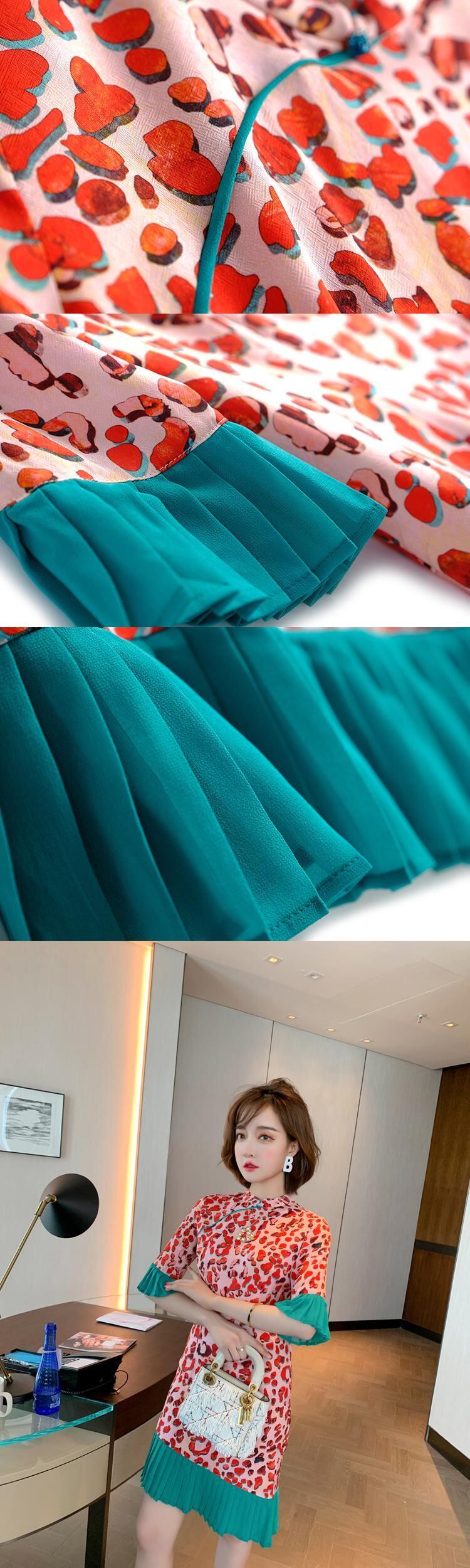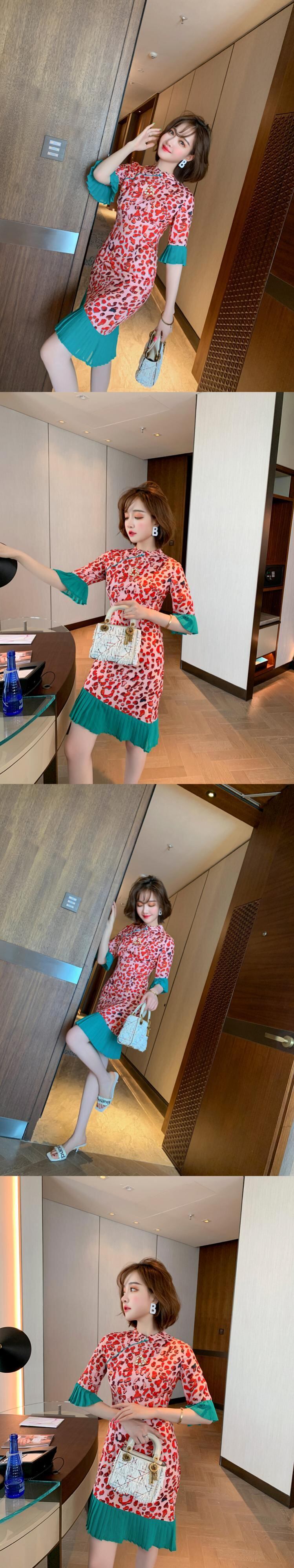 プリントスタンドカラーカラープリーツスリムウェストドレス サマー 夏物 ステッチ MIUCO49838580973