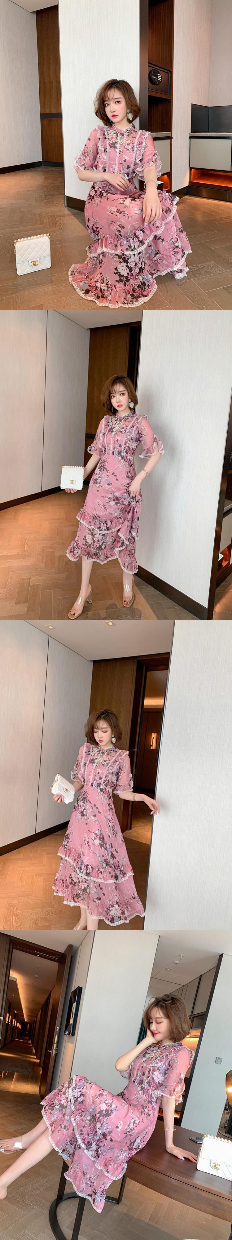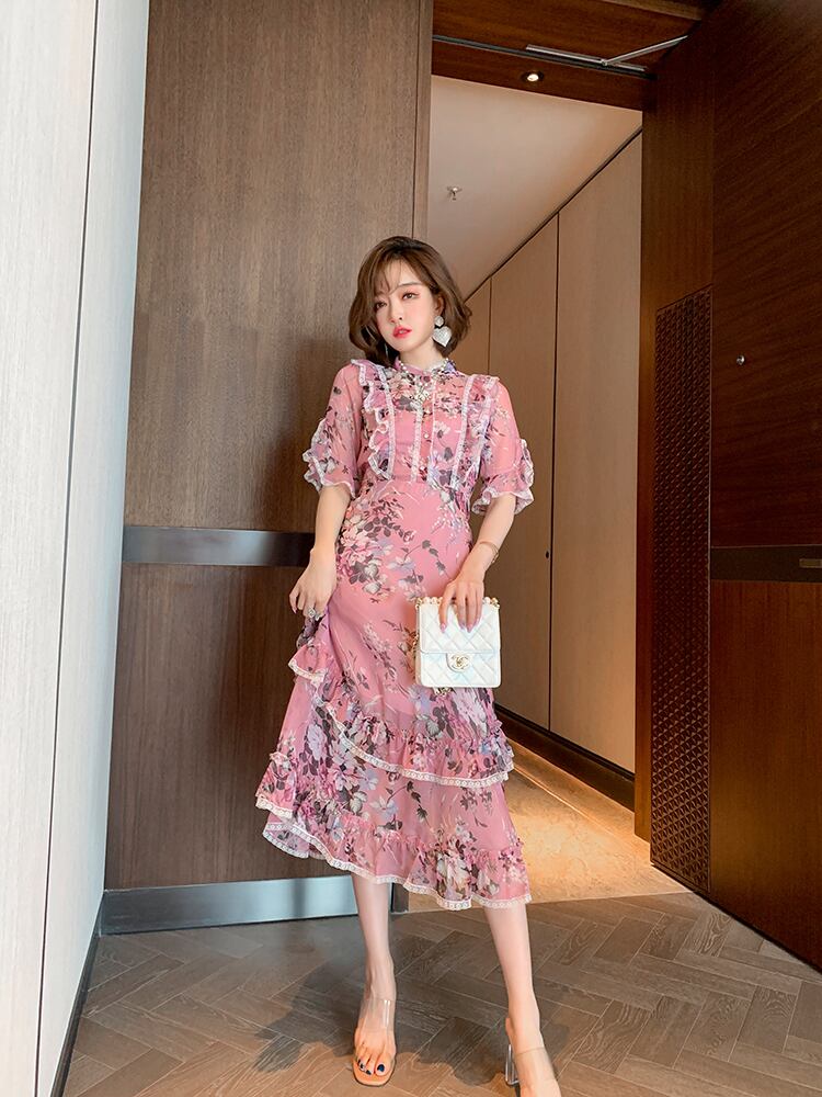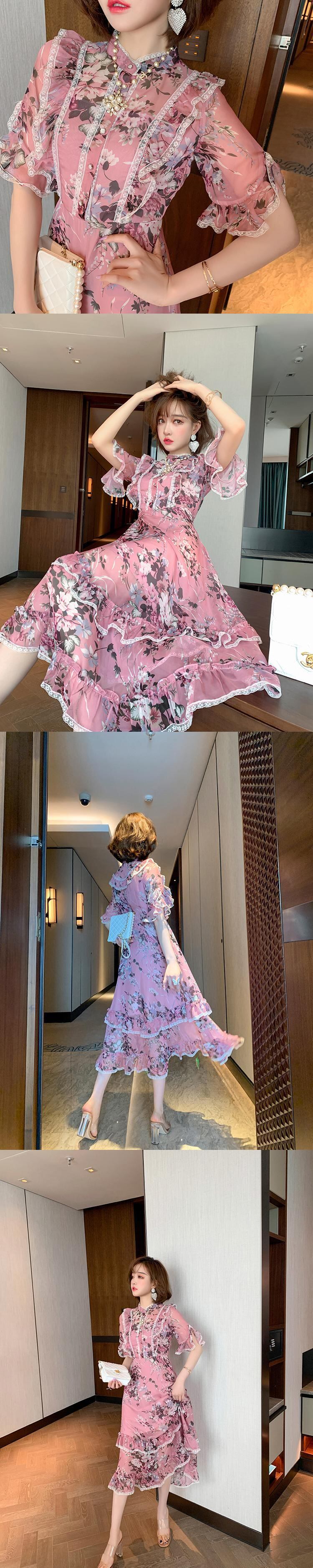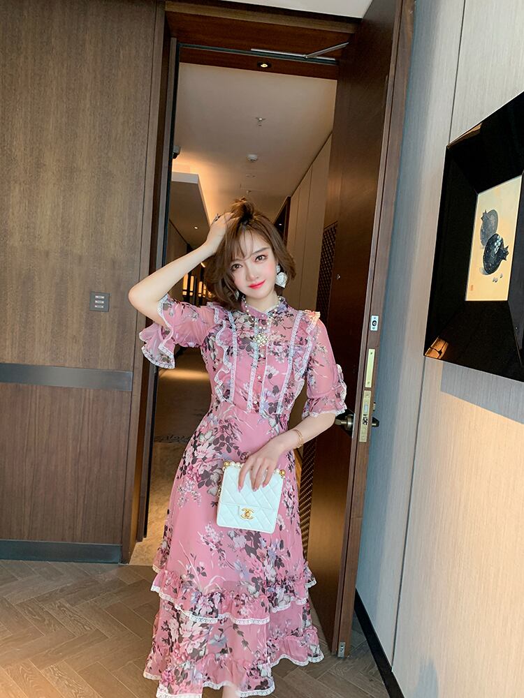 プリント柄スタンドカラーカラーレースハイウェストウェストドレス サマー エレガント 夏物 ステッチ MIUCO19038129928