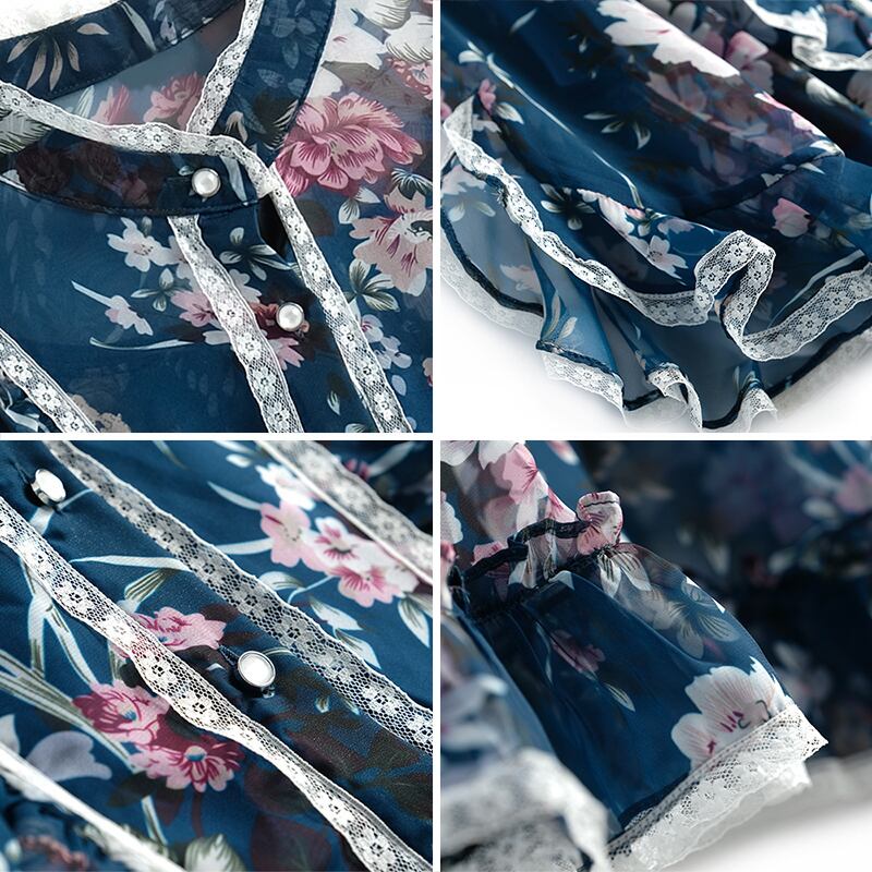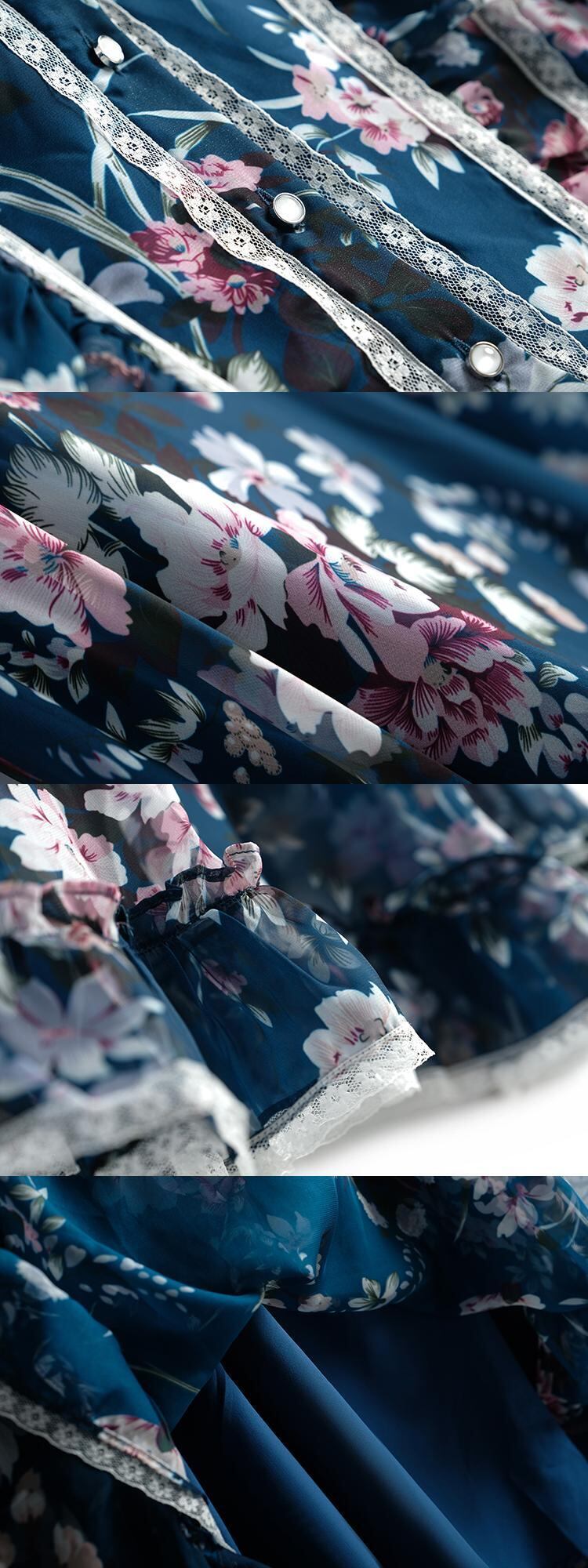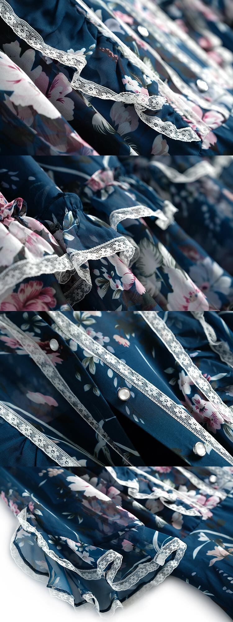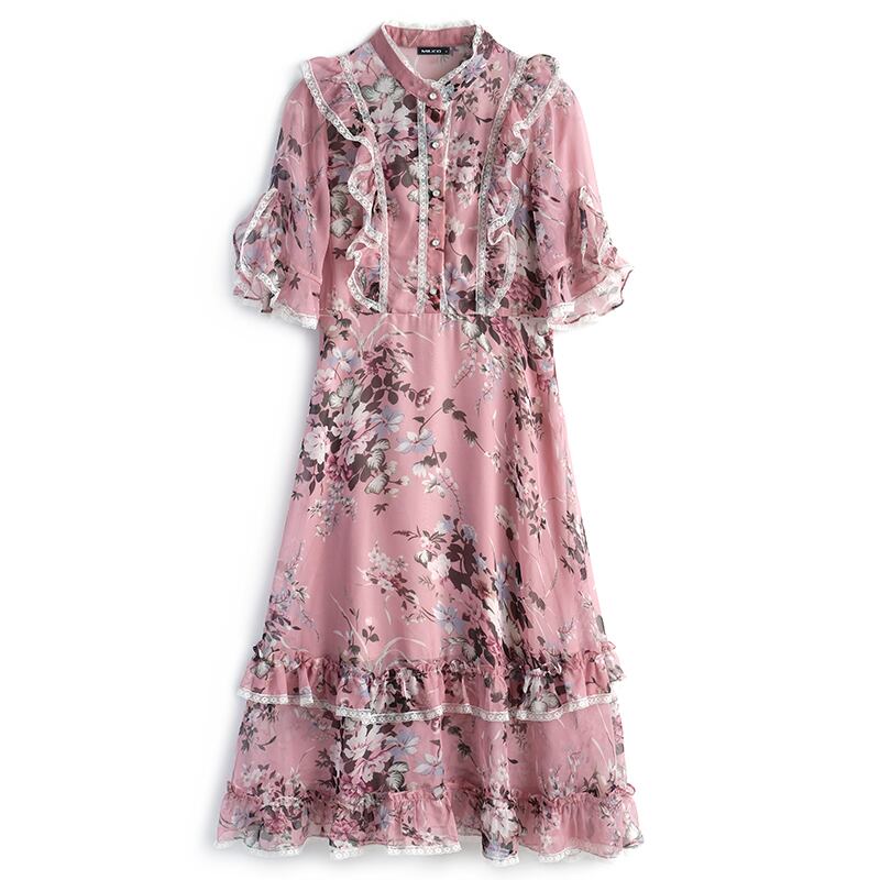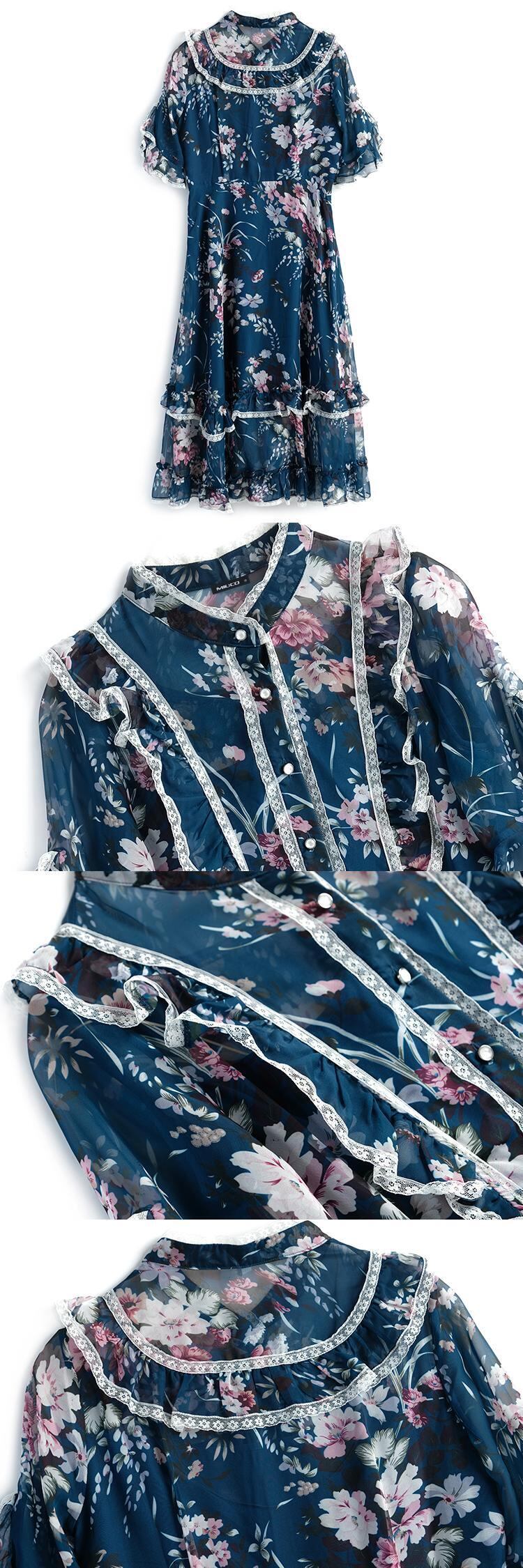 プリント柄スタンドカラーカラーレースハイウェストウェストドレス サマー エレガント 夏物 ステッチ MIUCO19038129928