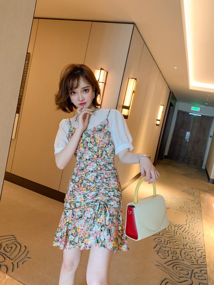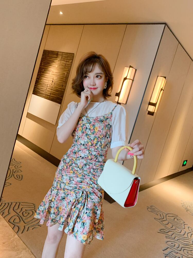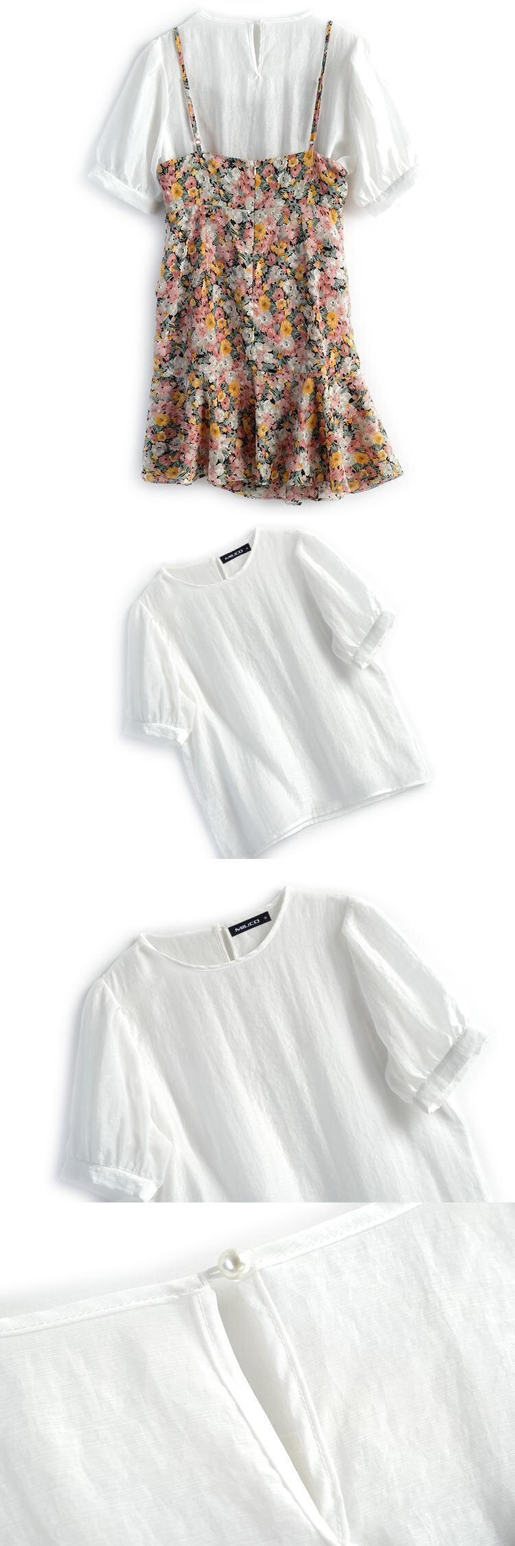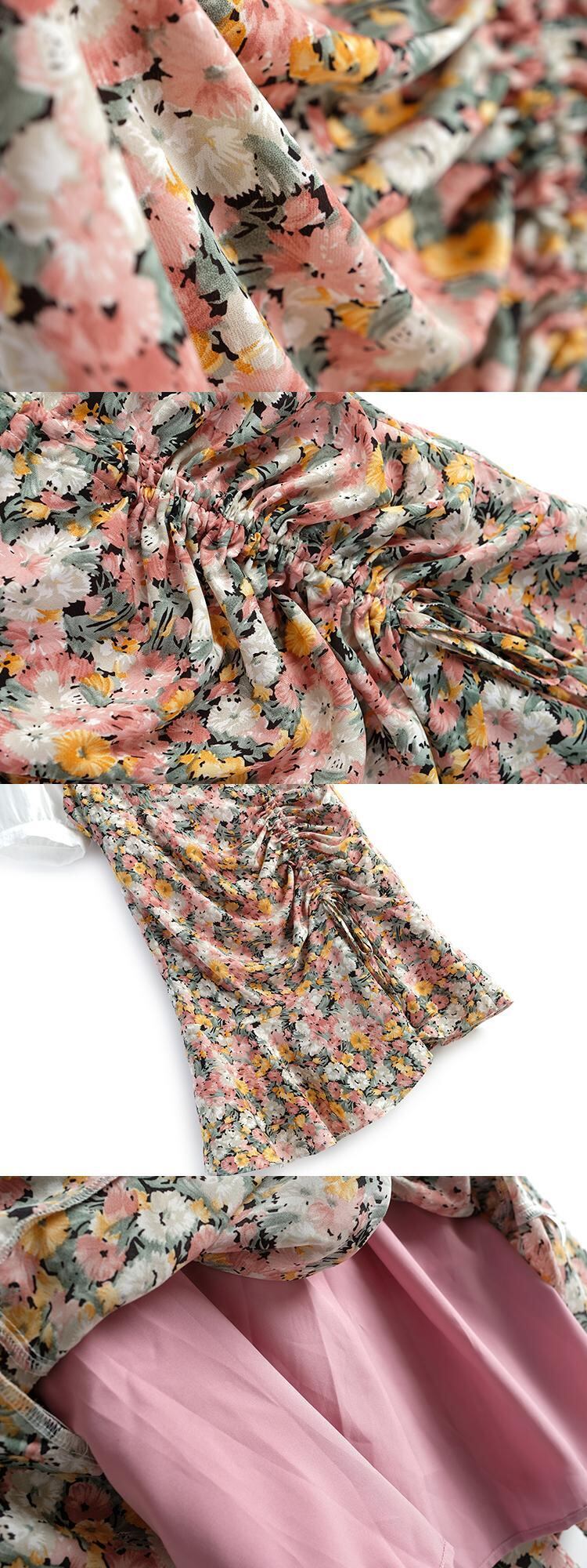 スタンダードスリーブトップス プリント柄プリーツドレス サマー ランタンスリーブ レトロ 夏物 MIUCO924898103