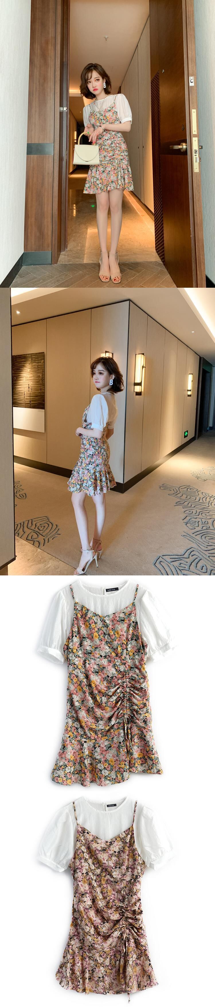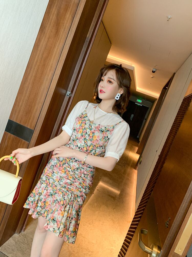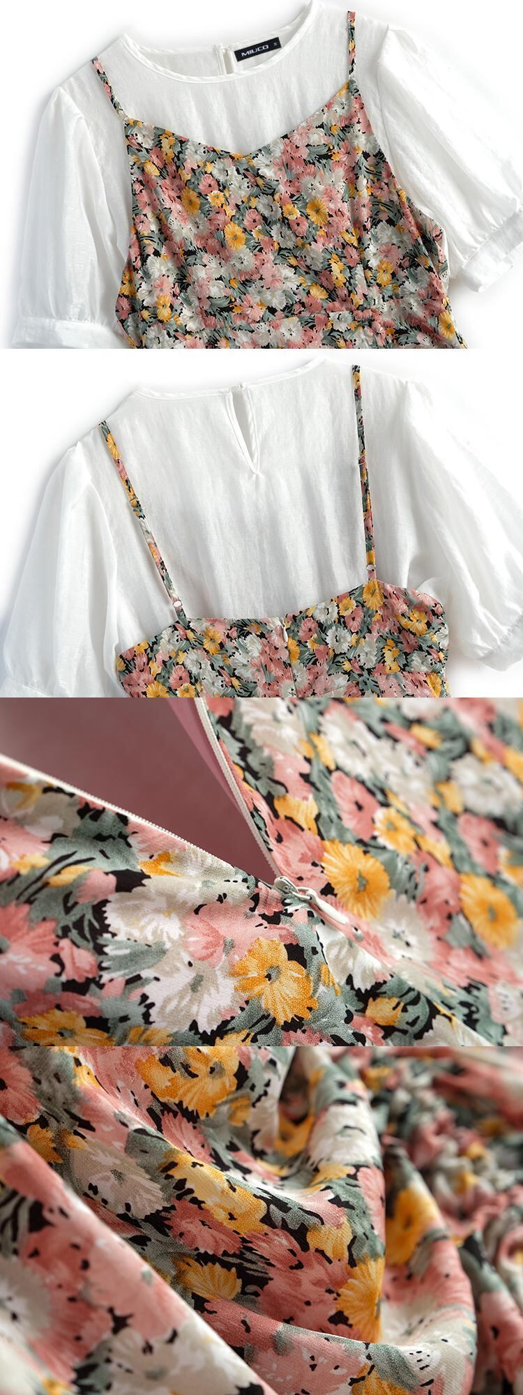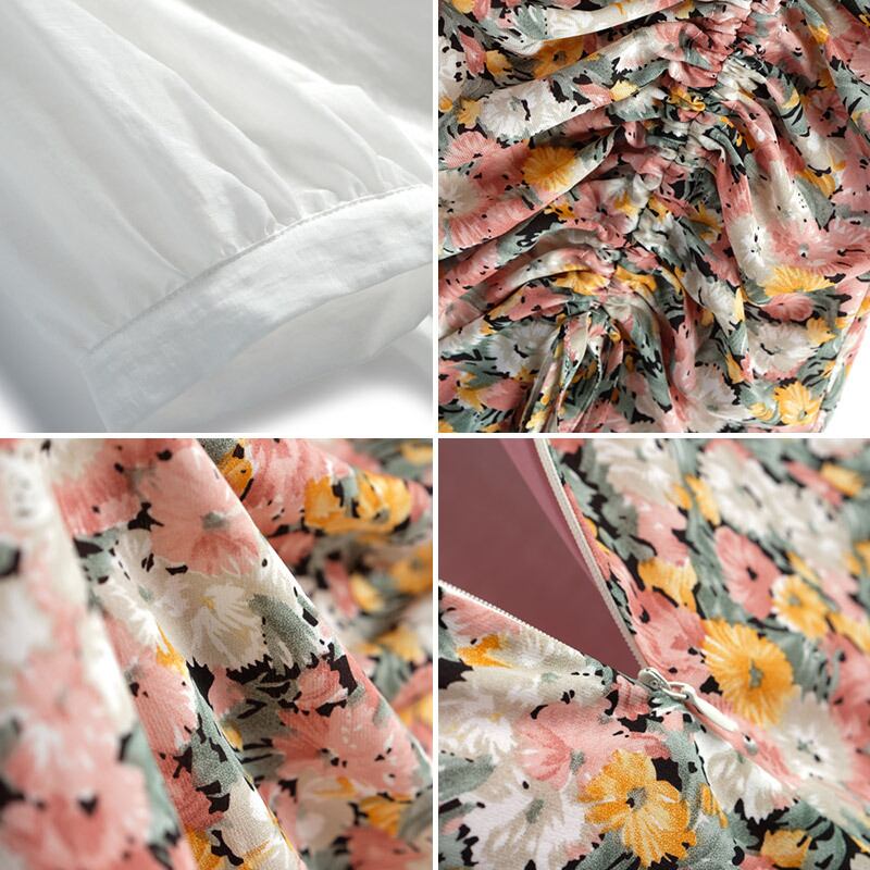 スタンダードスリーブトップス プリント柄プリーツドレス サマー ランタンスリーブ レトロ 夏物 MIUCO924898103
