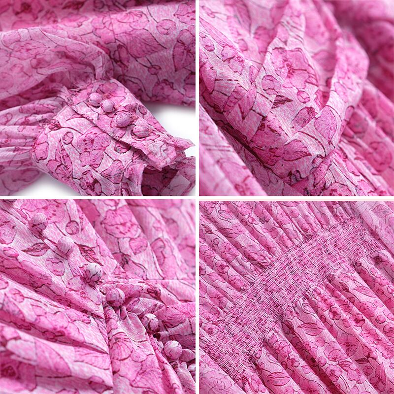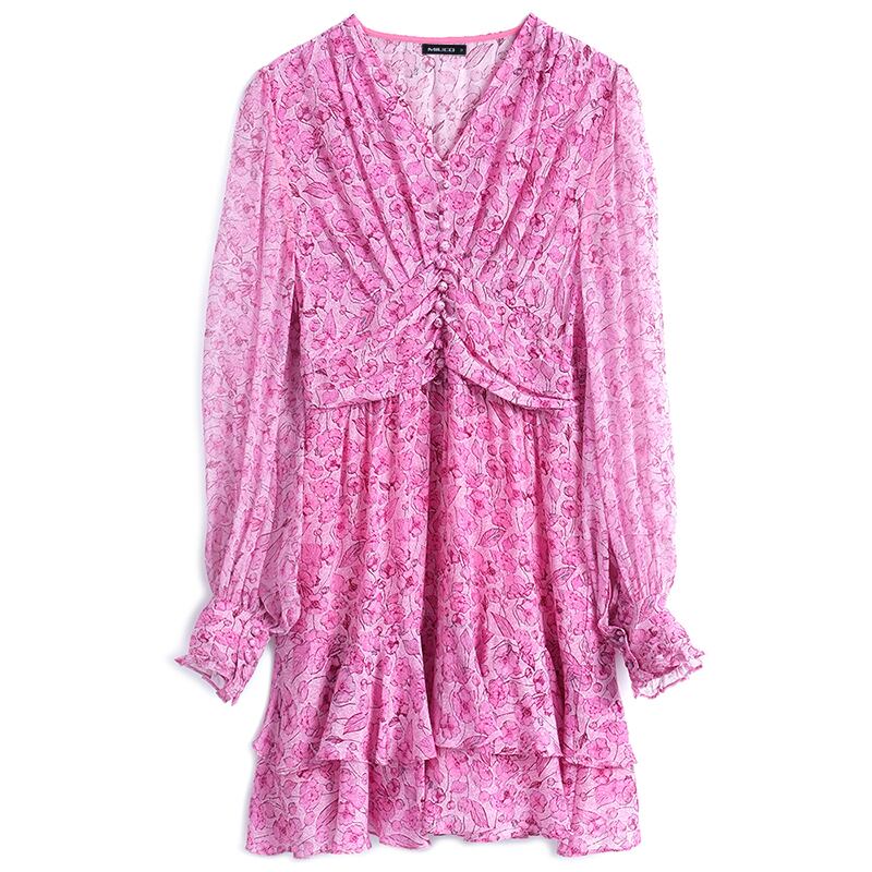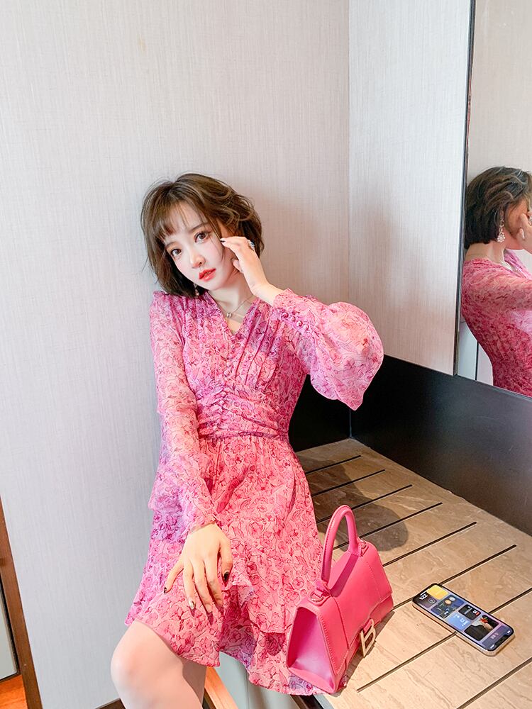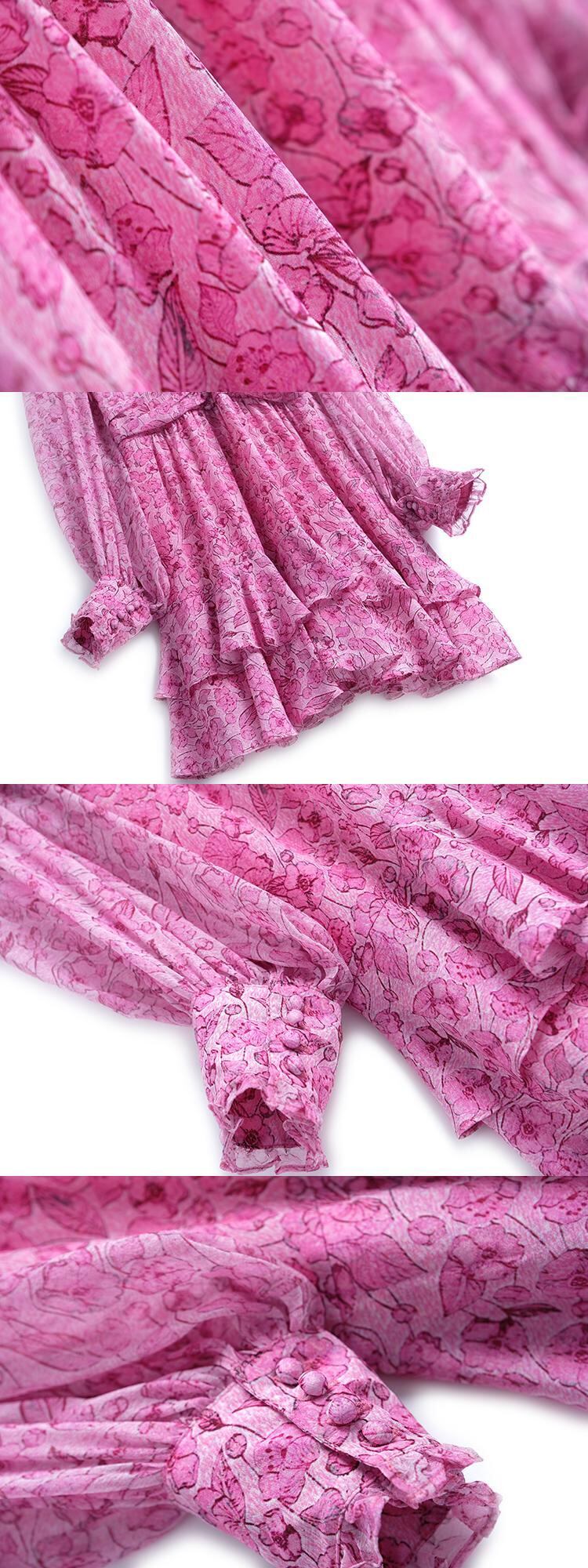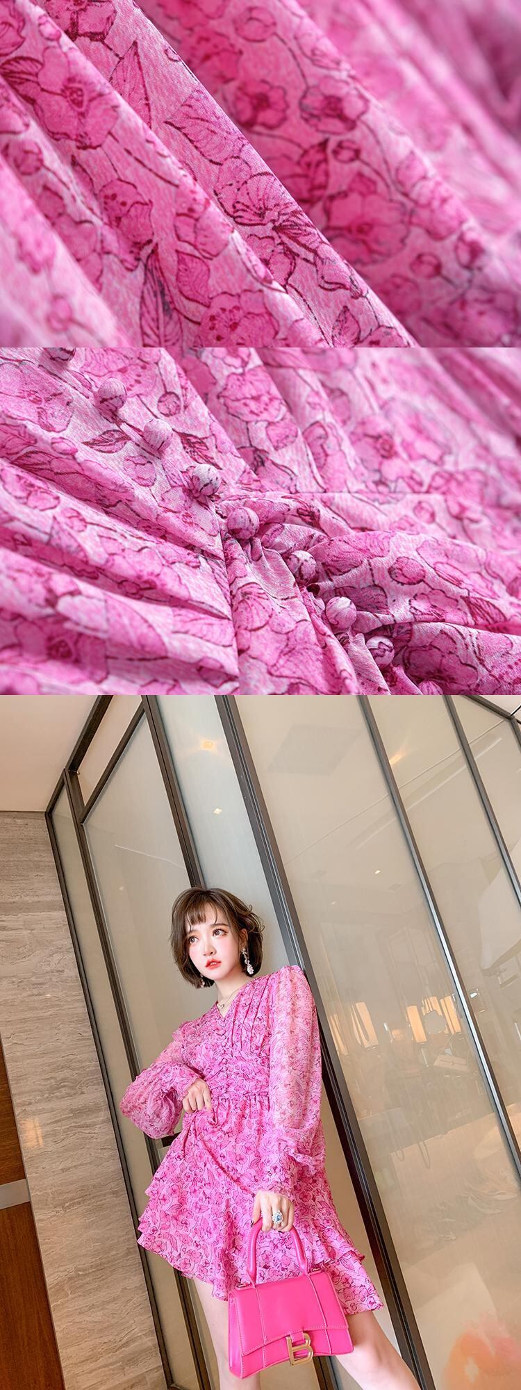 ボタンスリーブプリーツウェストプリントVネックドレス スプリング ランタンスリーブ 春物 シルク MIUCO68207486541