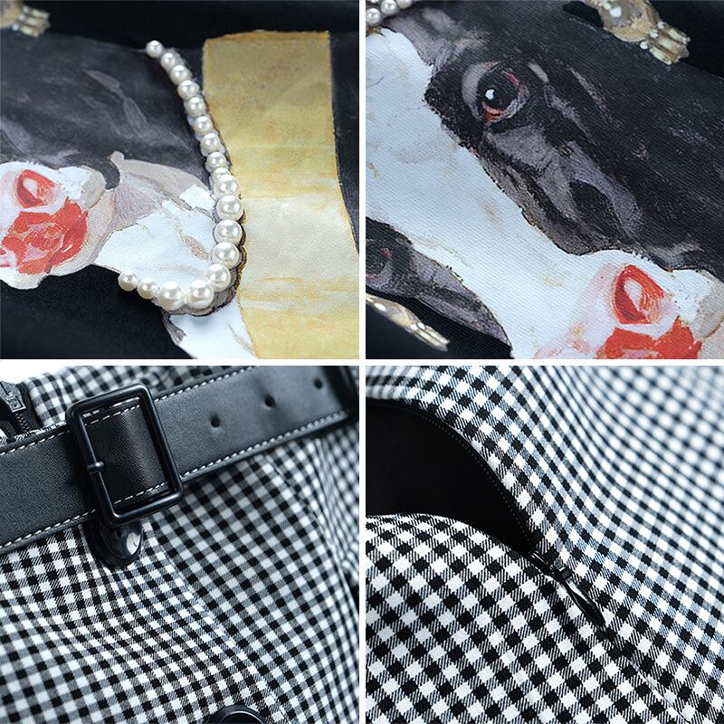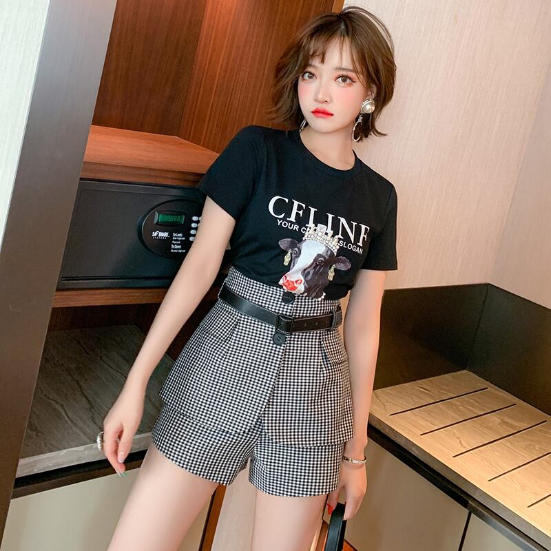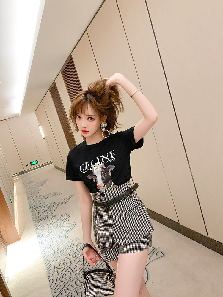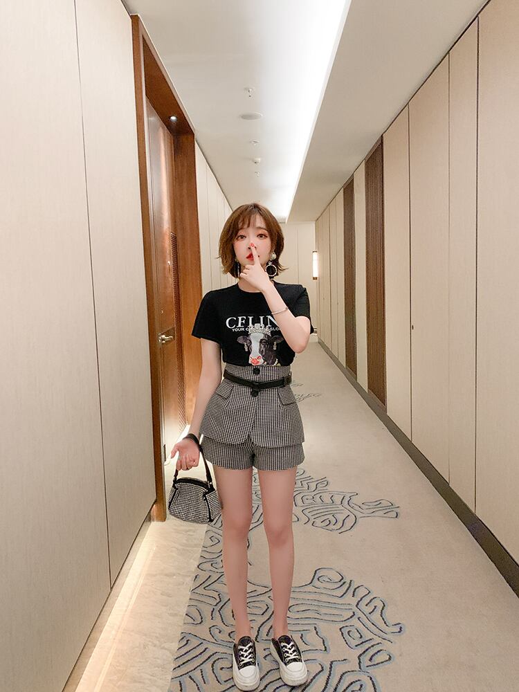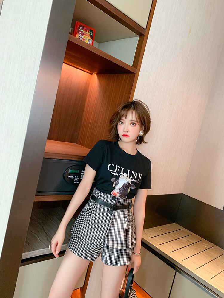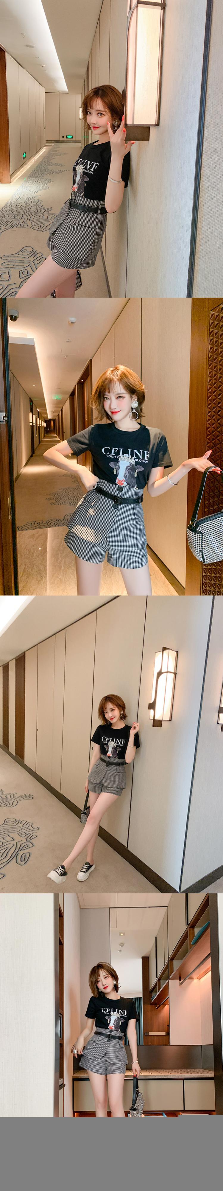 ラウンドネックプリントTシャツ ダブル格子柄ショーツ スプリング 春物 ブルマー Oネック ステッチ MIUCO96336768147