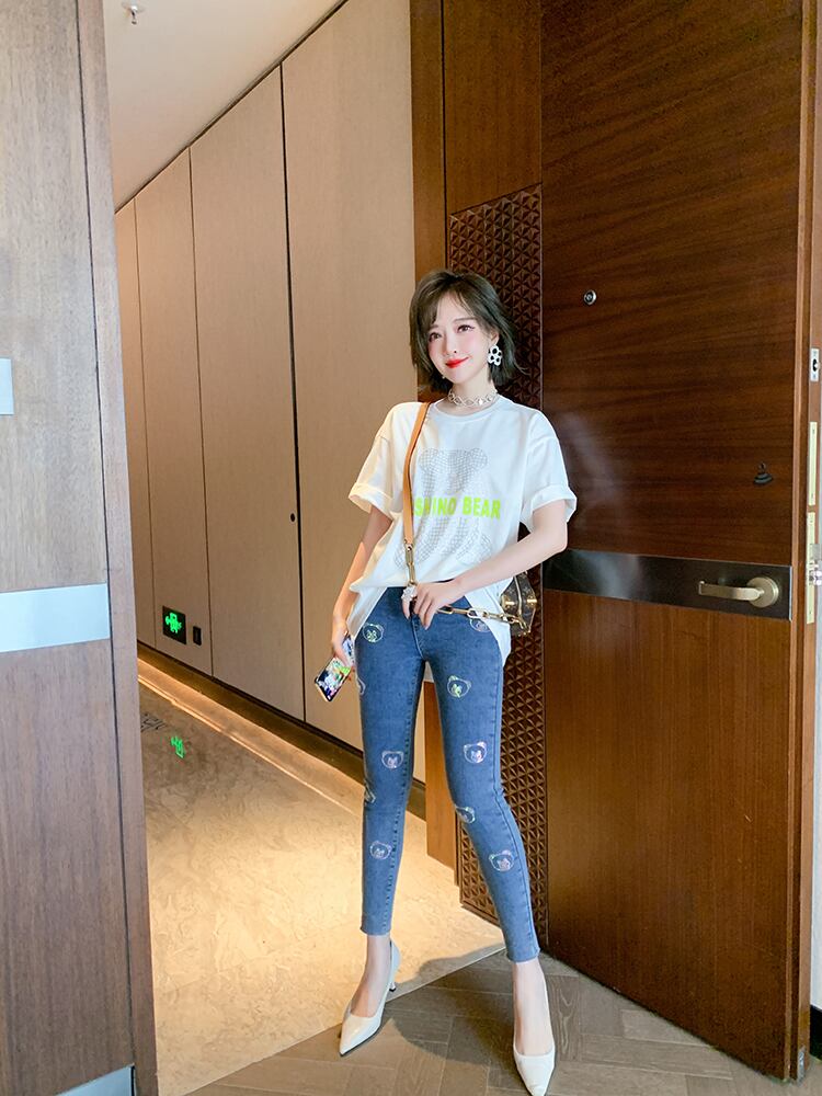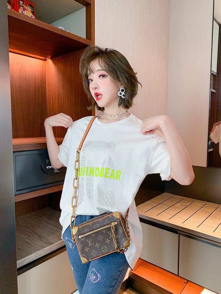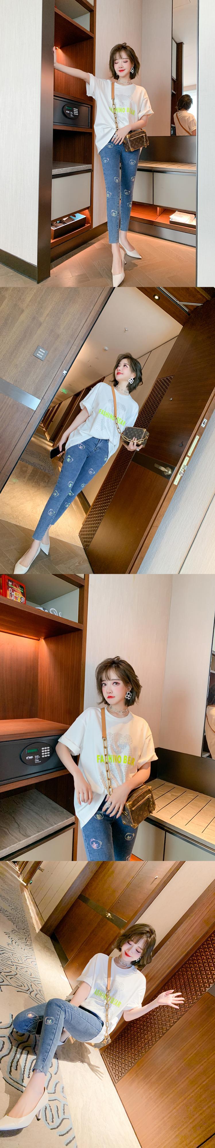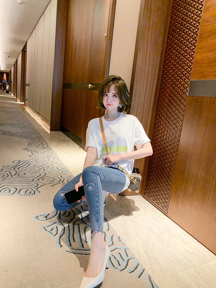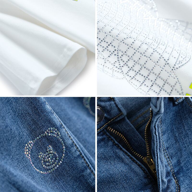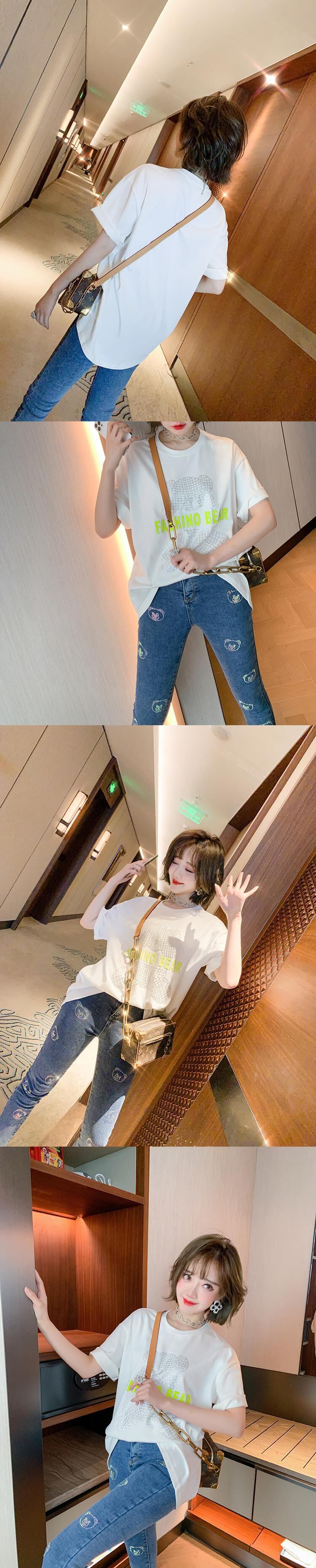 ラウンドネック半袖スリーブTシャツ ラインストーンスリムジーンズ セット スプリング ショート ハーフスリーブ 春物 Oネック MIUCO55593904437