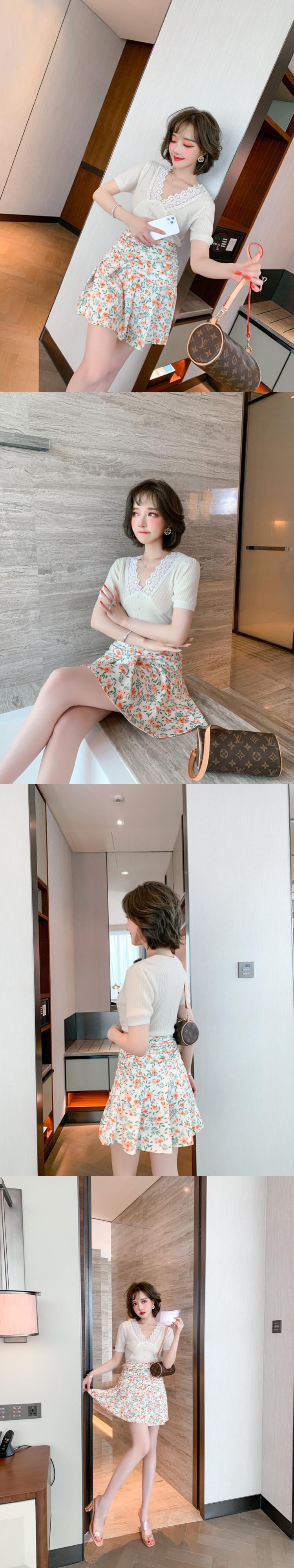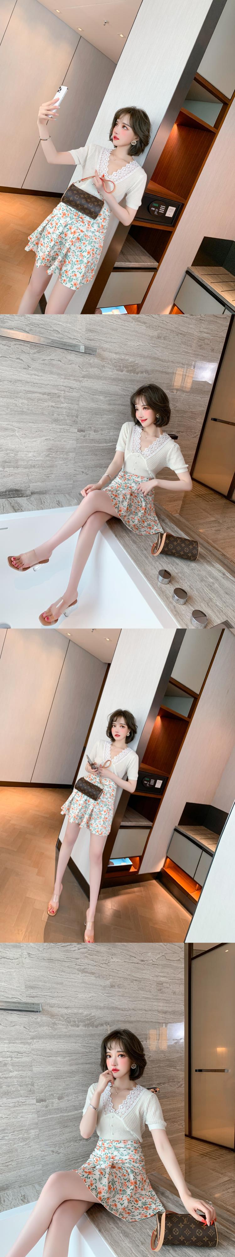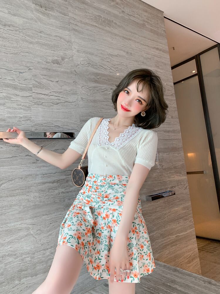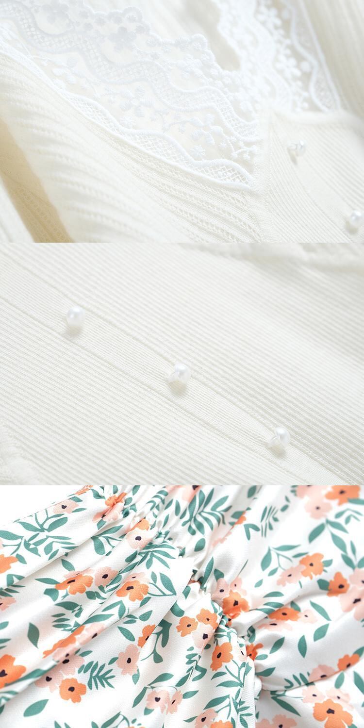 レースVネックボタンセーター ハイウェストウェストプリーツフローラルスカート スプリングサマー 春物 夏物 花柄 MIUCO9064375160