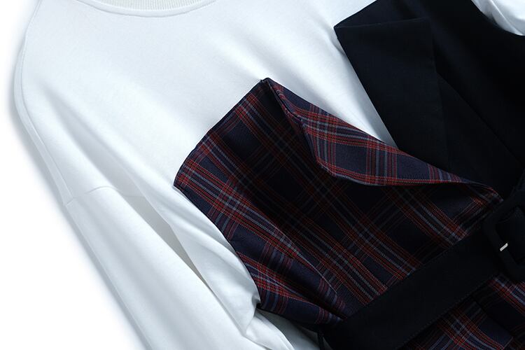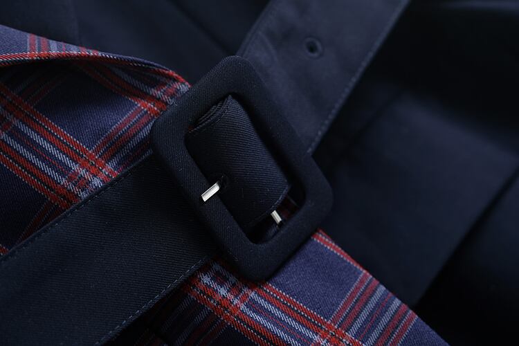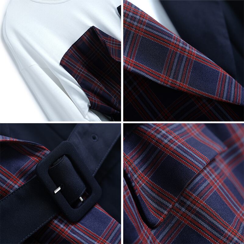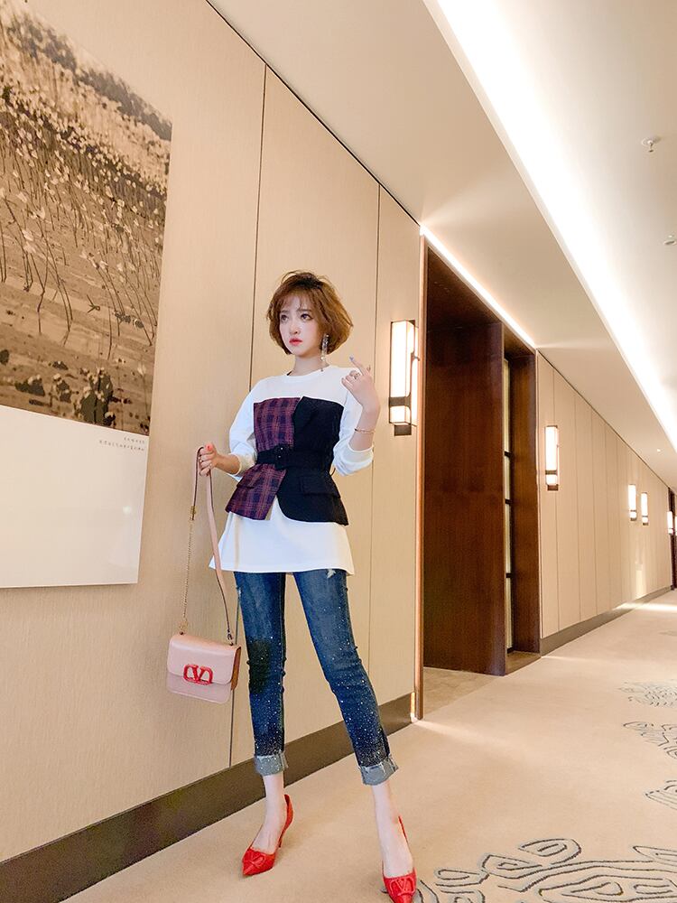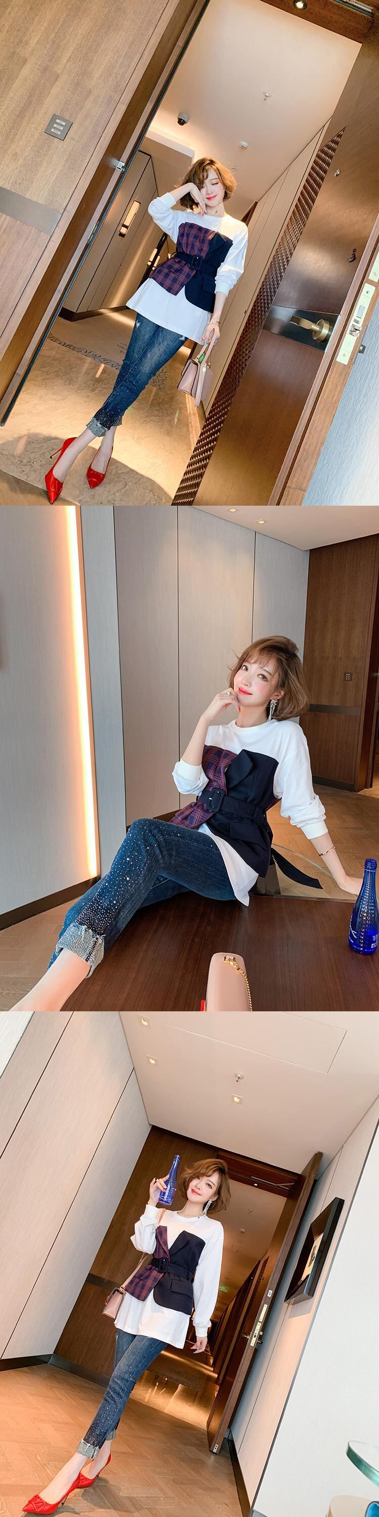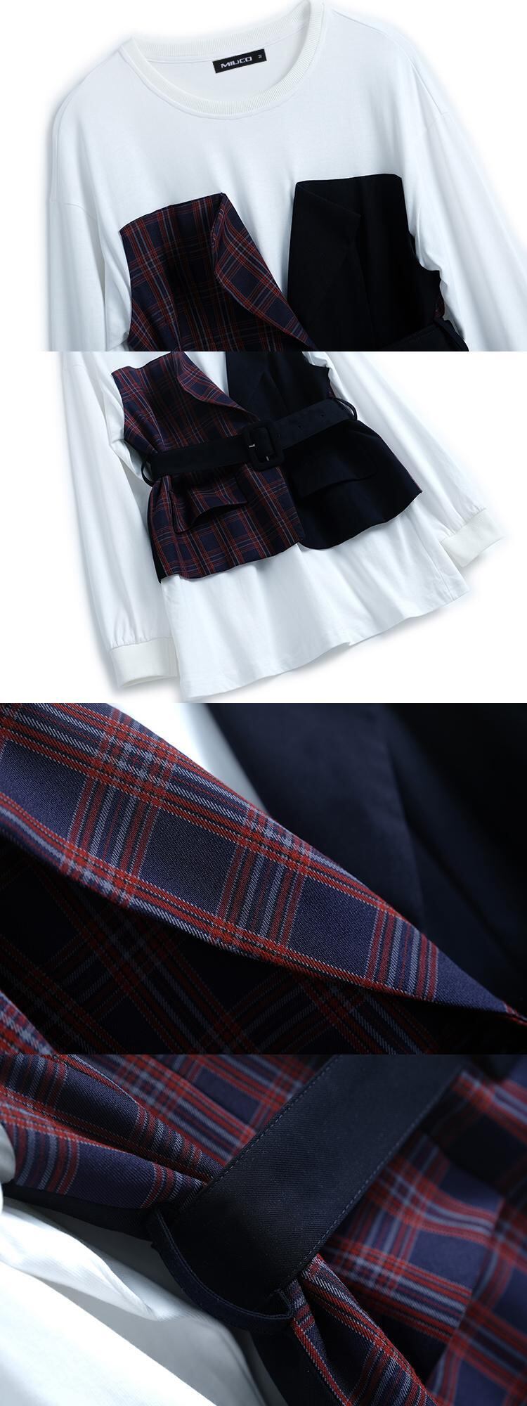 ツーピース格子柄ベルト ウェストラウンドネックセーター オータム 秋物 ハーネス Oネック ステッチ MIUCO50801640689