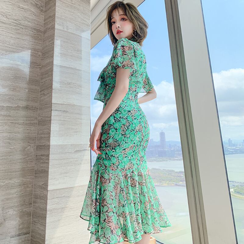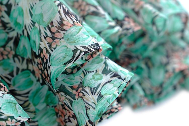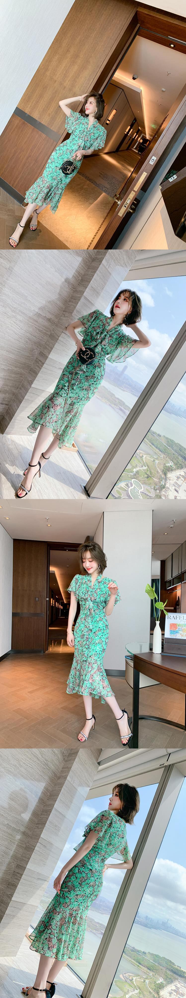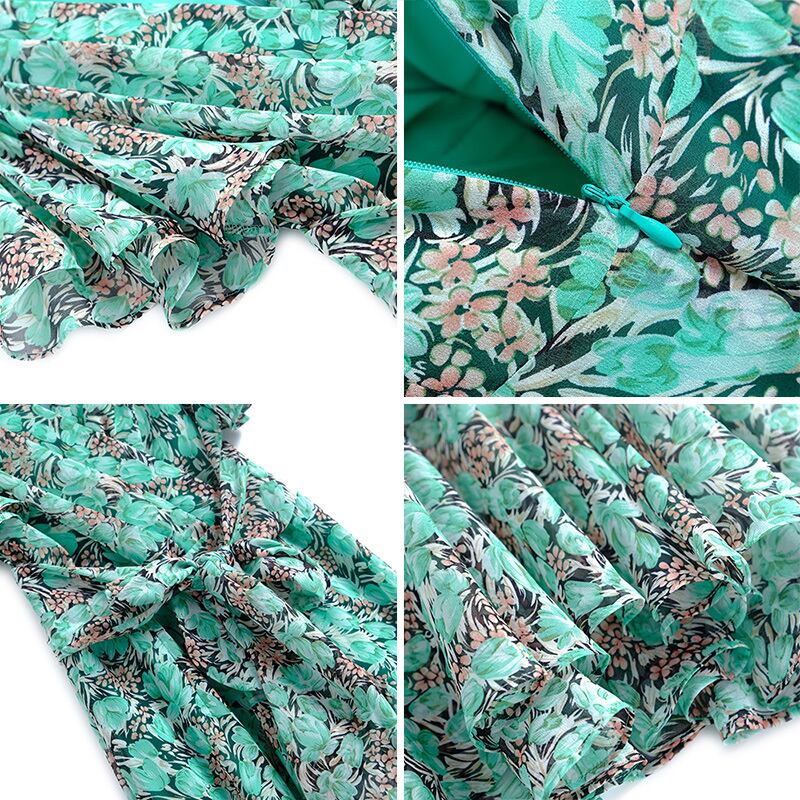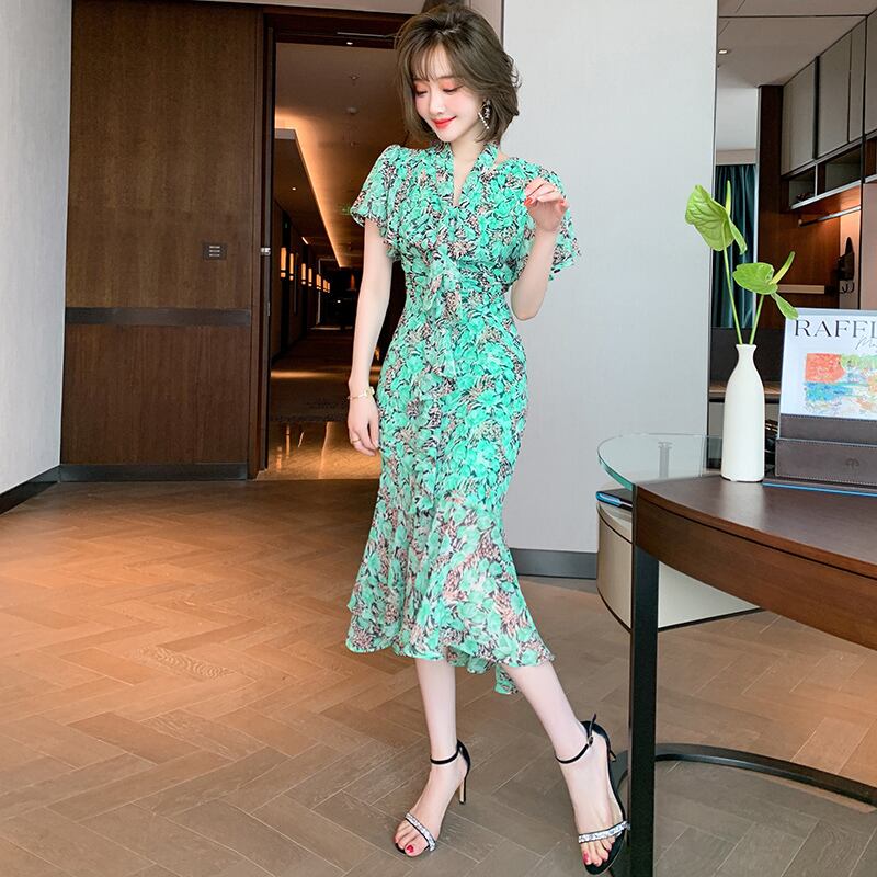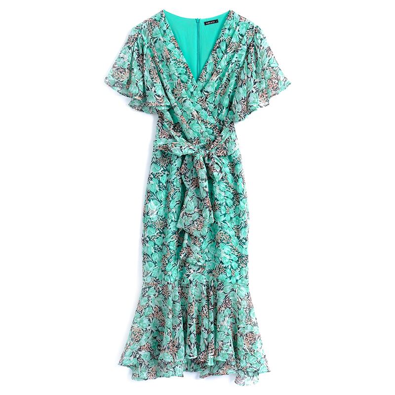 Vネックプリーツプリントドレス スプリングサマー リボン 春物 夏物 ステッチ MIUCO3595020184