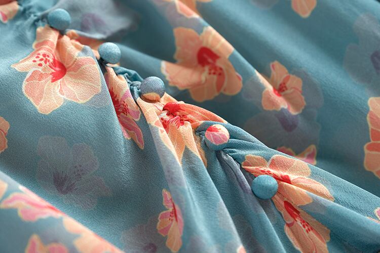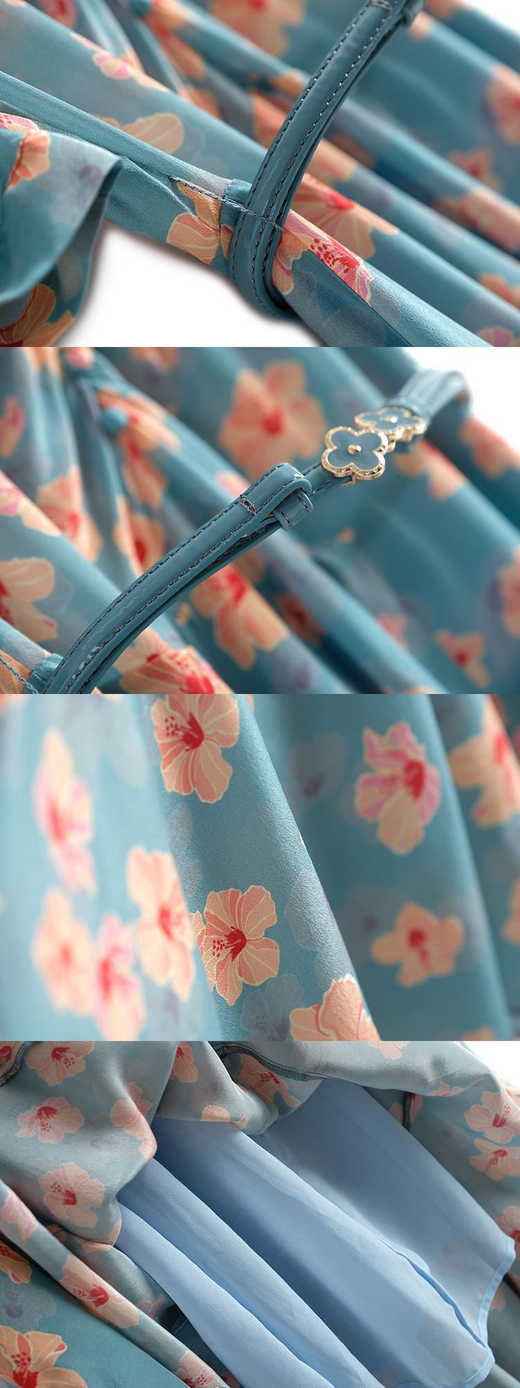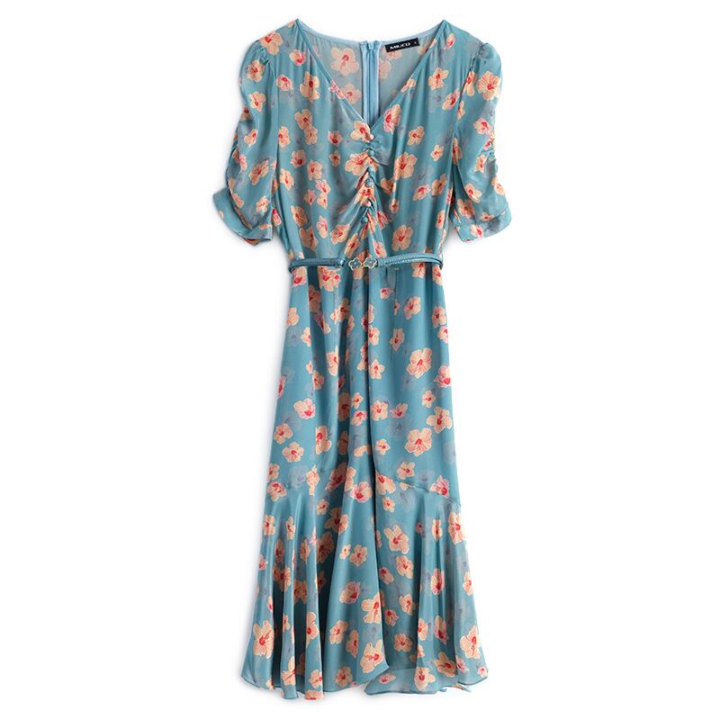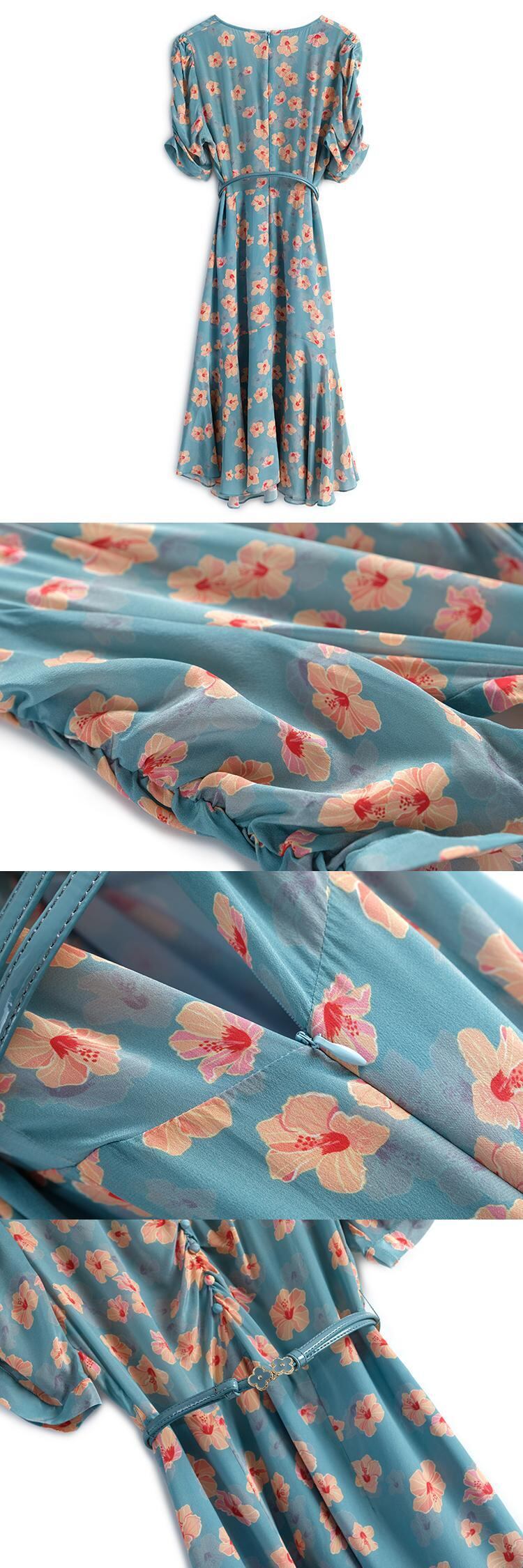 スタンダードプリントVネックバックルスリーブウェストフローラルドレス サマー レトロ 夏物 花柄 MIUCO6236970250