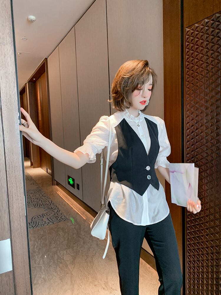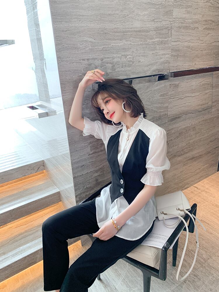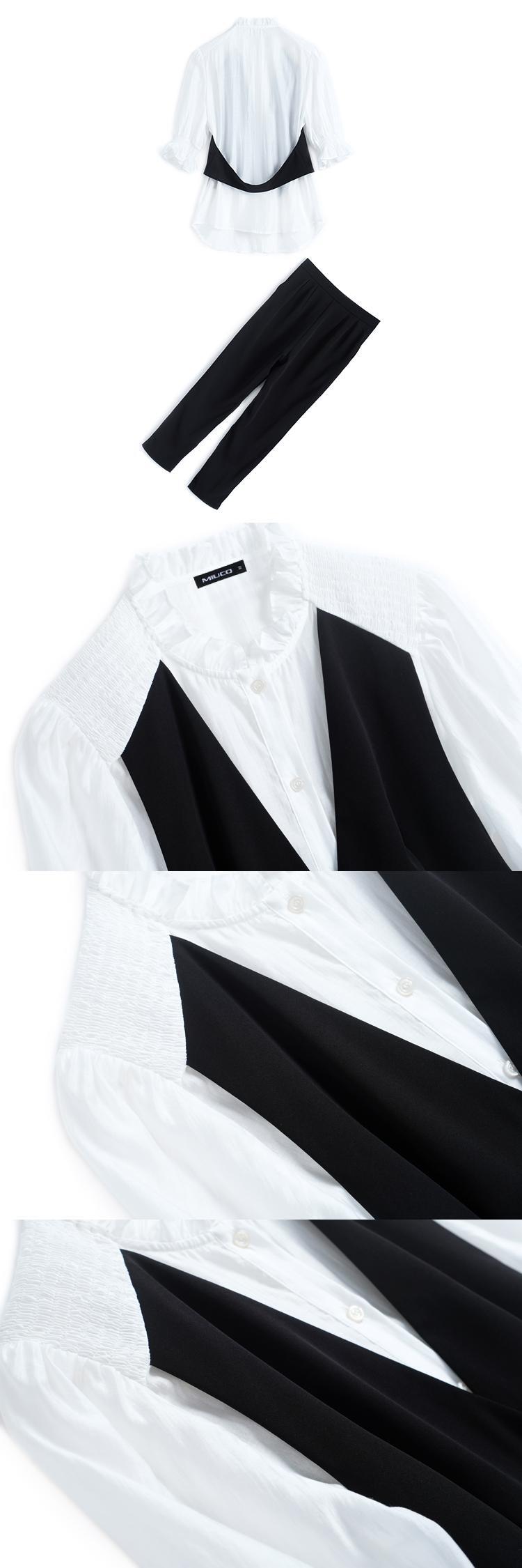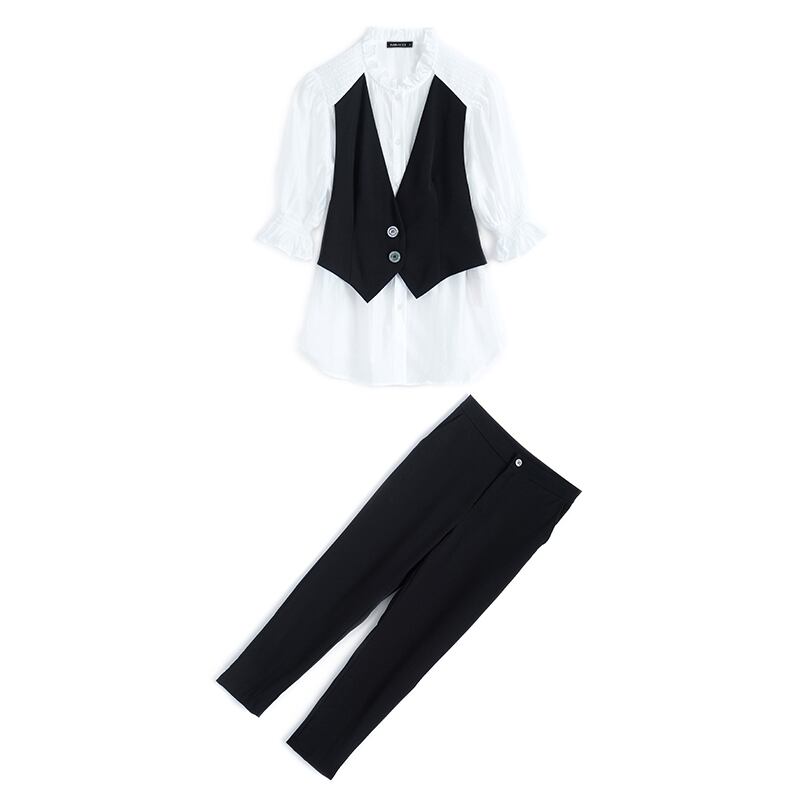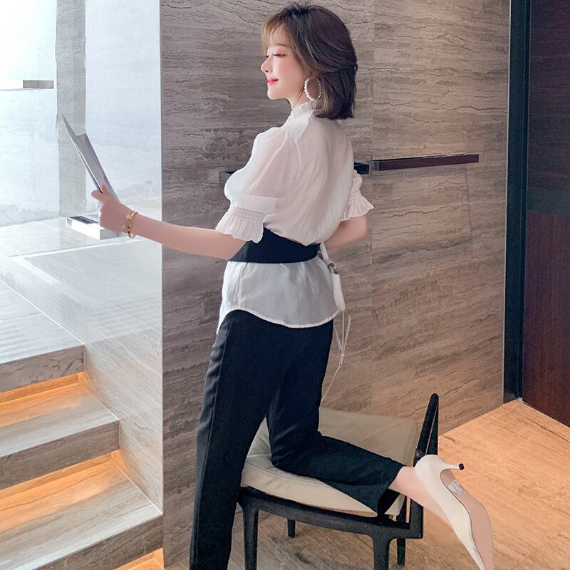 カラーシャツ ハイウェストウェストスリムパンツ サマー レース 夏物 ステッチ MIUCO22006496585