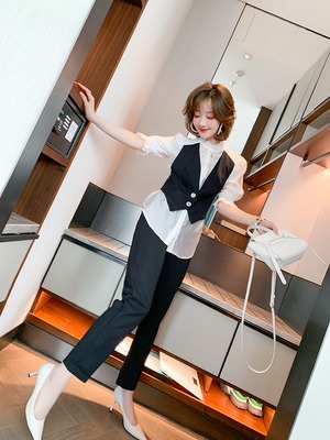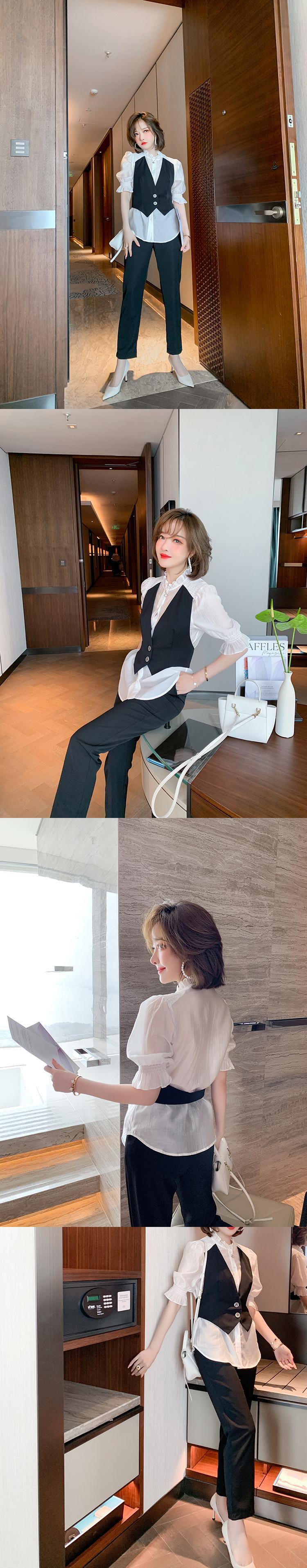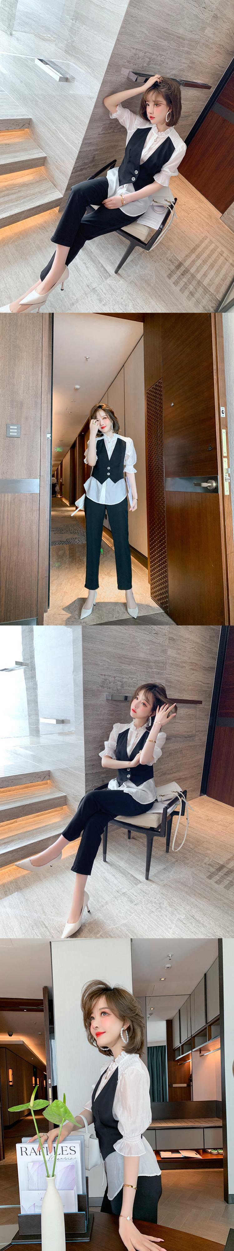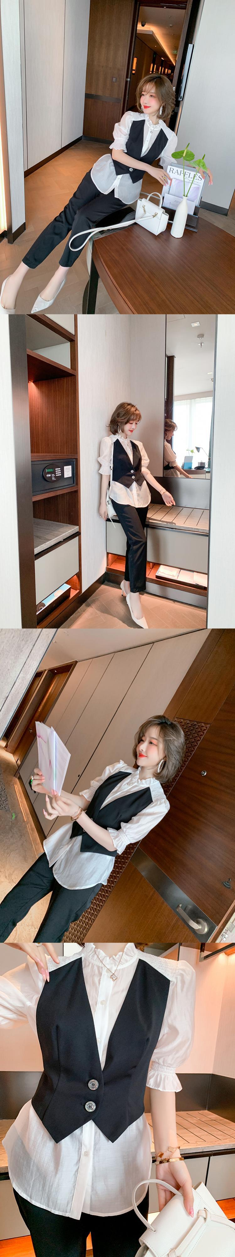 カラーシャツ ハイウェストウェストスリムパンツ サマー レース 夏物 ステッチ MIUCO22006496585