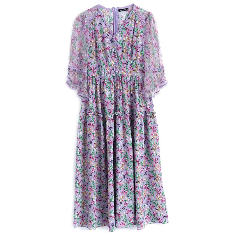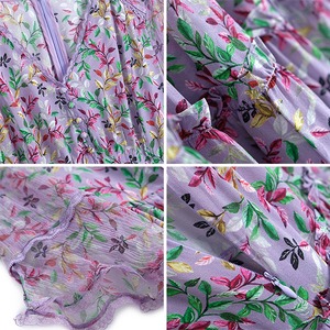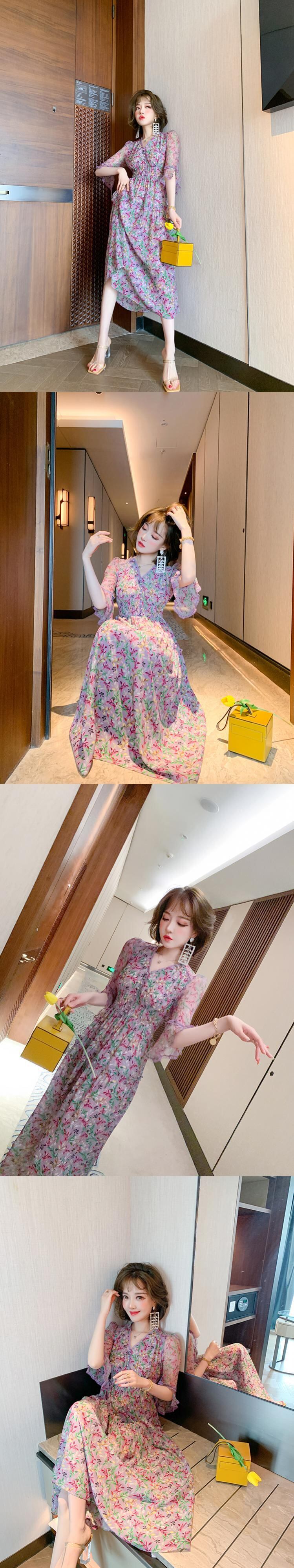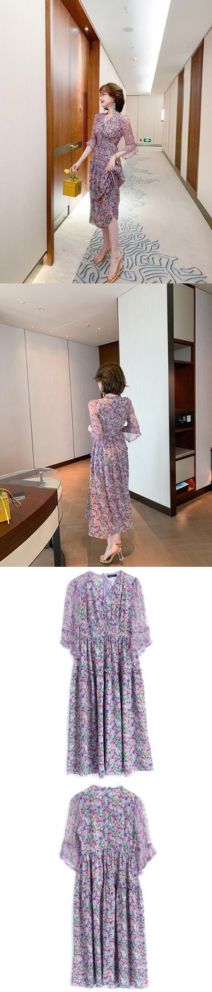 レースVネックウェストプリントスカート ドレス スプリングサマー レッド 春物 夏物 MIUCO4333719166