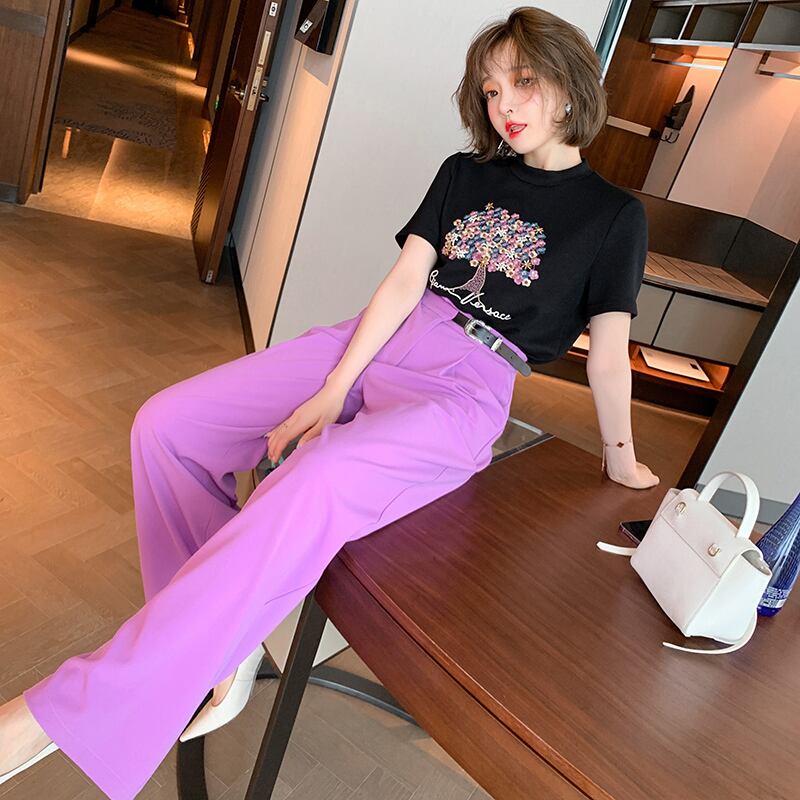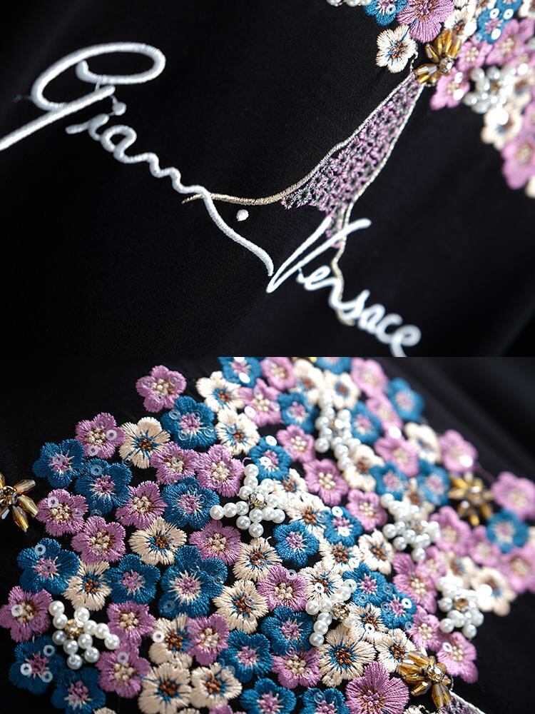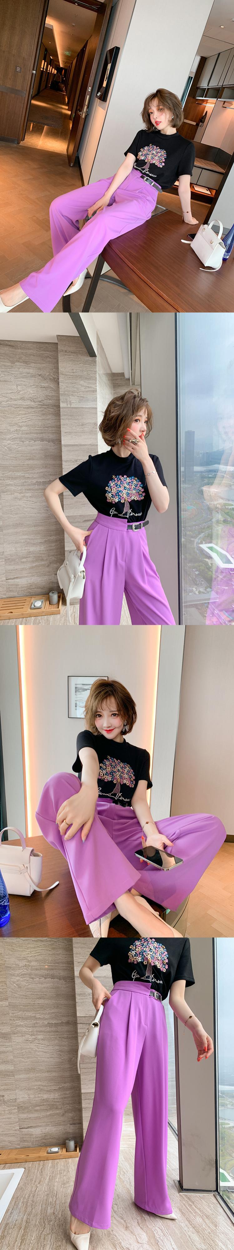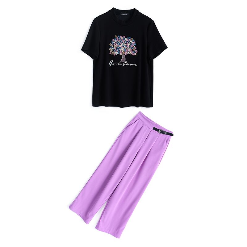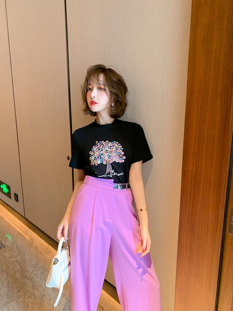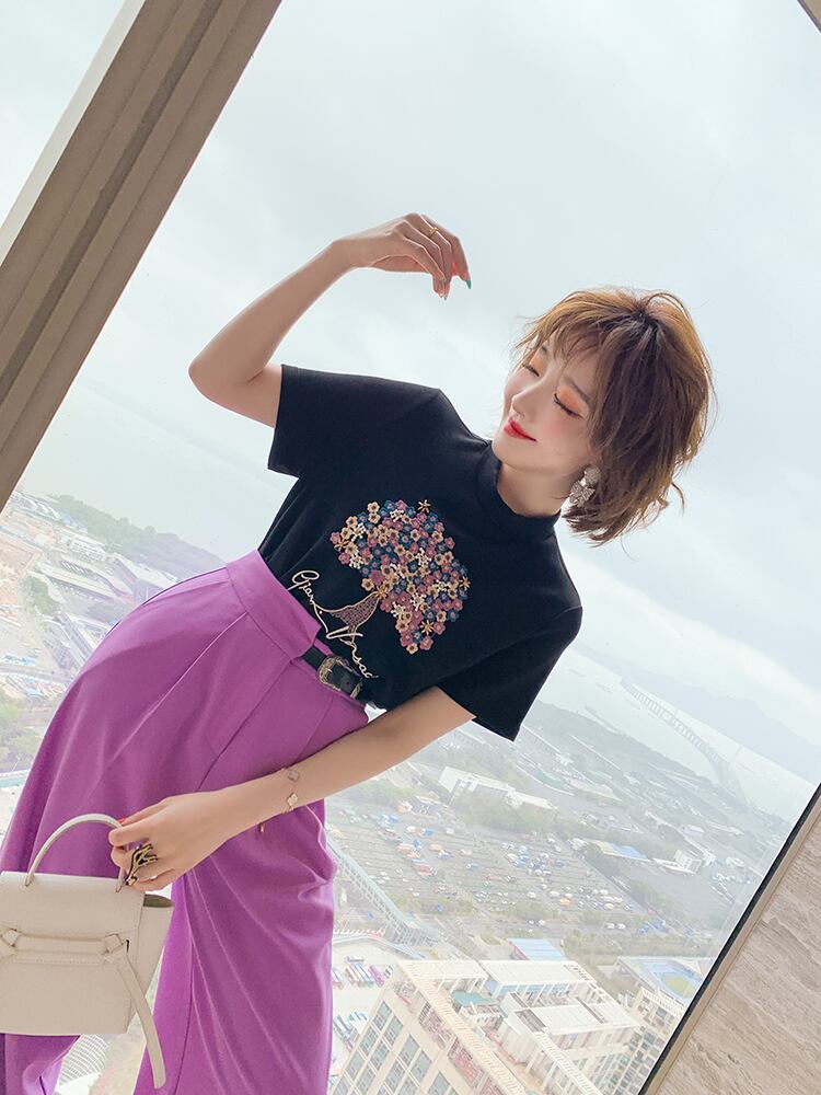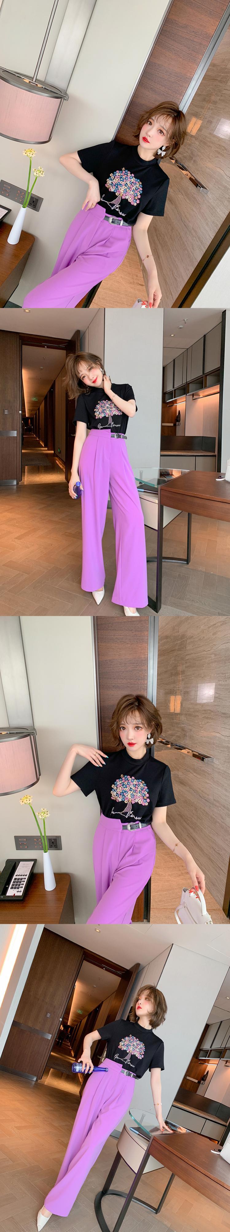 半袖スリーブTシャツ ウェストワイドレッグパンツ スプリング ショート レッド ハーフスリーブ 刺繍 春物 ワイドパンツ フラワーデザイン MIUCO15628754674