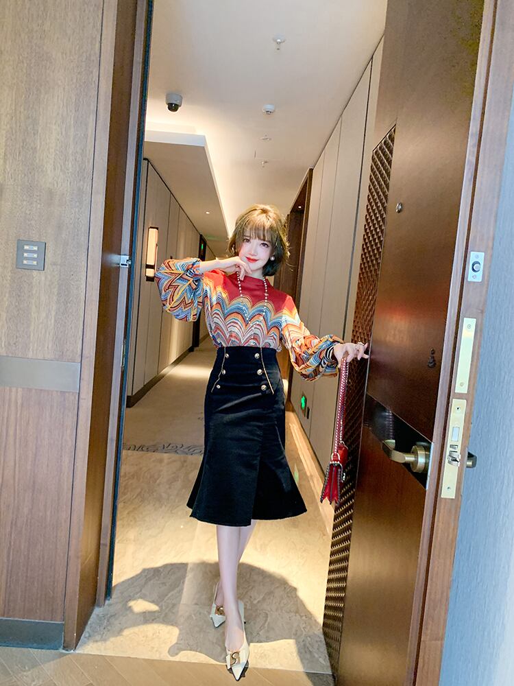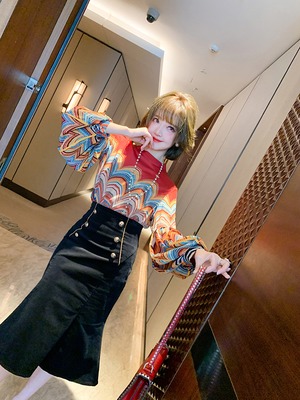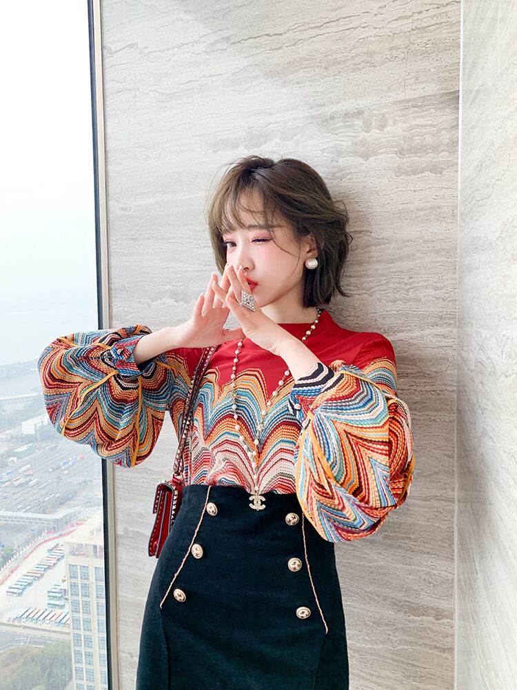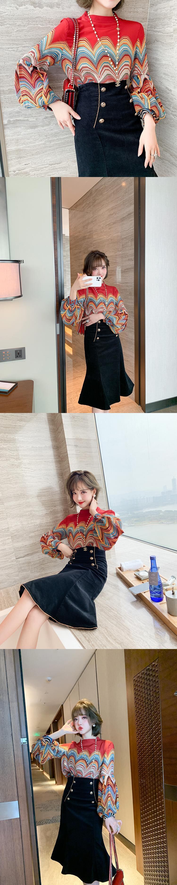 スタンダードカラープリント柄シャツ チェーン ボタンスカート スプリング レトロ 春物 MIUCO32546828414