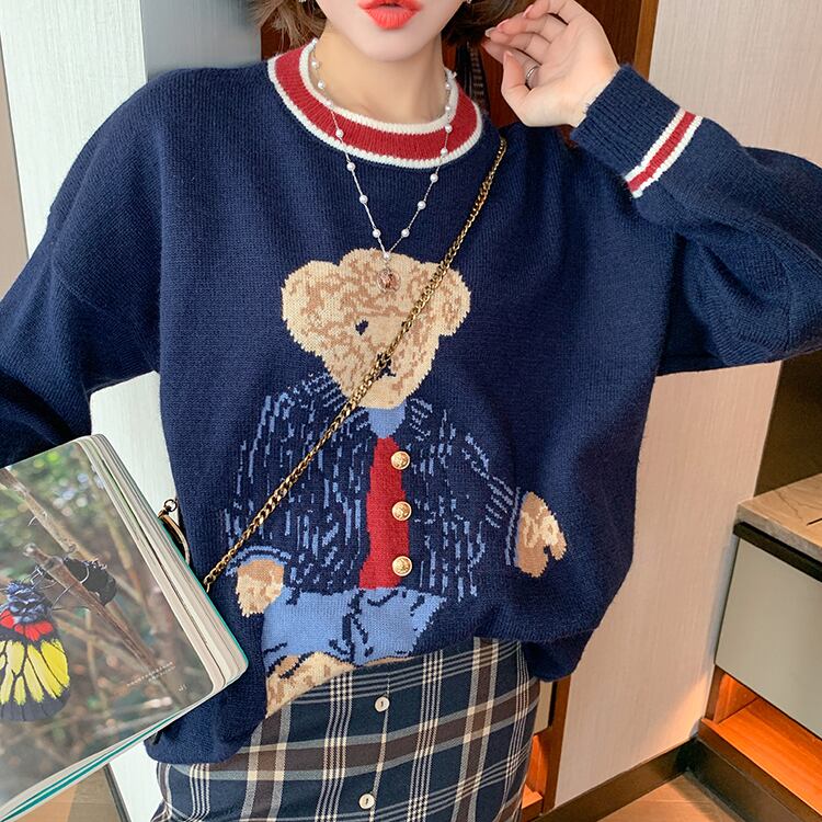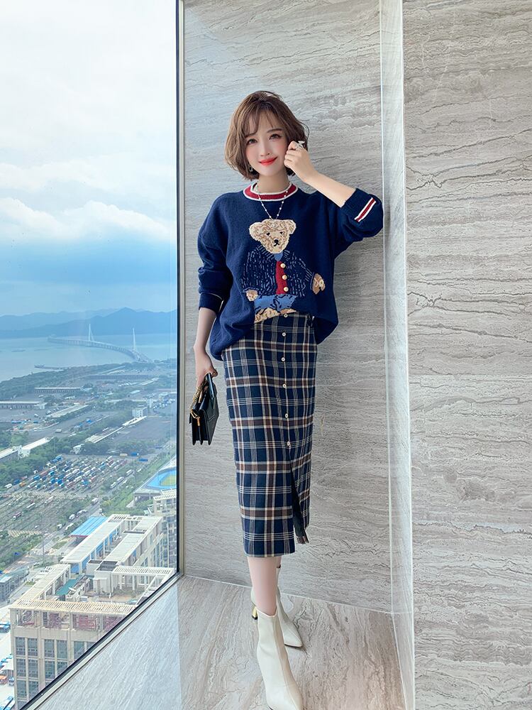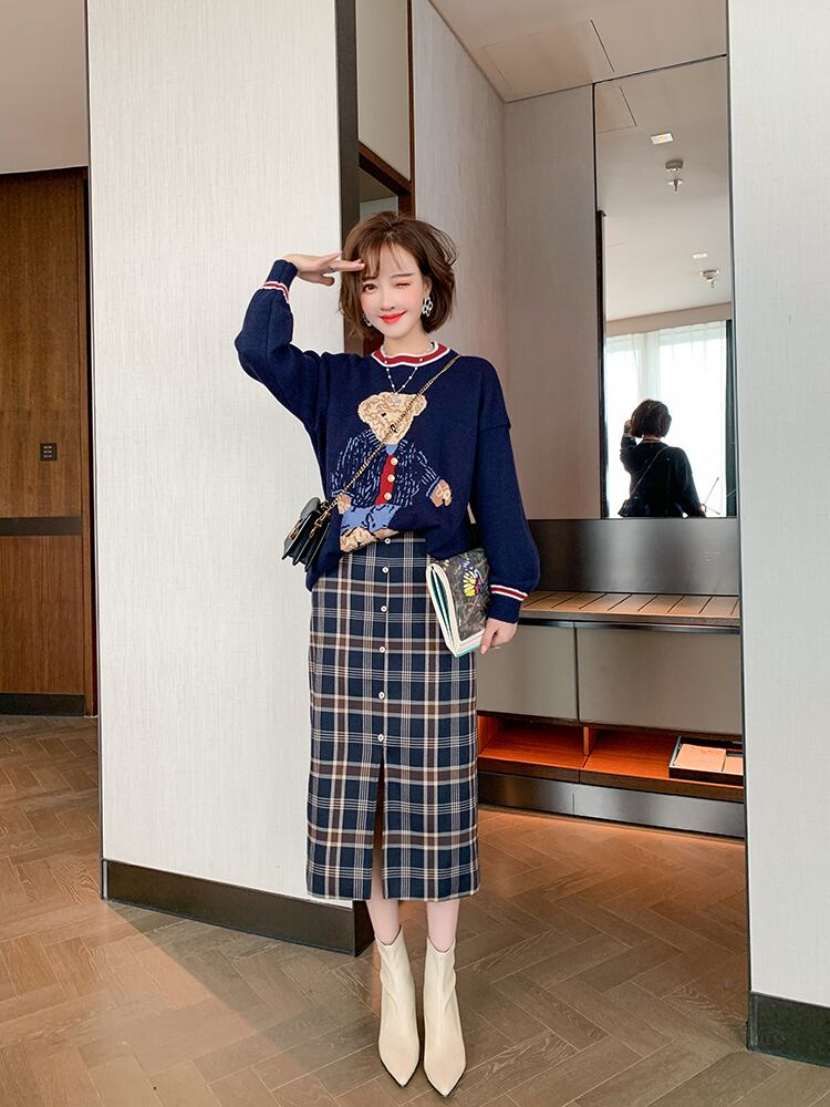 ラウンドネックニットセーター 格子柄スカート オータムウィンター 秋物 冬物 Oネック MIUCO71788197017