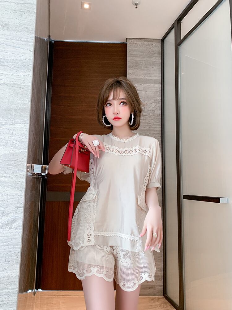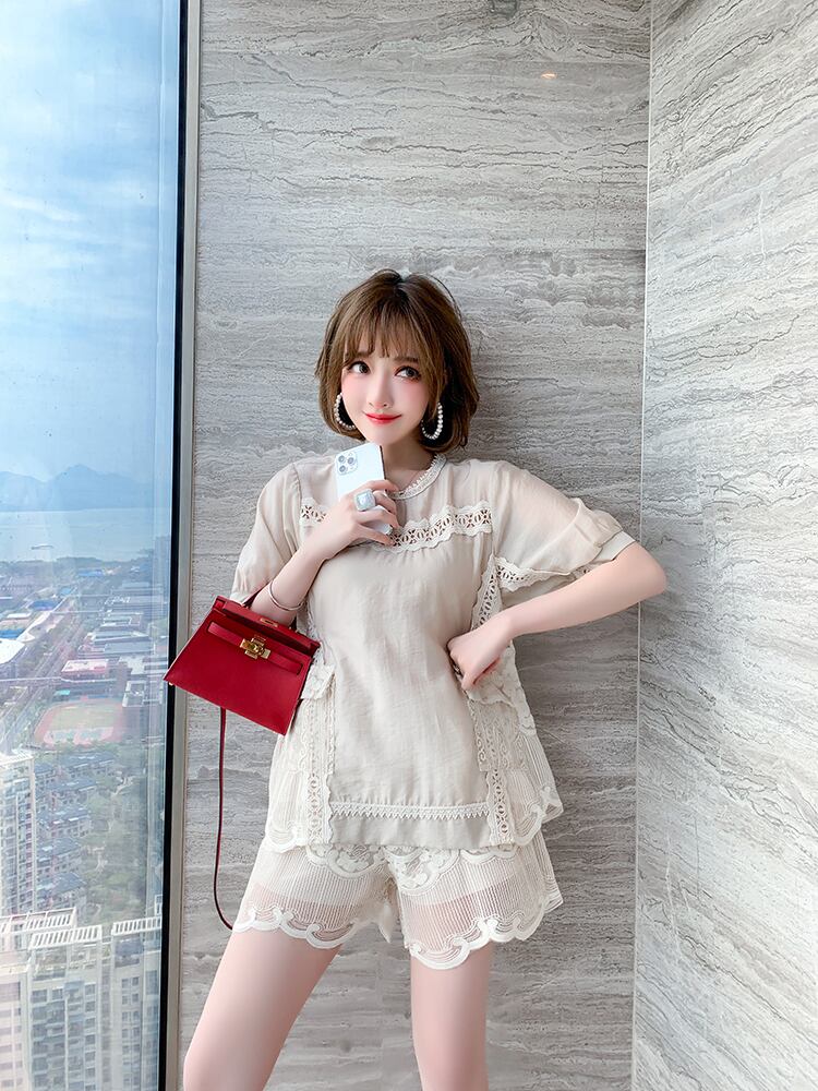 レースルーズシャツ ハイウェストウェストショーツ サマースタイル 夏物 ブルマー ステッチ MIUCO87945667557